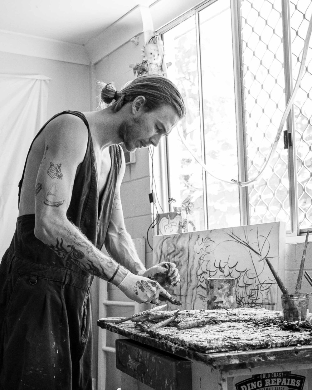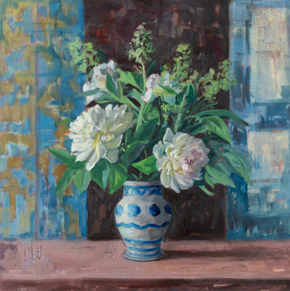 Harker's work centres on loosely held still-life arrangements: flowering stems, clustered blooms, and weighty vessels that appear to buckle slightly under the pressure of their own making.
