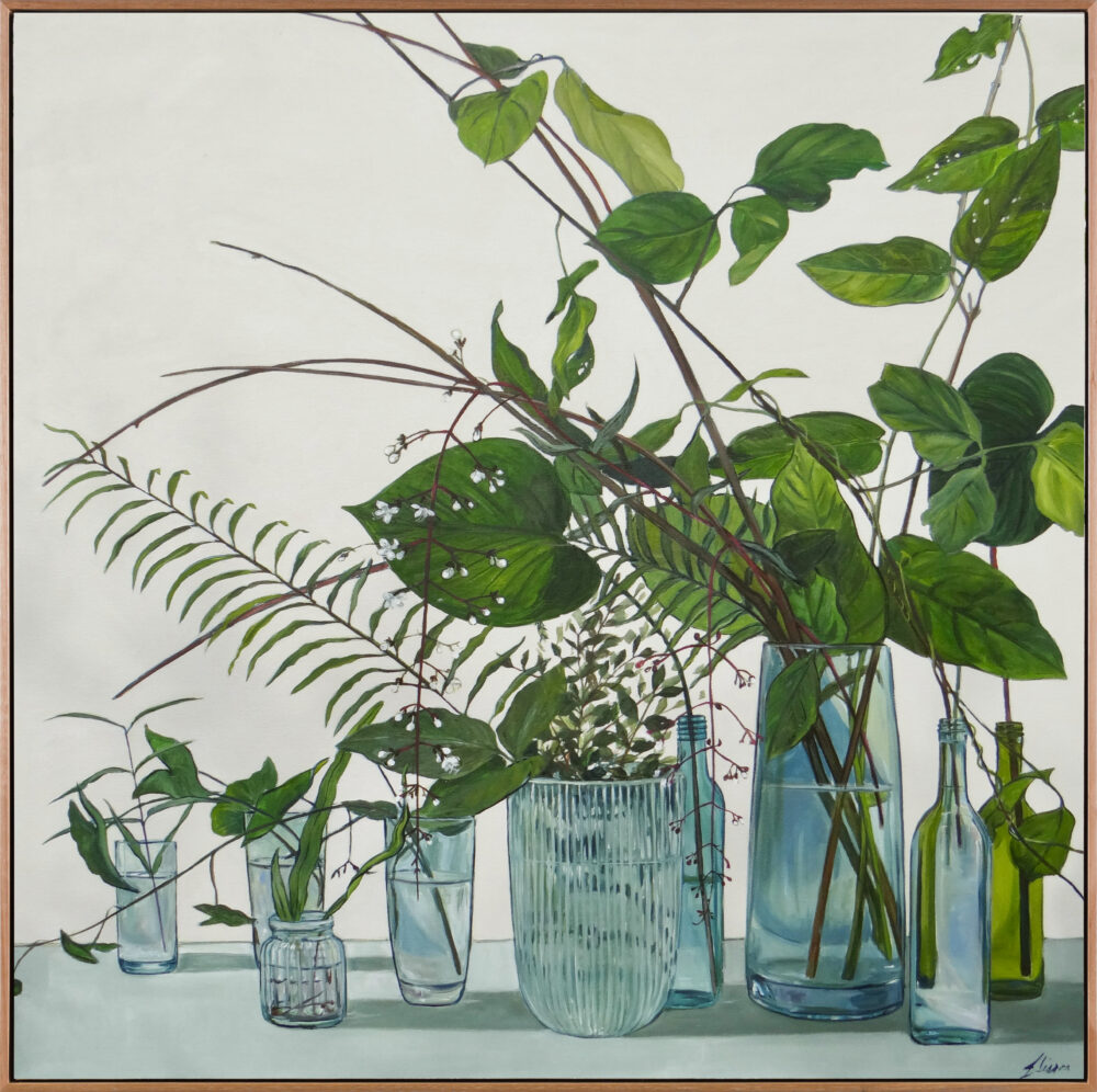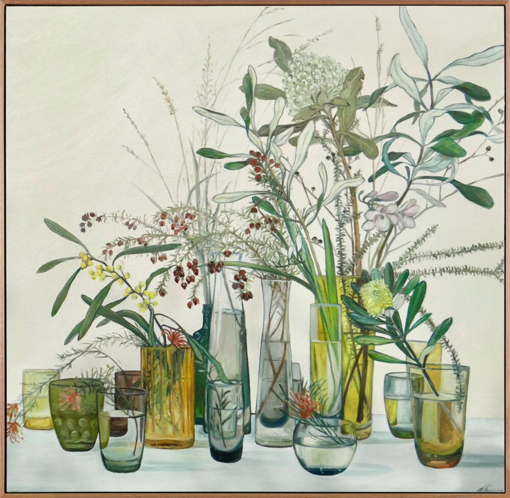 In my still life paintings I use plants from home and nearby parks and gardens. The glassware containers, portrayed in many of these still life paintings, are part of a large collection sourced from op shops. When arranging still life compositions I consider height, form and light.