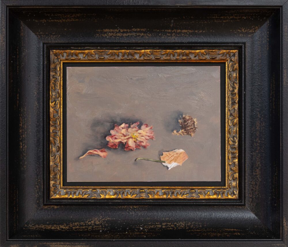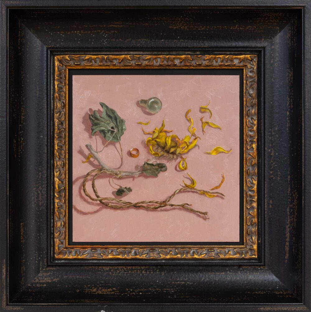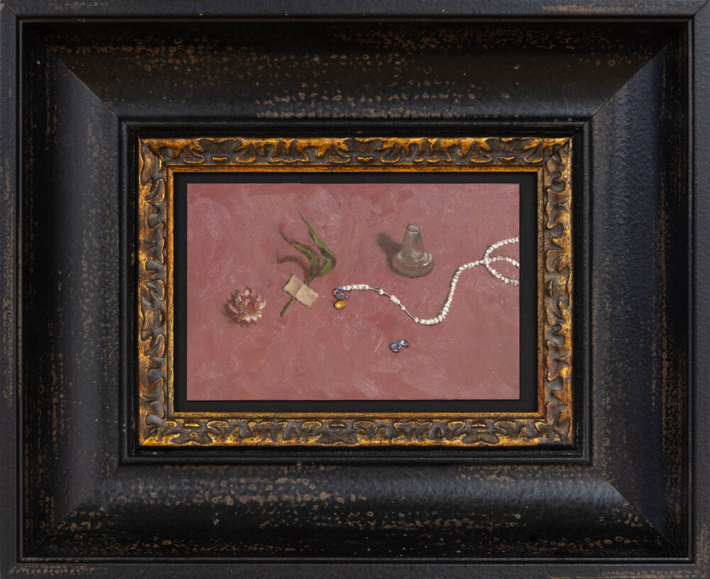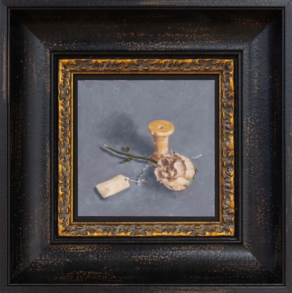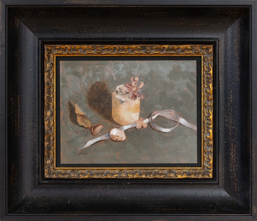 Beynon’s attention settles on the things usually ignored: flowers past their prime, bruised fruit, forgotten labels, battered tins. Arranged with the precision of a stage director, these objects become actors, suggesting the unfolding of a scene. Tiny pearls, a twist of cord, and a desiccated bloom together evoke a narrative half-remembered, a modest relic of passing time.