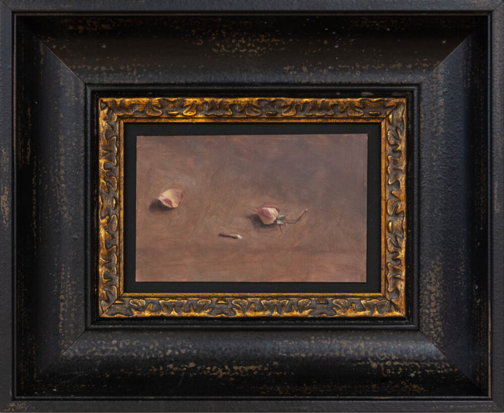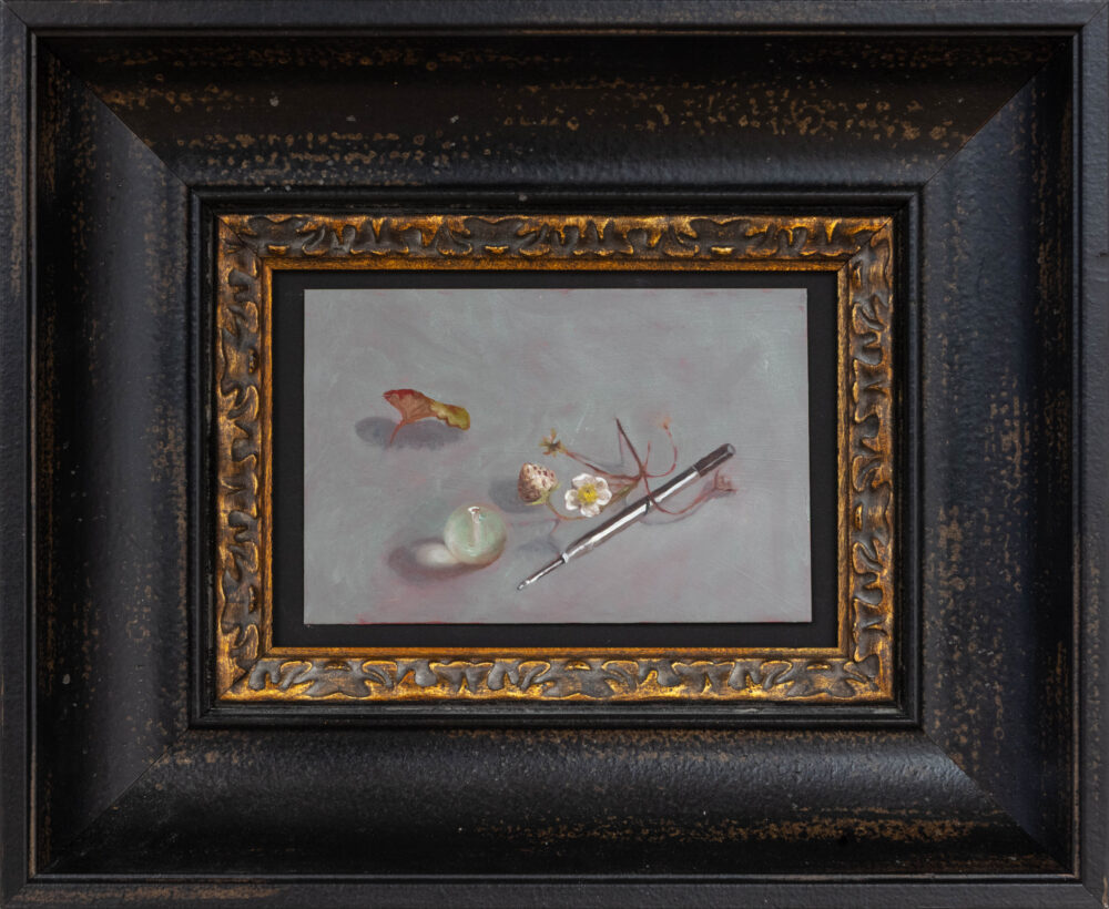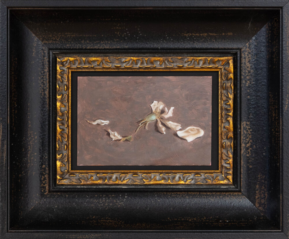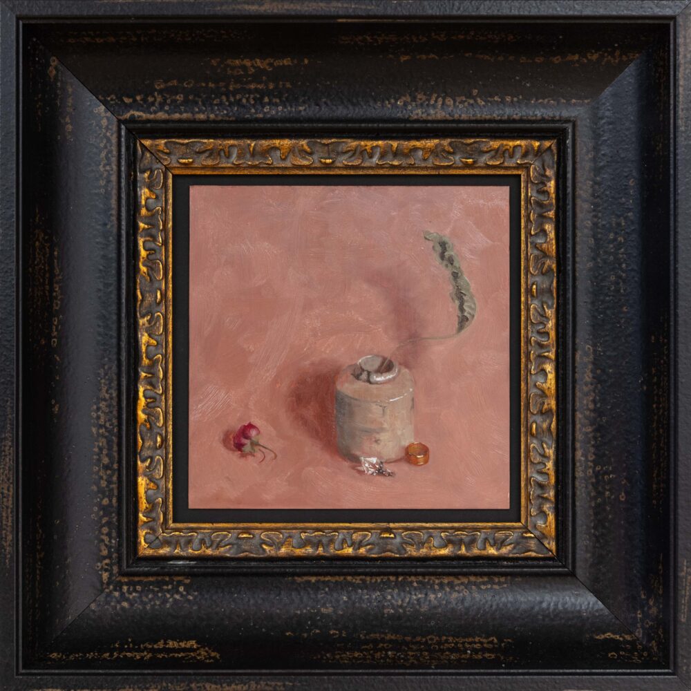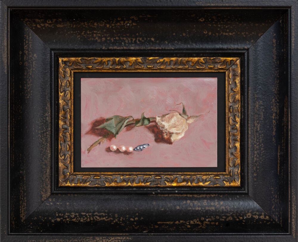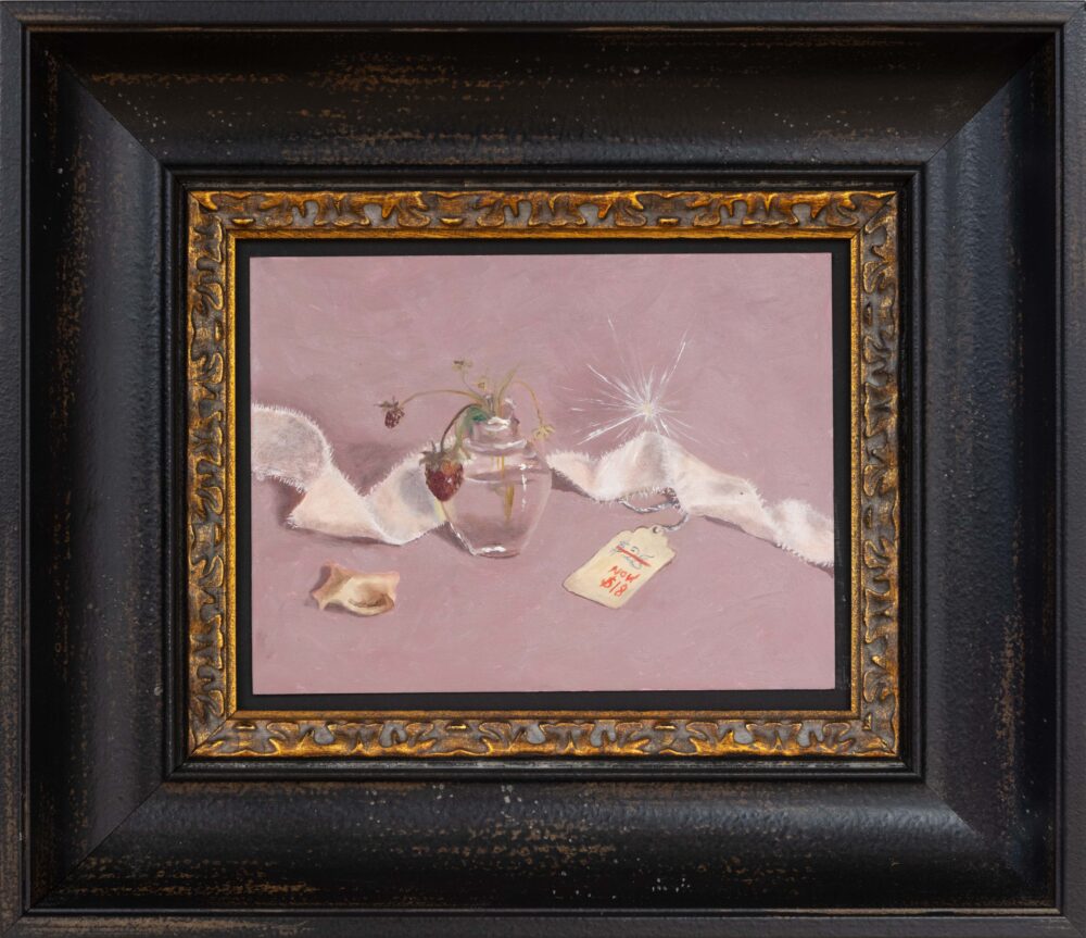 Beynon’s attention settles on the things usually ignored: flowers past their prime, bruised fruit, forgotten labels, battered tins. Arranged with the precision of a stage director, these objects become actors, suggesting the unfolding of a scene. Tiny pearls, a twist of cord, and a desiccated bloom together evoke a narrative half-remembered, a modest relic of passing time.
