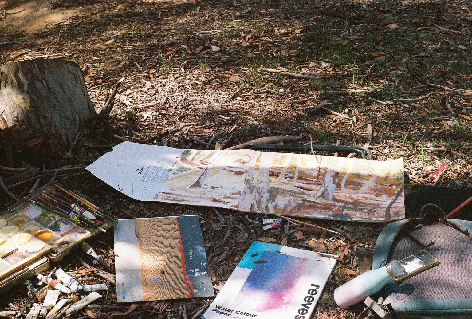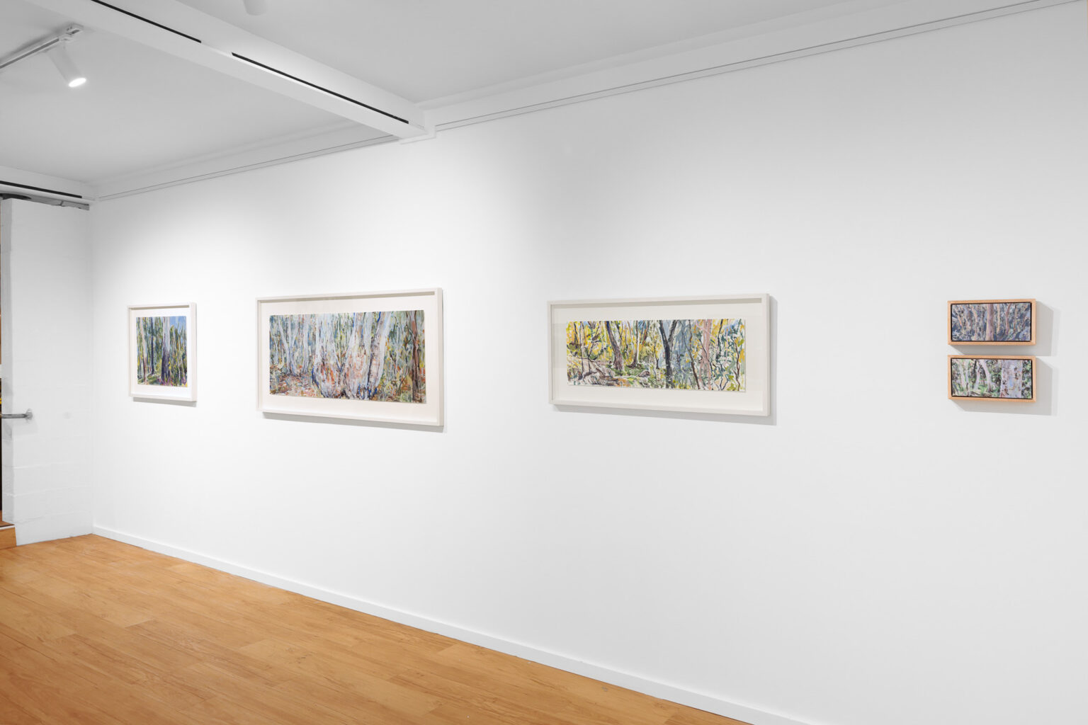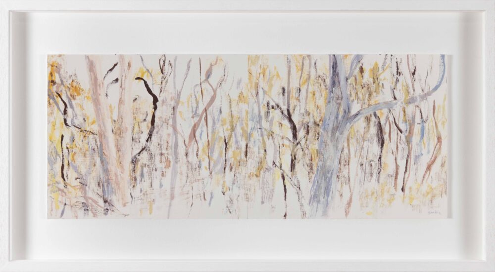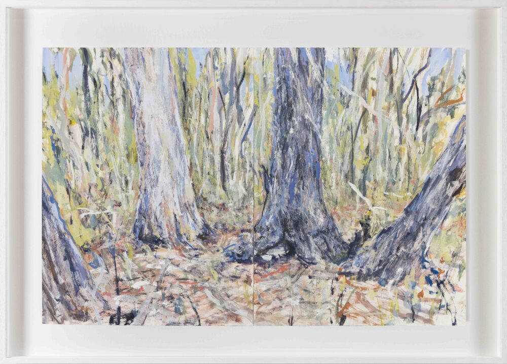 Her work explores the sensory impressions of the landscape—the buzzing soundscape, thick hazy light, and rugged textures—translating them into a not-quite-abstract pictorial form. Silvery ghost gums, bursts of green, blue, ochre, and pink all collide in her compositions, reflecting the vitality and flux of the environments she paints.
