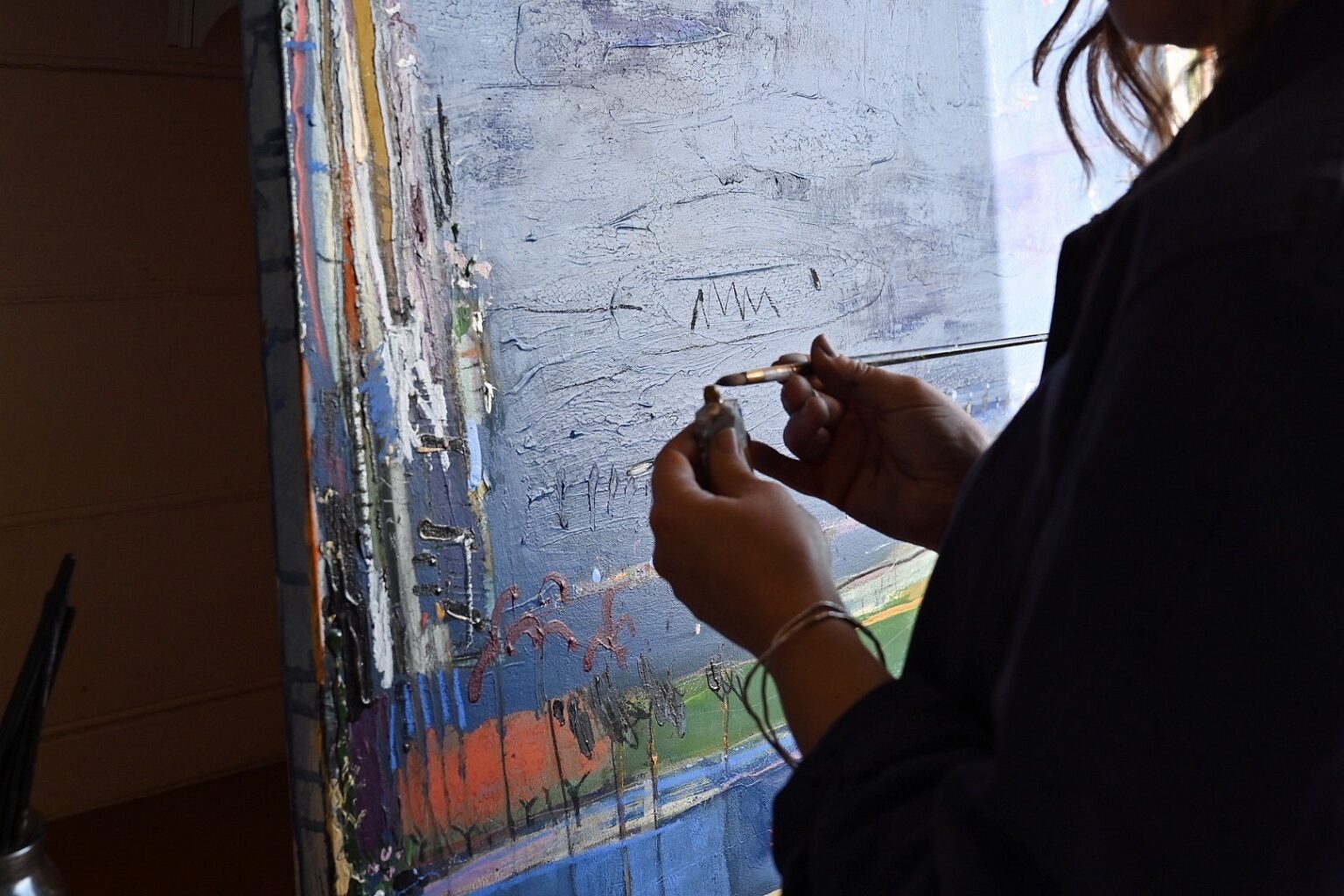 I cannot see the scene until the colour arrives like a memory, one hue leading to the next, and something begins to cohere. The painting reveals itself in this way, like a puzzle slowly connecting, and I begin to recognise moments absorbed in stillness and noticing: the beauty of a detail; light falling on a petal, the moon awake in the day, a strange breeze making the trees whisper.