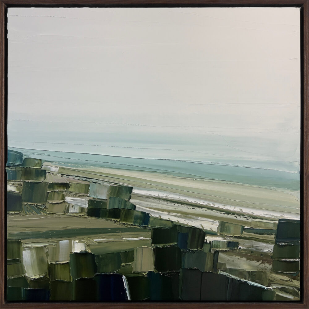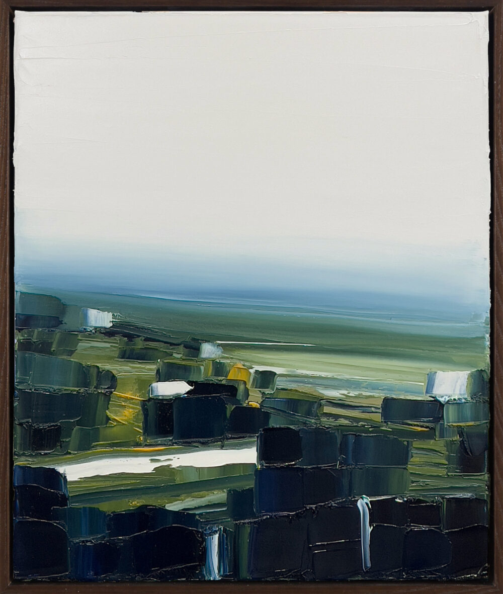 From a distance, Mrmacovski’s abstract landscapes appear dynamic yet composed, their forms suggesting horizons, weather systems, or the organic rhythms of nature. But it is only when one steps closer that the true complexity of her process is revealed. Her use of impasto – the technique of applying thick, textured layers of paint – transforms the canvas into a terrain of intricate peaks and valleys. The surface becomes almost sculptural, the paint whipped and sliced into place with a confidence that belies its apparent chaos.