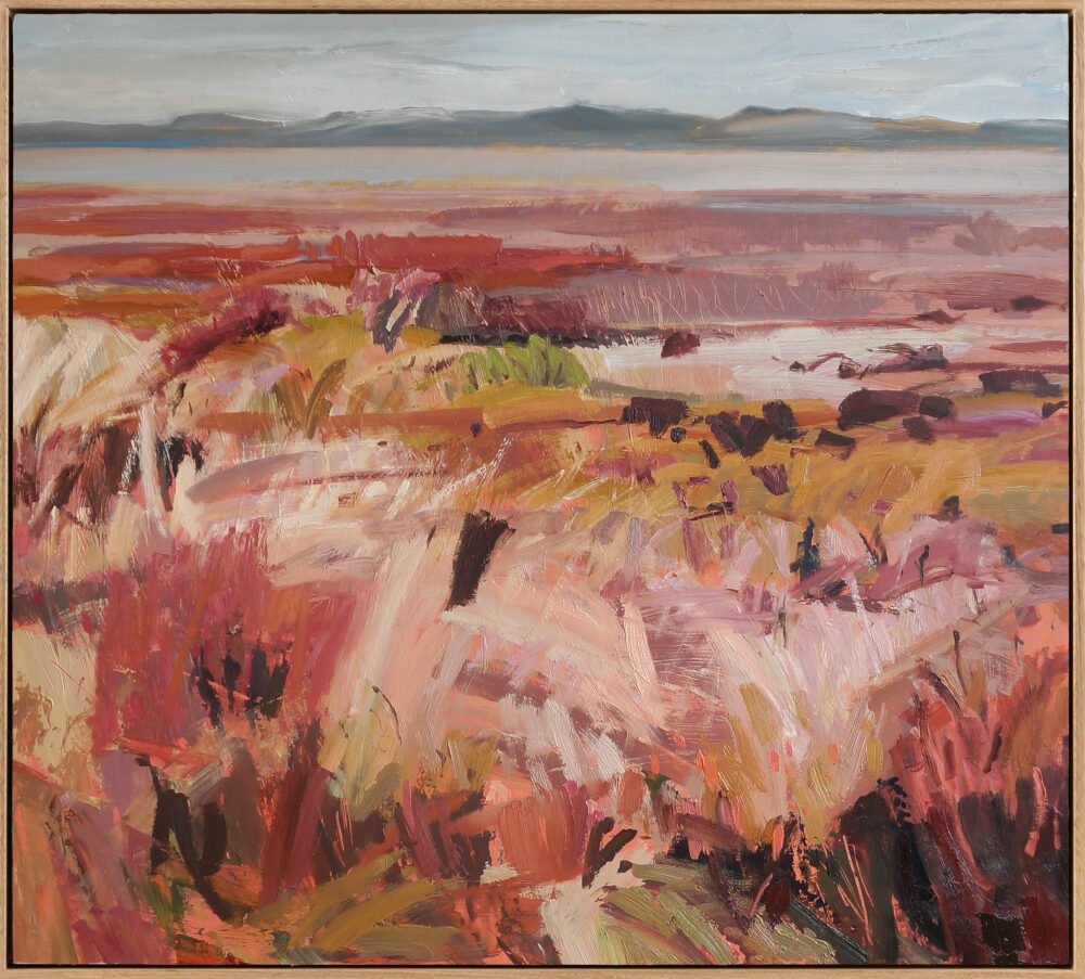 Rooted in the wild, windswept landscapes of South Australia’s coastal and rural terrain, Suzie Riley’s ‘Familiar Ground’ is a lyrical reckoning with place. Each of Riley’s four oil on board paintings channels the textures of a world she knows deeply: salt-stung headlands, scrub-dappled hills, and the mutable light that sweeps across both sea and soil.