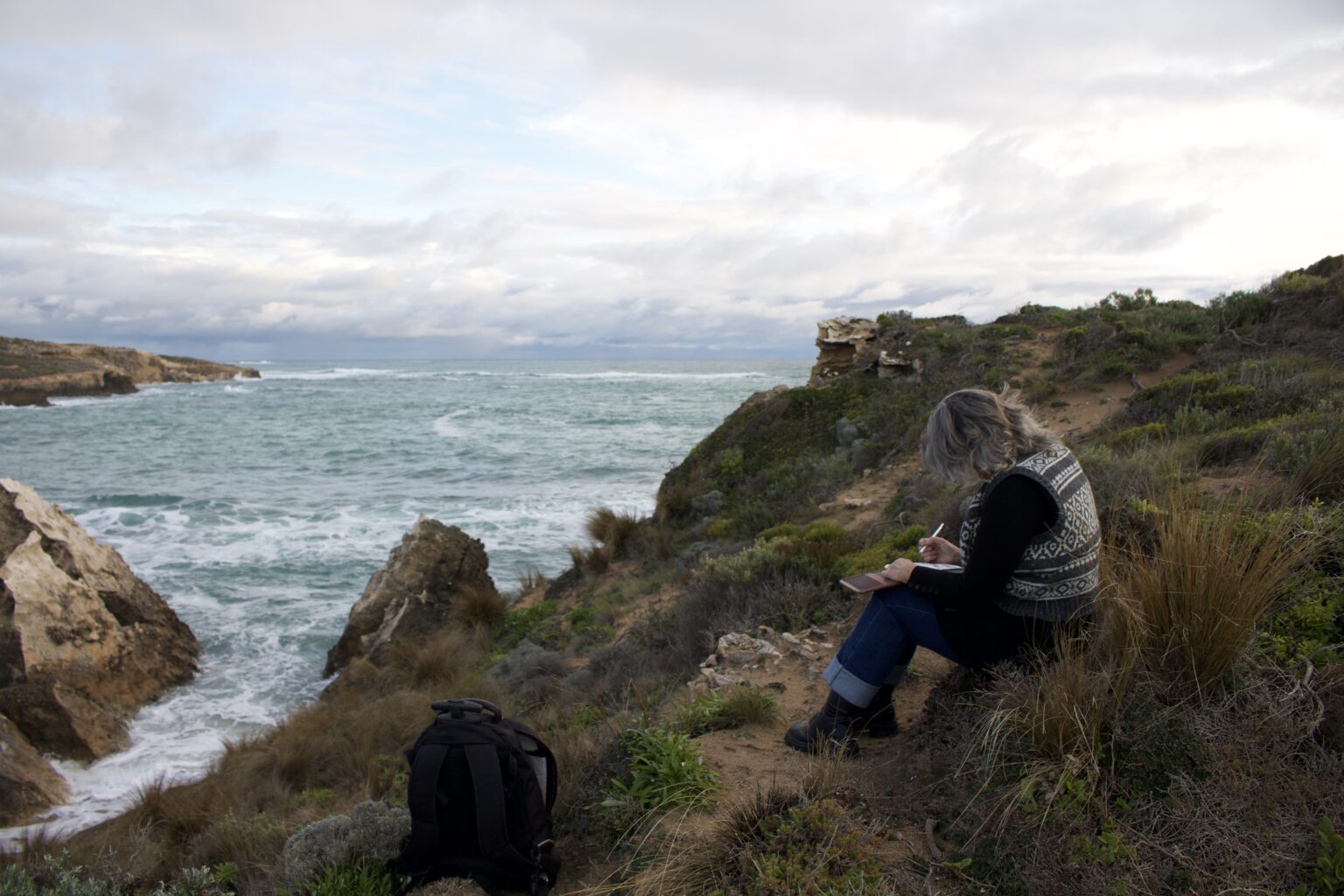 Raised on a farm in the South East and shaped by summers spent in a converted double-decker bus–turned–beach shack, Riley’s practice is inseparable from her environment. Now based on the Fleurieu Peninsula, she walks daily with a sketchbook, using this time to observe the landscape. “It provides an opportunity for me to notice seasonal changes, patterns of foliage, or sunlight and shadow,” she says. “I watch the weather like a hawk and mark the best spots to come back and paint, using pastel or gouache to make quick studies.”