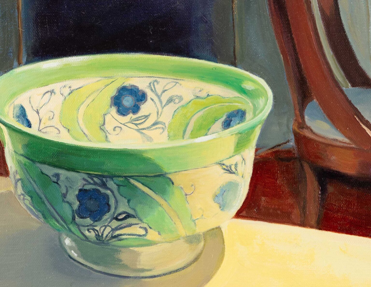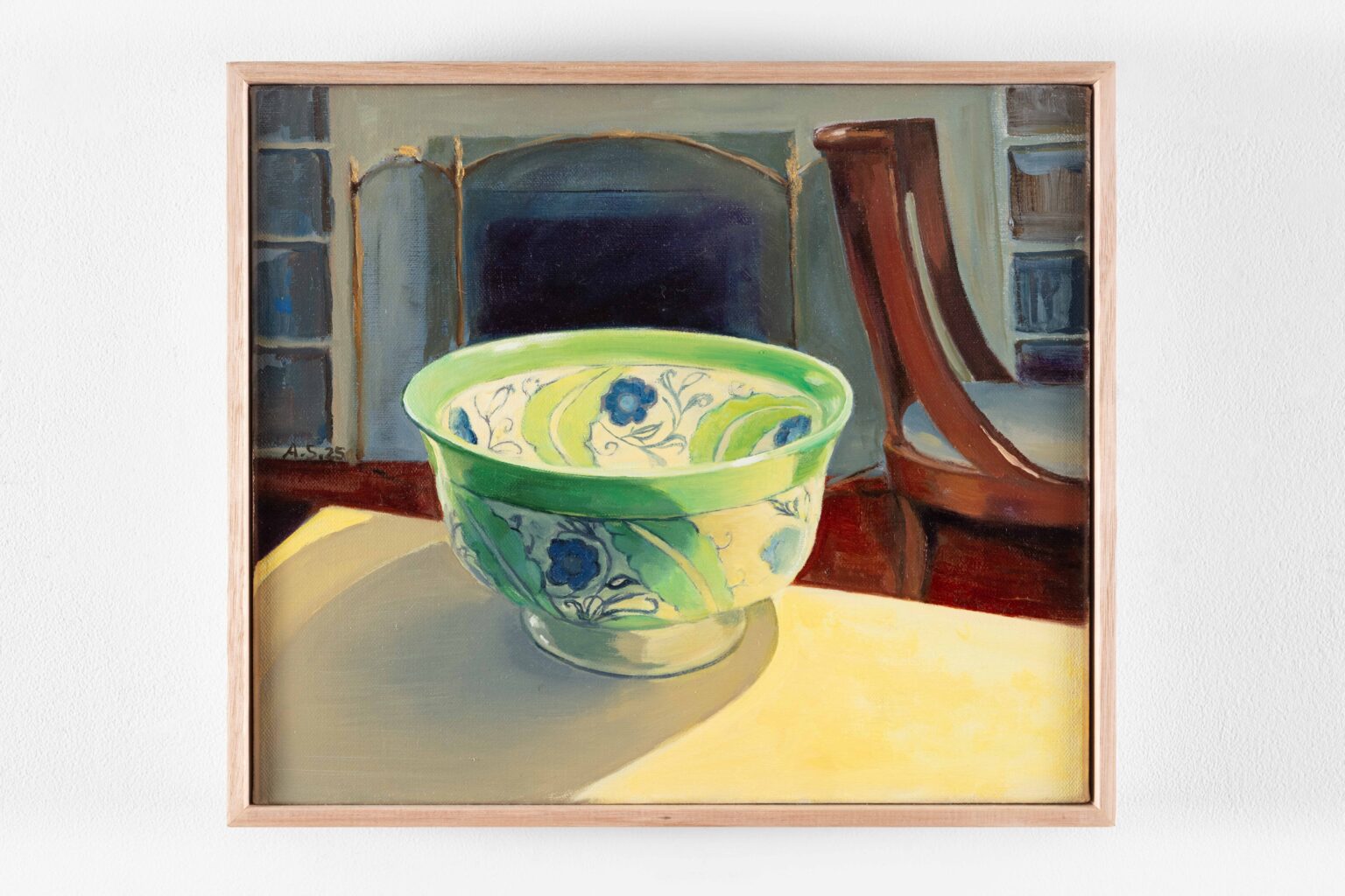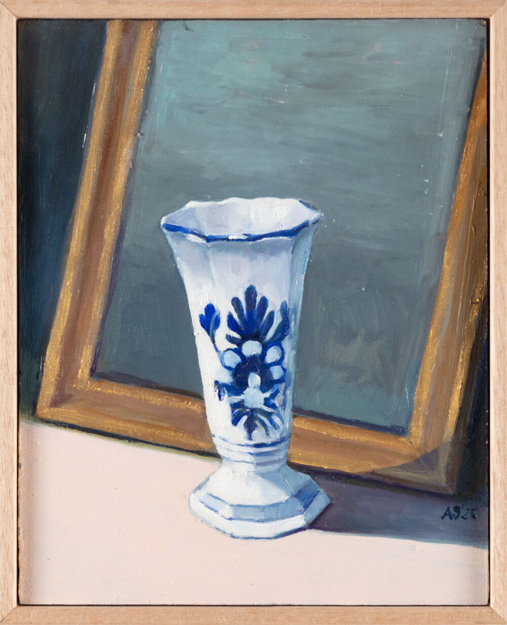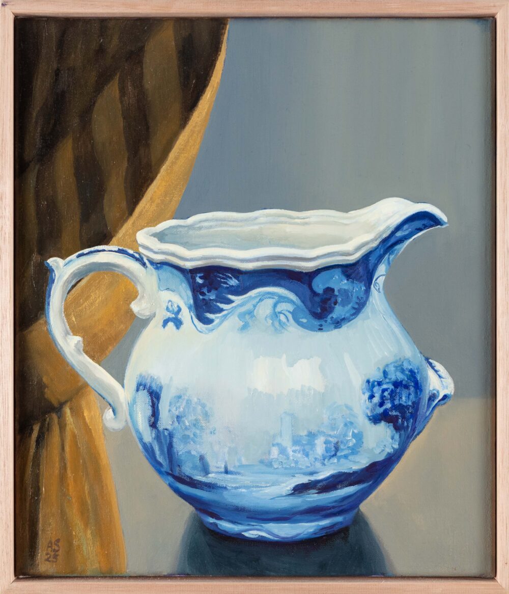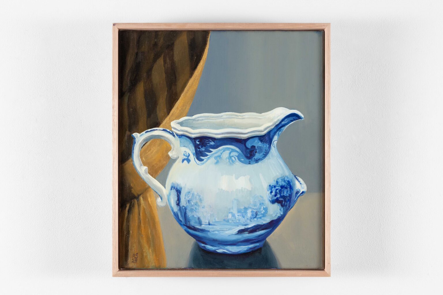 Two works, ‘Not in the Picture’ and ‘Revealed’, feature vessels decorated in blue and white motifs traditionally associated with funerals, death and mourning in Chinese culture. This symbolism sits in neat alignment with still life’s historical relationship to mortality, and with the larger theme of grief within the suite. These elements became newly compelling in Swan’s practice following two life-altering experiences: the recent arrival of a daughter-in-law of Chinese ancestry, and, some years earlier, the death of her own daughter — a loss that precipitated a long and brutal journey of grief. In these paintings, the cultural and the deeply personal converge.
