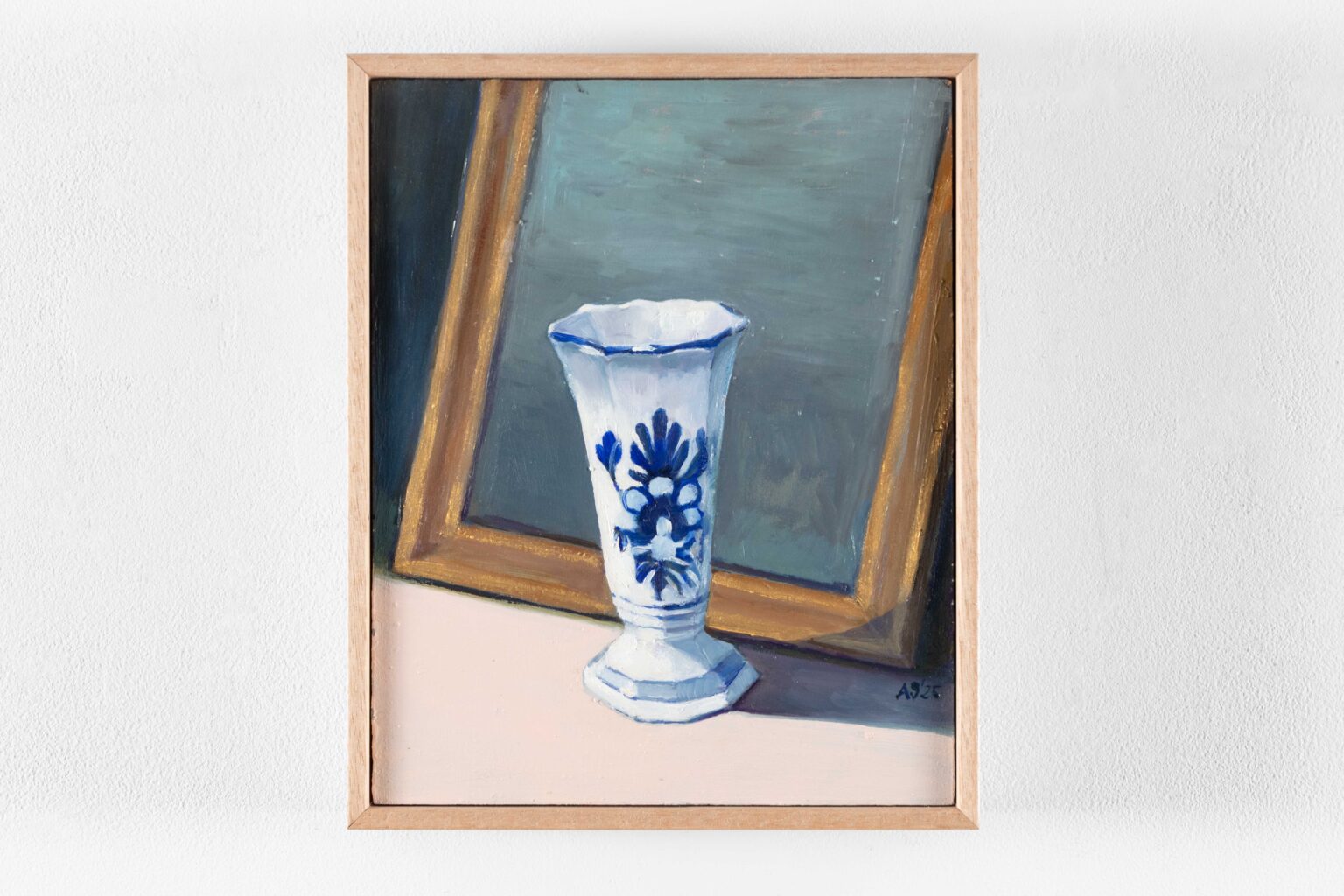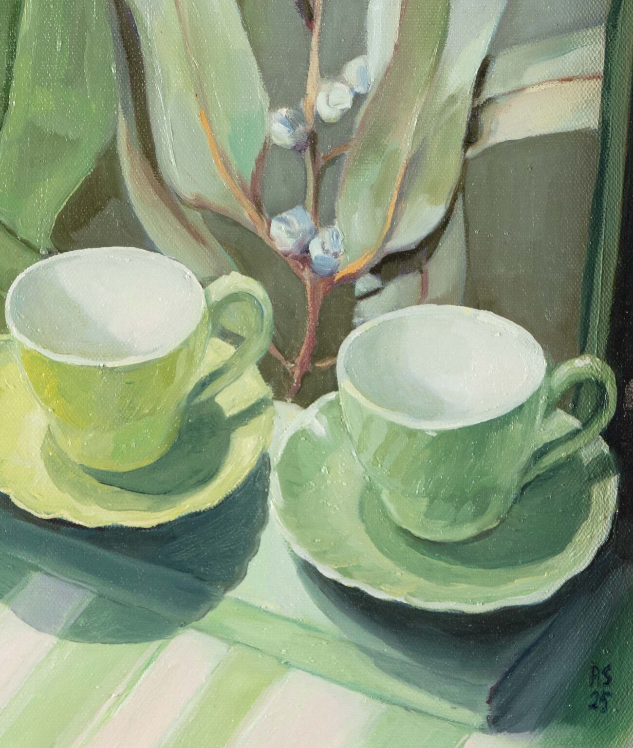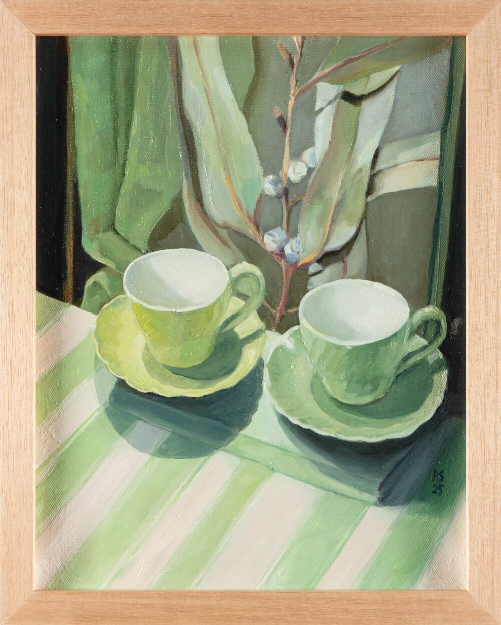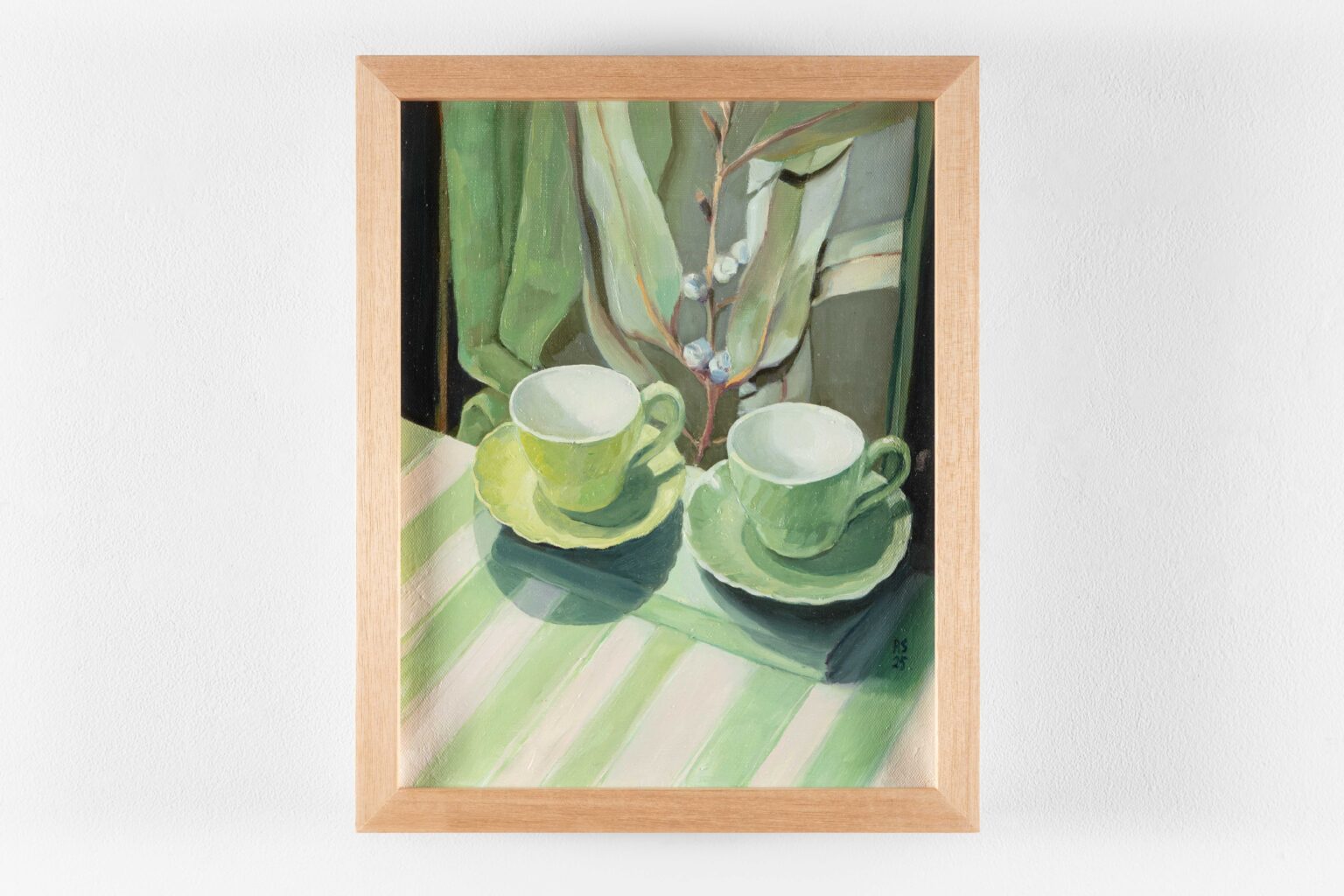 Each work here centres on a vessel — cups, a vase, a jug, a bowl — a motif that since antiquity has carried metaphorical weight, touching on ideas of literal and figurative containment and the human impulse to keep or hold.