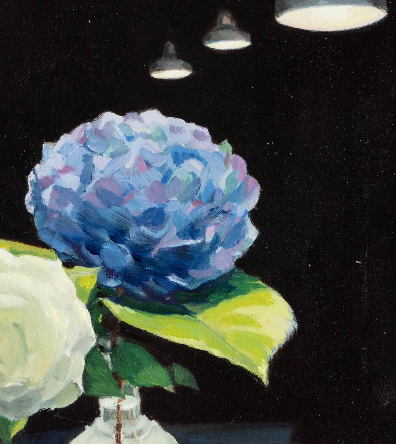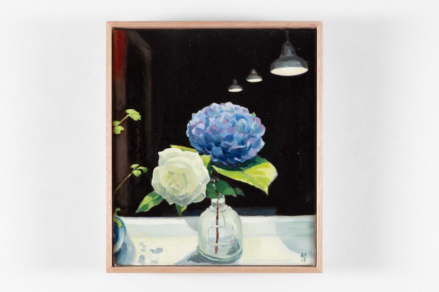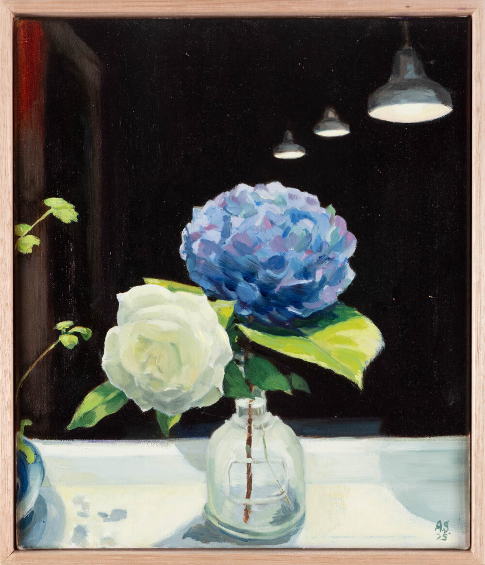 ‘Kitchen Sill (after Hopper)’ may appear, at first glance, to depict a simple domestic interior, yet its composition carries a more philosophical charge. The velvety darkness outside, the bright white sill, and the pendant lights reflected in the glass recall the haunting sensibility of Edward Hopper’s Automat. The window becomes a threshold: a meeting point of dark and light. The reflected lights appear to move from the interior into the night, piercing both the window pane and the picture plane as they recede like a row of distant streetlamps. As ever, the window is an ‘eye’ that sees, and the view it frames echoes the act of painting itself.