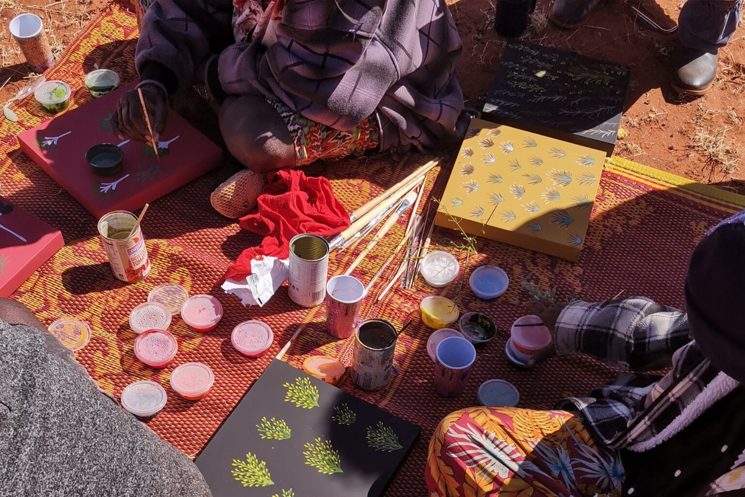 Our Berrima and Eora/Sydney galleries’ concurrent presentations of the Singer Sisters’ new suite of paintings – titled ‘Tali Ngura Wiru – Beautiful Sandhill Country’ as a tribute to the rocky desert country of Indulkana, where Iwantja is sited – celebrate the cross-generational sharing of cultural knowledge, stories and practices grounded in Country and kinship that is the animating force in their art-making.