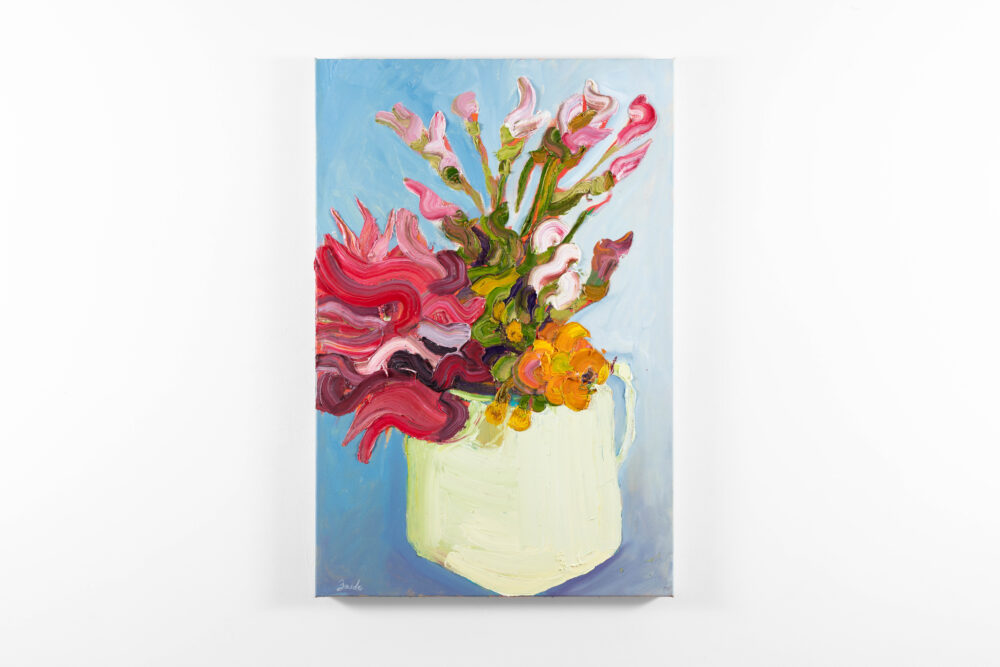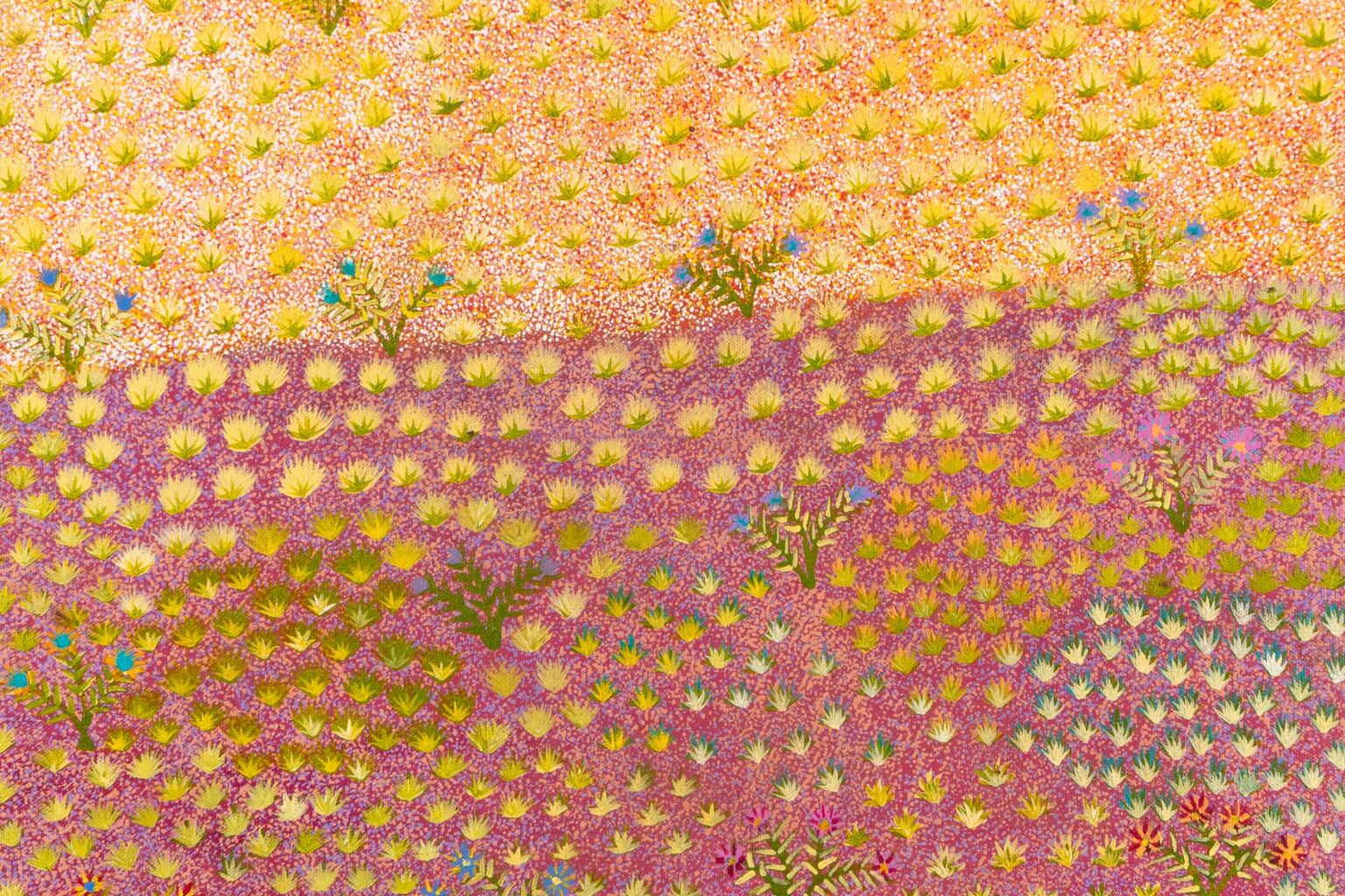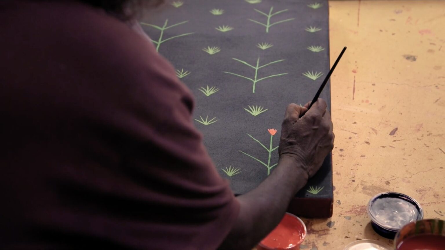 Singer’s practice honours personal and cultural connections to place, carrying forward stories and lessons passed down through family and community. “There’s a lot of my mum in my work – what she liked and what she taught me,” says the artist. “I like looking at different flowers and going on Country, getting the knowledge of the land and the story passed on from grandparents … When you travel, you see the changes in the land. It comes alive.”