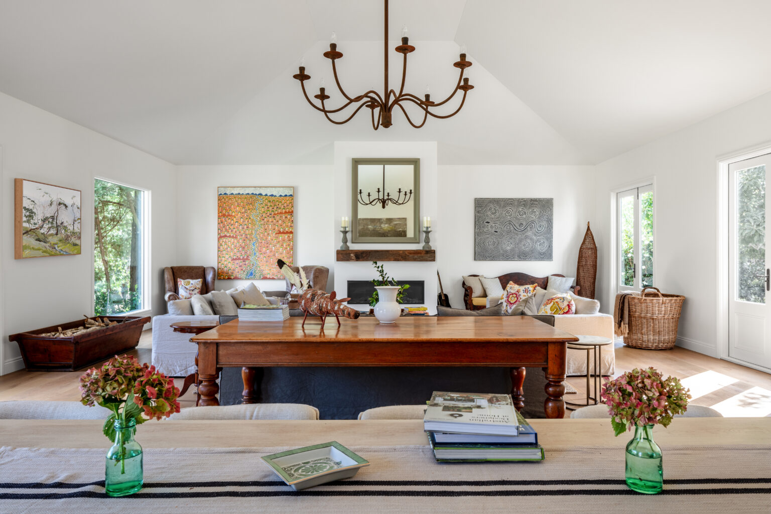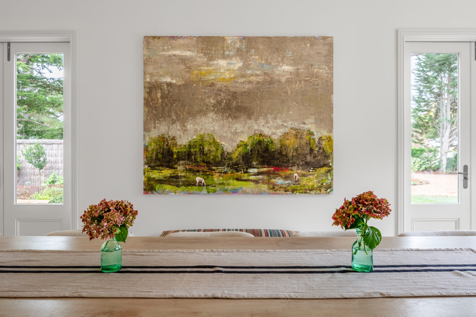 Anchoring the space, a Lucy Vader landscape ties the length of the dining table to the horizon beyond — one grand horizontal meeting another.