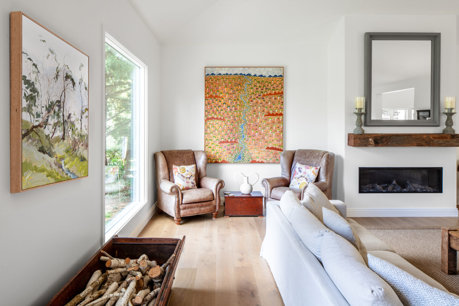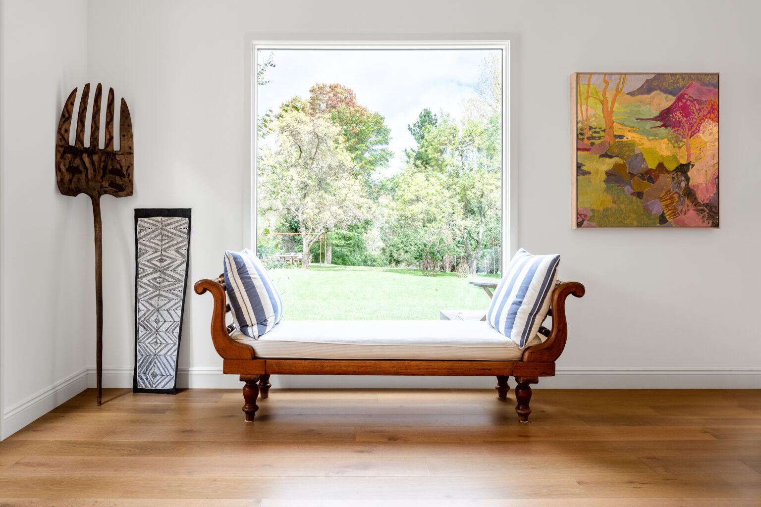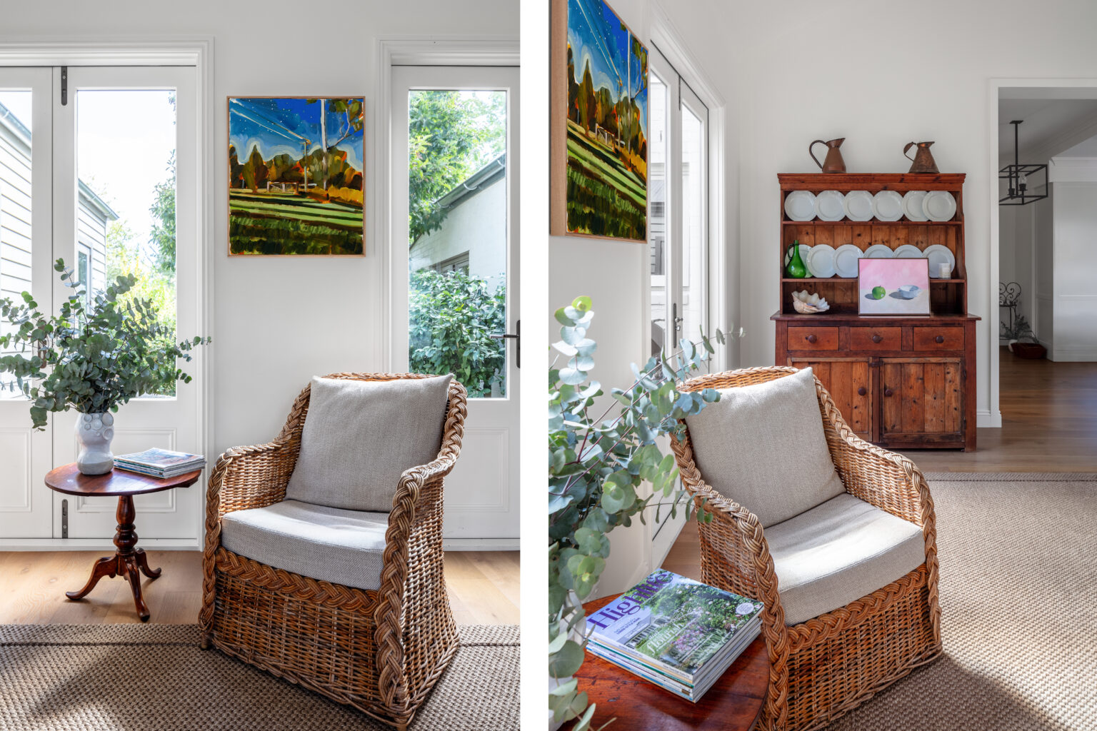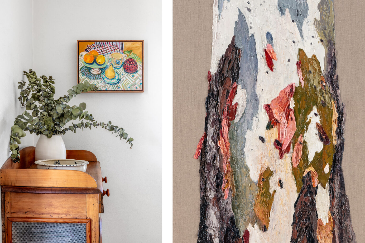 Above the chair hangs a luminous morning scene by Melanie Waugh, its soft, textural brushmarks laid in thick, quick strokes. Beneath it, eucalyptus leaves burst forth from a vessel by Catherine Field, completing a tableau that feels both composed and alive.