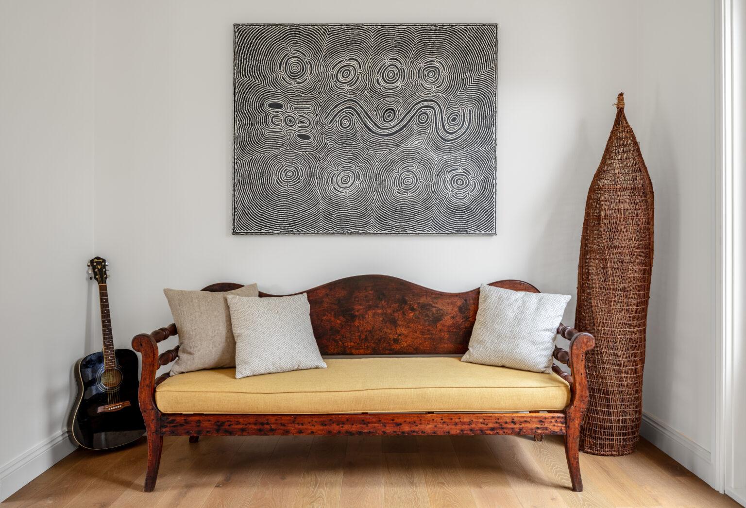 Beneath the collaborative Ampilatwatja painting, resting atop a small chest, sits a symmetrically handled vase by Kristy Hussey — a pleasing echo of the balance struck by the paired chairs and patterned cushions.