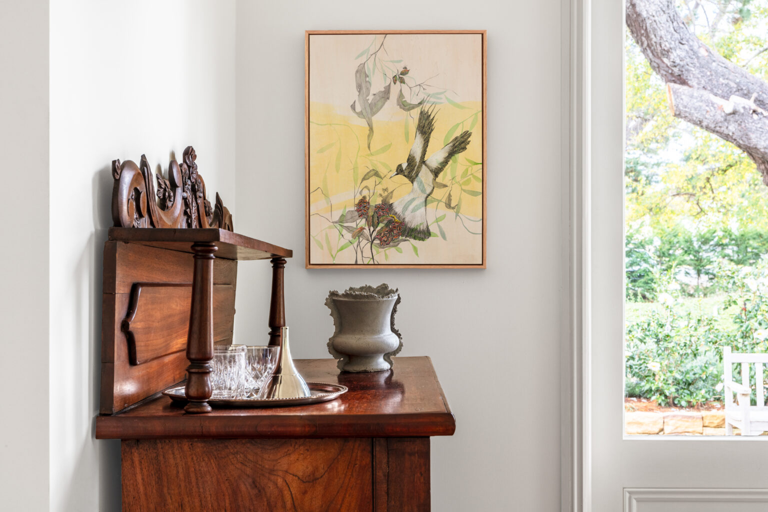 An available painting by Meg Walters, whose latest solo exhibition Space Between Dreams is currently showing in our ground floor gallery at Michael Reid Southern Highlands, brings fresh energy to the living area, joined by one of Julz Beresford’s Snowy Mountains depictions. Below, the tawny hues of a Julianne Ross Allcorn work perfectly complement the rich walnut tones of an antique buffet — her solo exhibition Through an Artist’s Journal is now open in the top floor gallery.