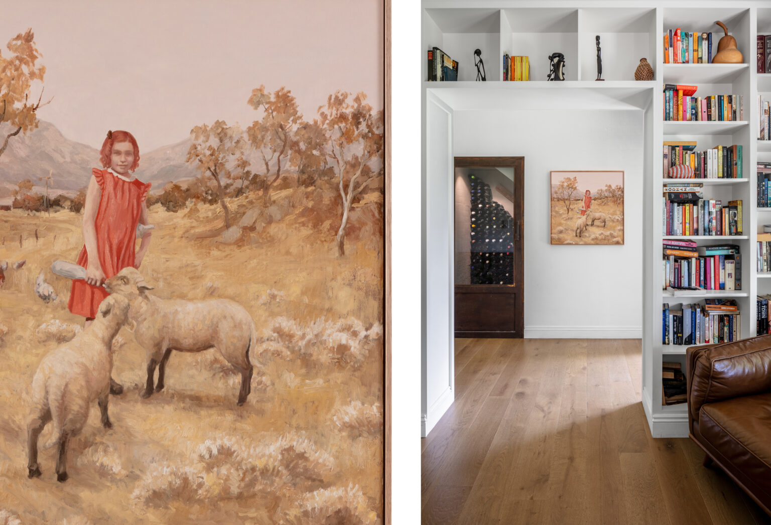 This collector demonstrates that tight corners and narrow spaces are not to be feared — placing a small still life by Kerri Kerley beside a beautifully refurbished kitchen hutch. Kerley’s work radiates colour and vitality, carrying with it the poignant sense that our past lives remain embedded in the objects we choose to keep close.