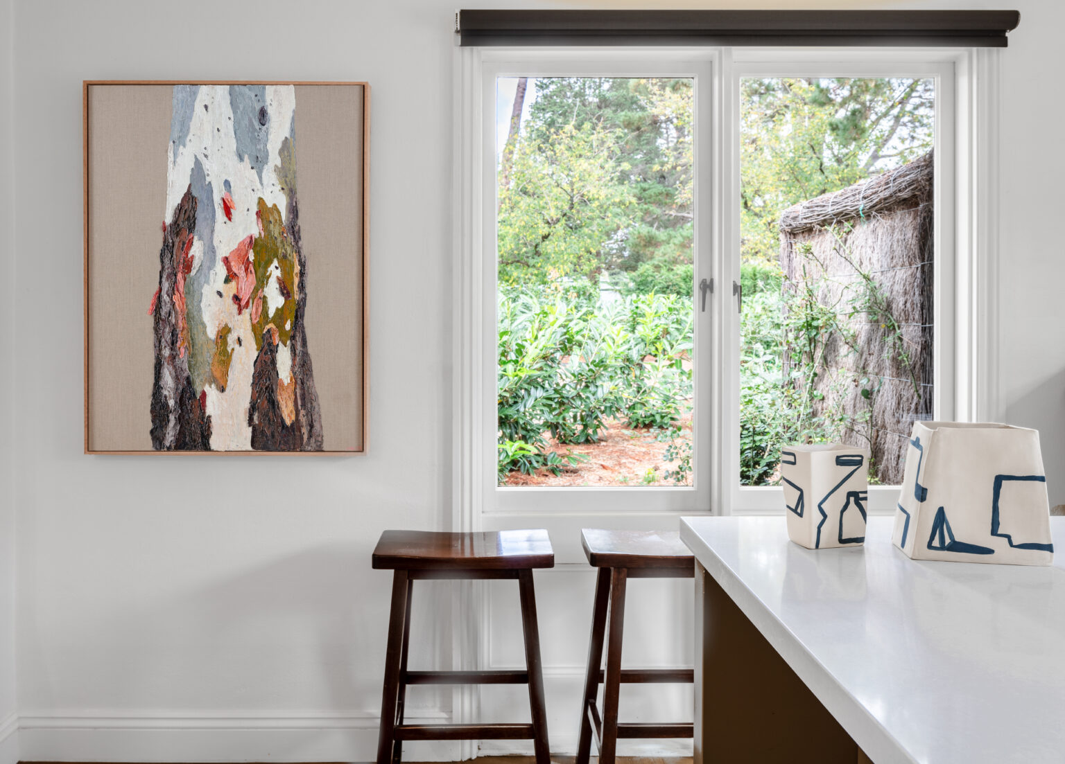 Echoing the wise old trees that stand just beyond the window frame, a work by Sarah McDonald forms a focal point in the kitchen. First introduced through Art Station at Michael Reid Murrurundi, McDonald captures the textures of bark and lichen in layers of oil impasto that, set against the neutral ground of linen, appear almost astonishingly lifelike.