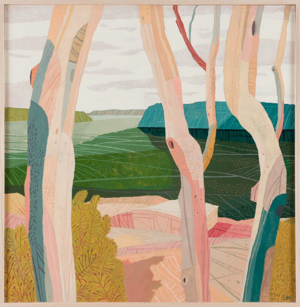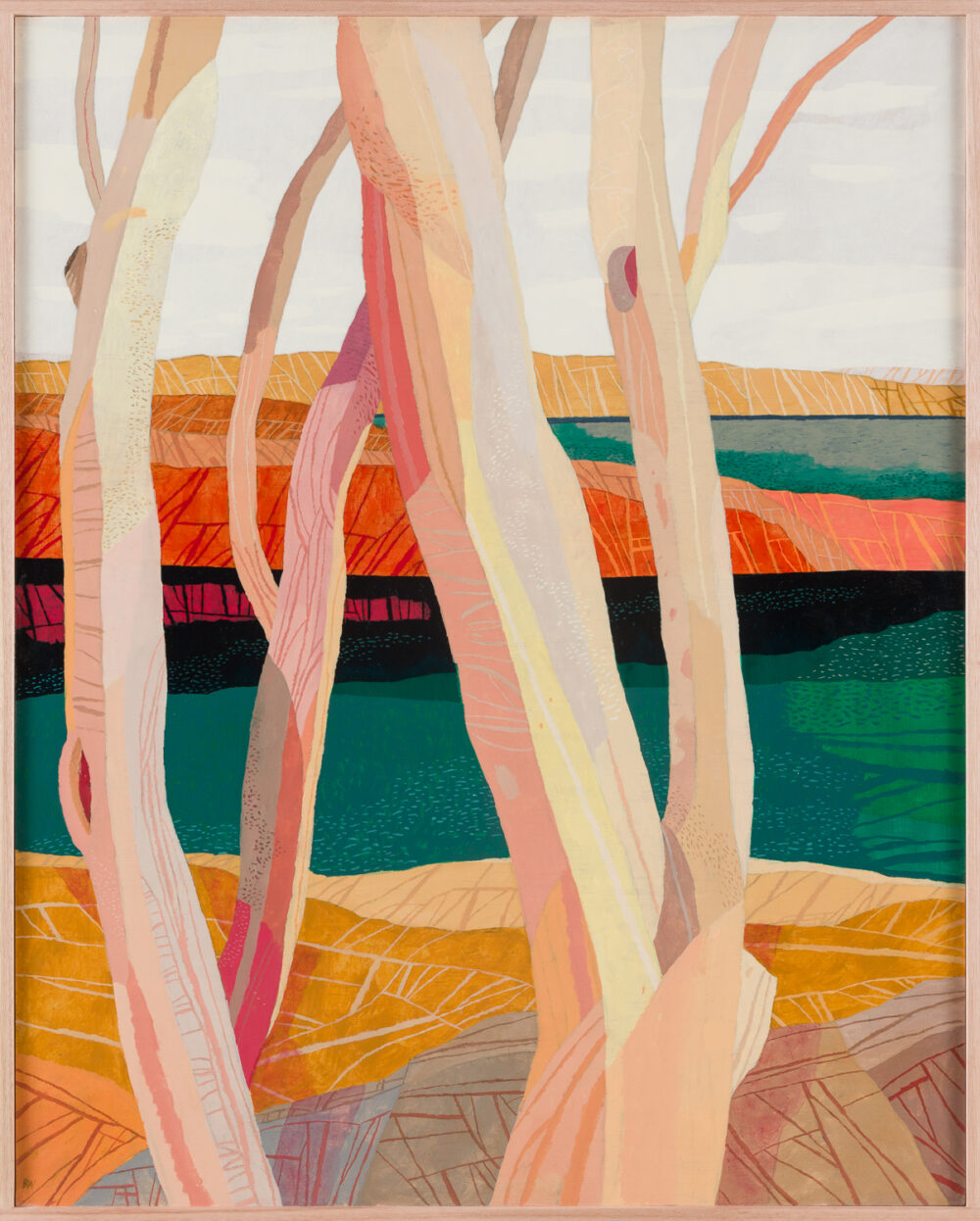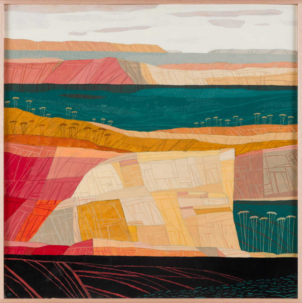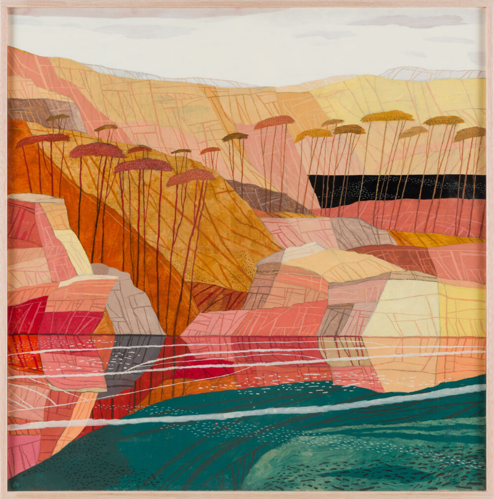 Although many of the pieces in this collection depict the river from water level, Ben’s signature elevated perspective is still evident. His striking visual forms–like a distant row of trees–are distinctly mid-century in feel, emerging from sharp, geometric hills and headlands. An evocative palette of ochres, reds, yellows, blacks, and whites remains one of the artist’s most recognisable signatures.