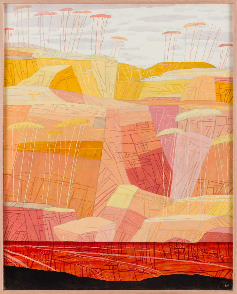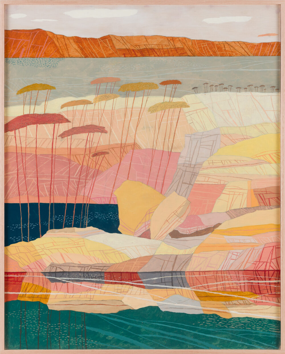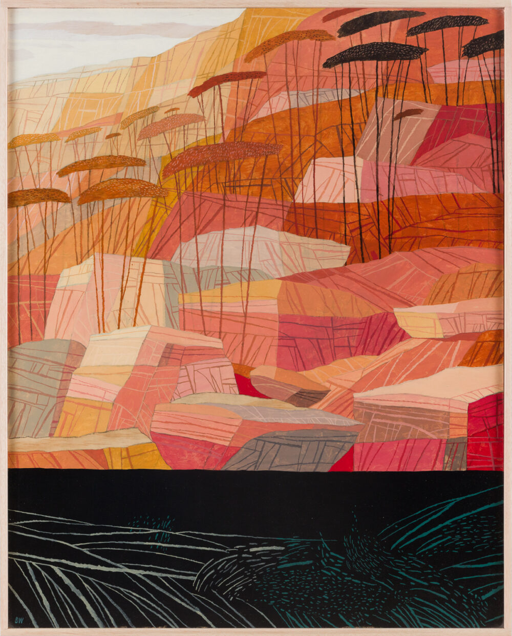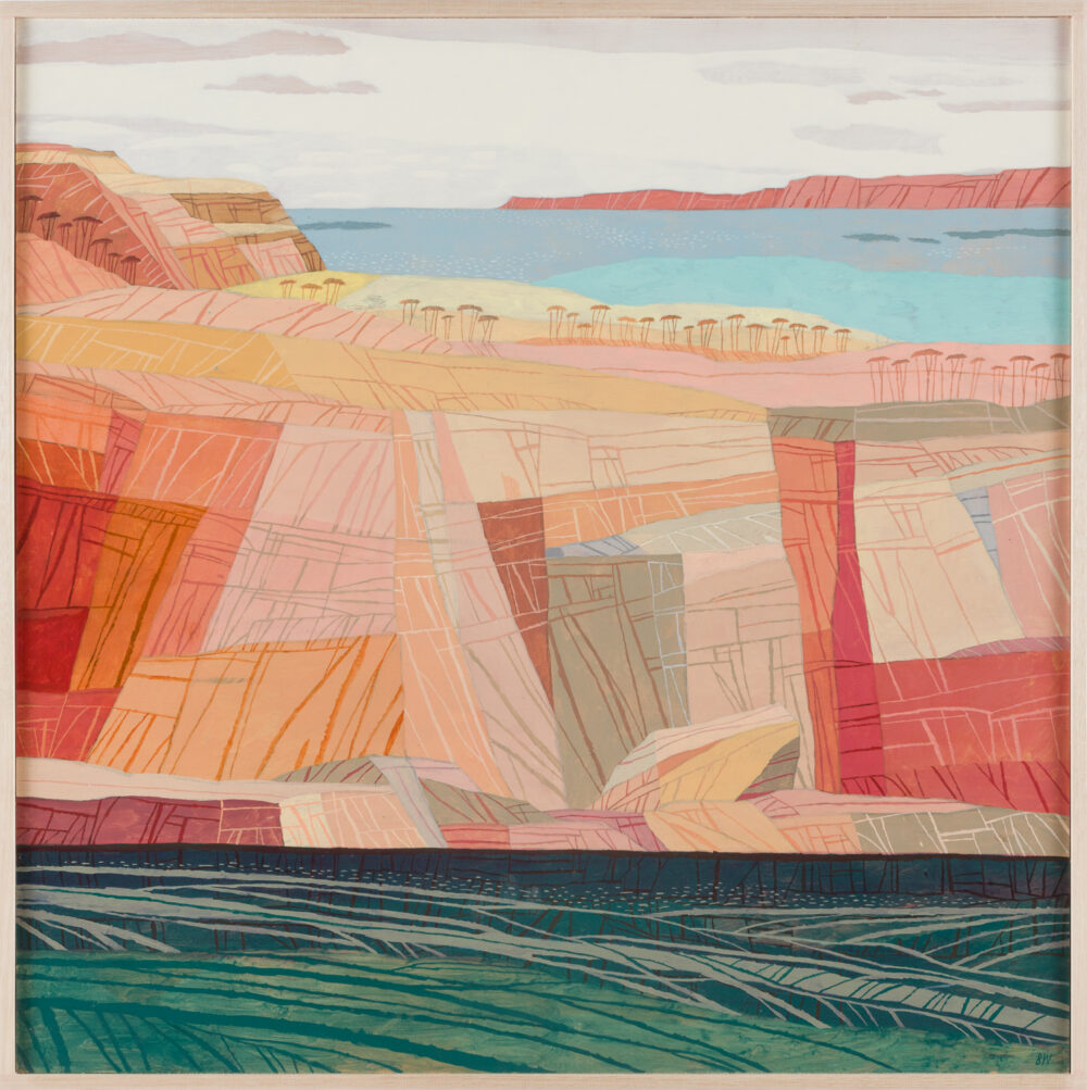 Although many of the pieces in this collection depict the river from water level, Ben’s signature elevated perspective is still evident. His striking visual forms–like a distant row of trees–are distinctly mid-century in feel, emerging from sharp, geometric hills and headlands. An evocative palette of ochres, reds, yellows, blacks, and whites remains one of the artist’s most recognisable signatures.
