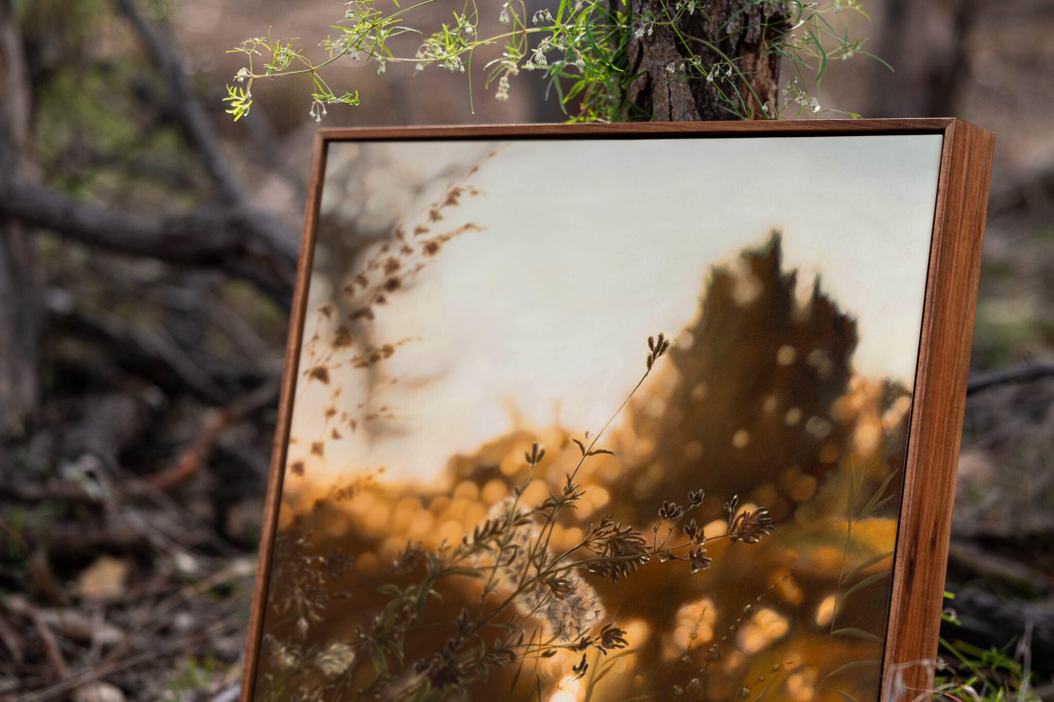The enduring muse of Cameilia Grace Edwards is the Australian landscape at dusk—caught in that fleeting interval of golden hour. The resulting effects are distinctly cinematic: resplendent beams of light wash across the surface; wild tangles of roadside vegetation are sometimes obscured by painted ‘lens flares’; and backgrounds are positioned out of focus, resembling bokeh.