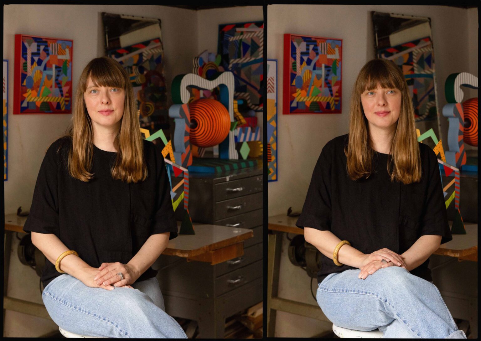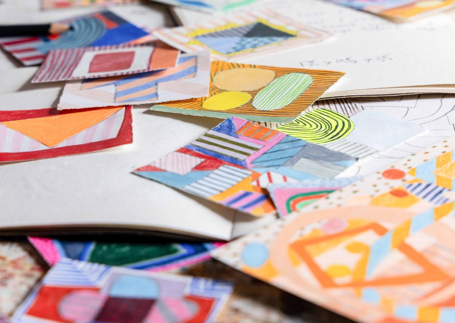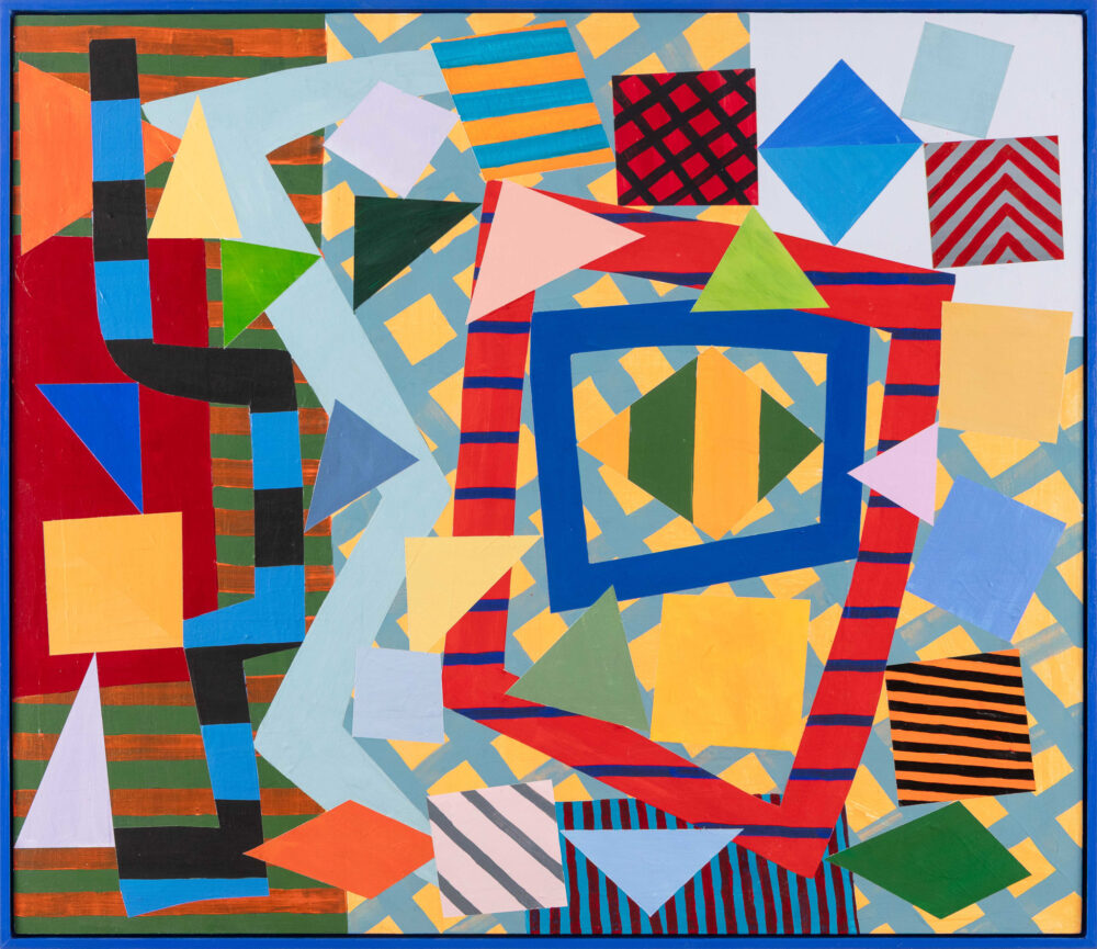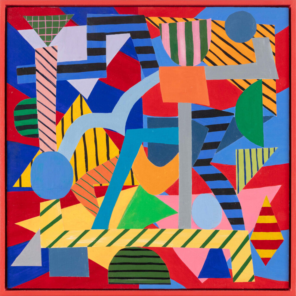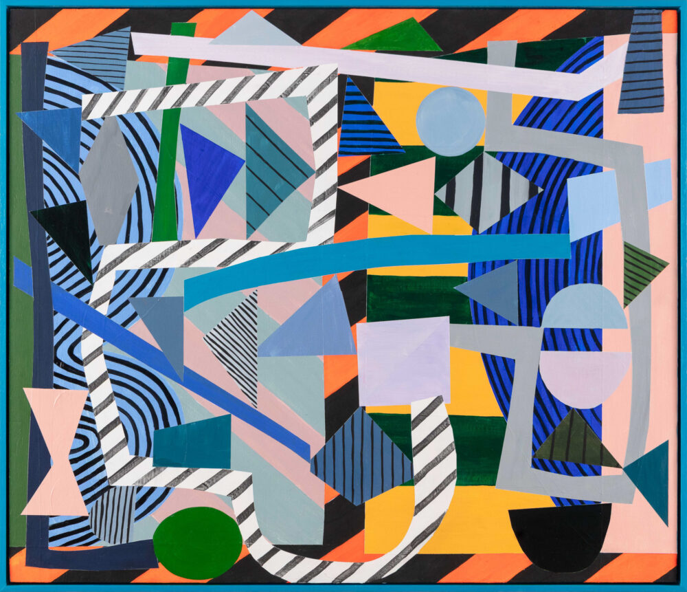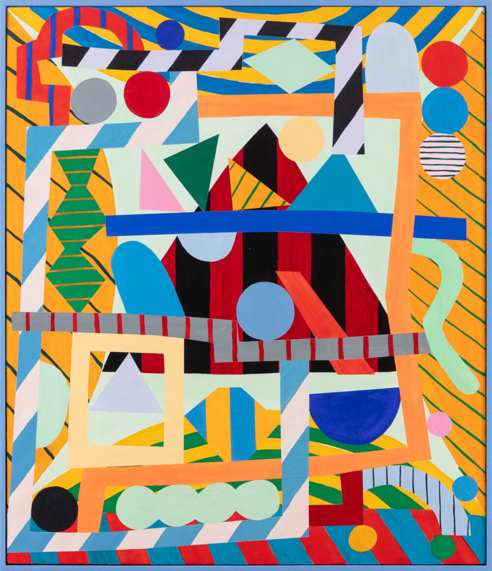 There is pleasure here, unapologetic yet precise. Colours flare and then quieten; compressed passages open suddenly into air; the eye ranges across the surface and doubles back, catching on small adjustments that register the artist’s decision-making. If the paintings brush lightly against art-historical echoes—Bauhaus textiles, postmodern façades, the optical play of dazzle camouflage—they do so obliquely, without quotation. What remains, above all, is their immediacy: work grounded in lived experience and the daily habits of the studio.