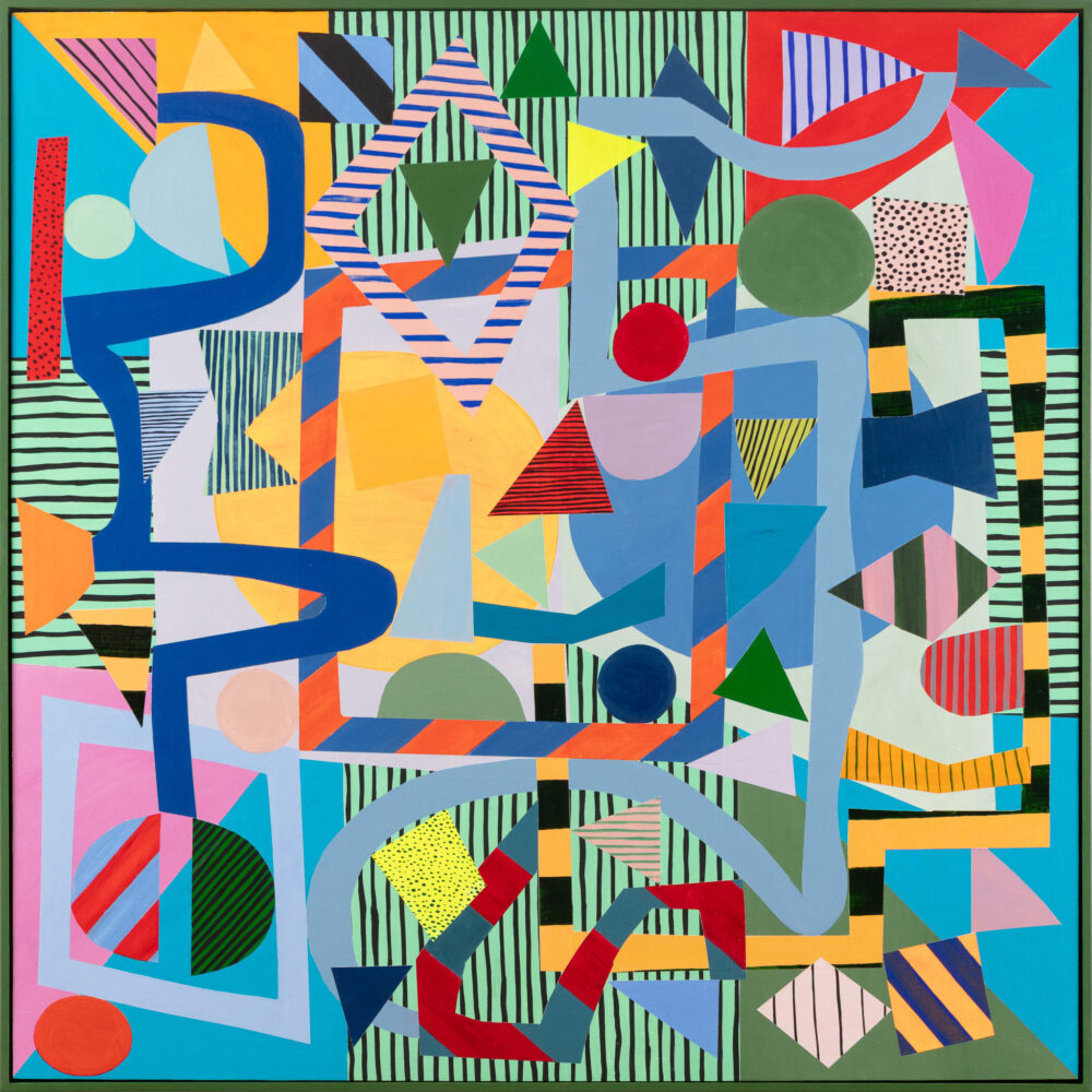 Julia Flanagan’s debut exhibition with Michael Reid unfolds in vivid, jubilant cadences of colour, pattern and form, and reveals an artist working at full stretch within a language she has made her own.  The paintings seem animated by the same rhythm: lines curve, return and cross themselves, slipping between foreground and background as though intent on binding the works together. Many begin as drawings—quick, provisional notations made at a domestic table or studio bench—before widening into fields of paint.  From there, fragments are enlarged, spliced, rephrased; a sliver from an earlier canvas becomes the seed of the next. Quilting squares, remembered from her mother’s sewing, over geometric ballast, though that order is soon unsettled by curves and arcs that dip and weave like the thread pulled through cloth. The result is a choreography of parts—disciplined, but never still.