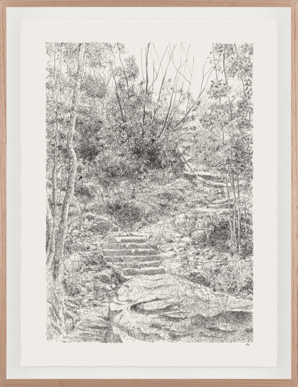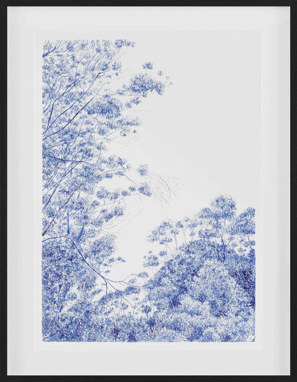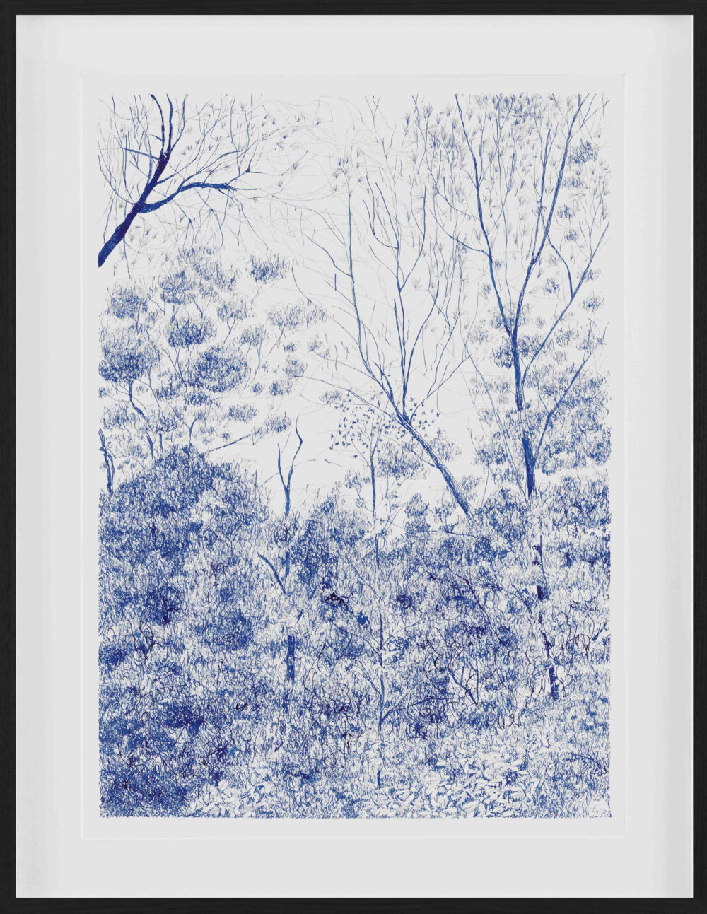 ‘Fox Paths – Minnamurra River’ delves into the nuanced beauty of the bushland Drew calls home. “Standing on one rock or patch of grass, I draw the views from different angles around that point, providing a unique view of how truly beautiful and diverse an individual spot can be,” he explains. This immersive approach enables Drew to create intricate, multi-perspective compositions that celebrate both the individuality and interconnectedness of the landscape. Working exclusively with black or blue ink, Drew forgoes traditional hues to evoke the essence of his surroundings. “Rather than trying to match the hues and tones of the bush, the ink provides an impression of the landscape, revealing its beauty with one single colour,” he says. His drawings are rich with texture and density, inviting viewers to see the bush through a fresh, distilled lens.