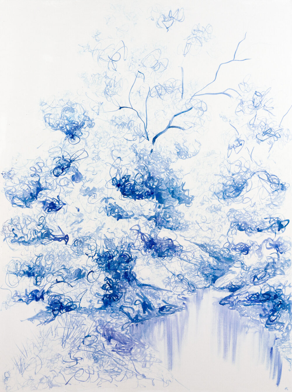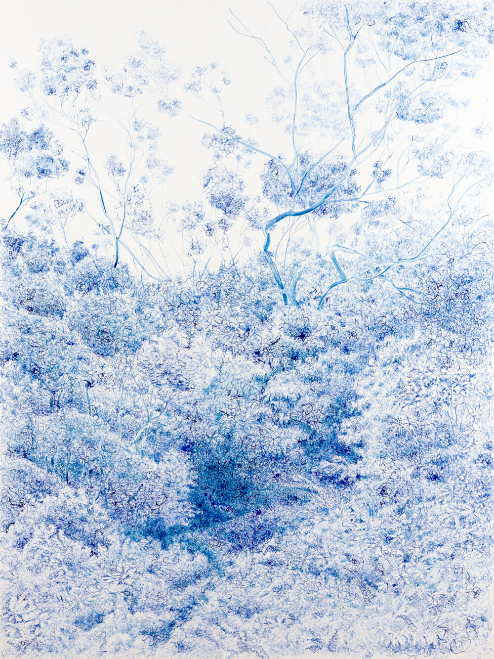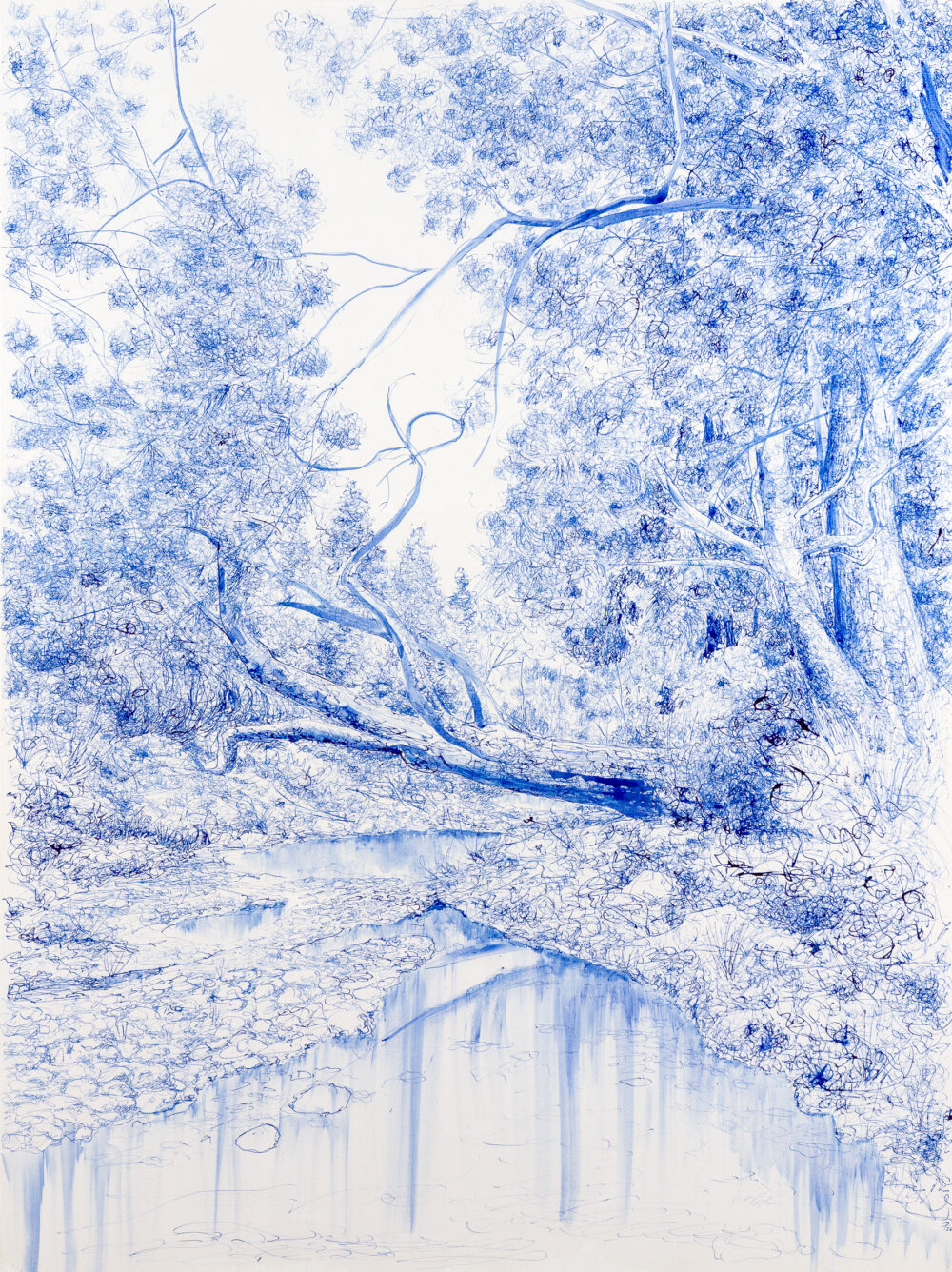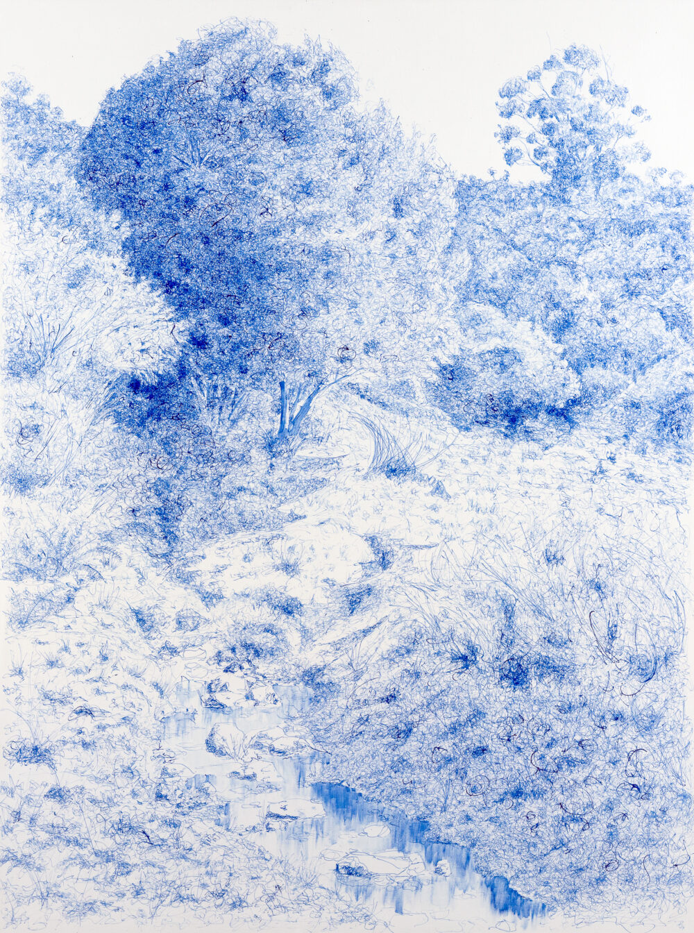 ‘Fox Paths – Minnamurra River’ delves into the nuanced beauty of the bushland Drew calls home. “Standing on one rock or patch of grass, I draw the views from different angles around that point, providing a unique view of how truly beautiful and diverse an individual spot can be,” he explains. This immersive approach enables Drew to create intricate, multi-perspective compositions that celebrate both the individuality and interconnectedness of the landscape. Working exclusively with black or blue ink, Drew forgoes traditional hues to evoke the essence of his surroundings. “Rather than trying to match the hues and tones of the bush, the ink provides an impression of the landscape, revealing its beauty with one single colour,” he says. His drawings are rich with texture and density, inviting viewers to see the bush through a fresh, distilled lens.