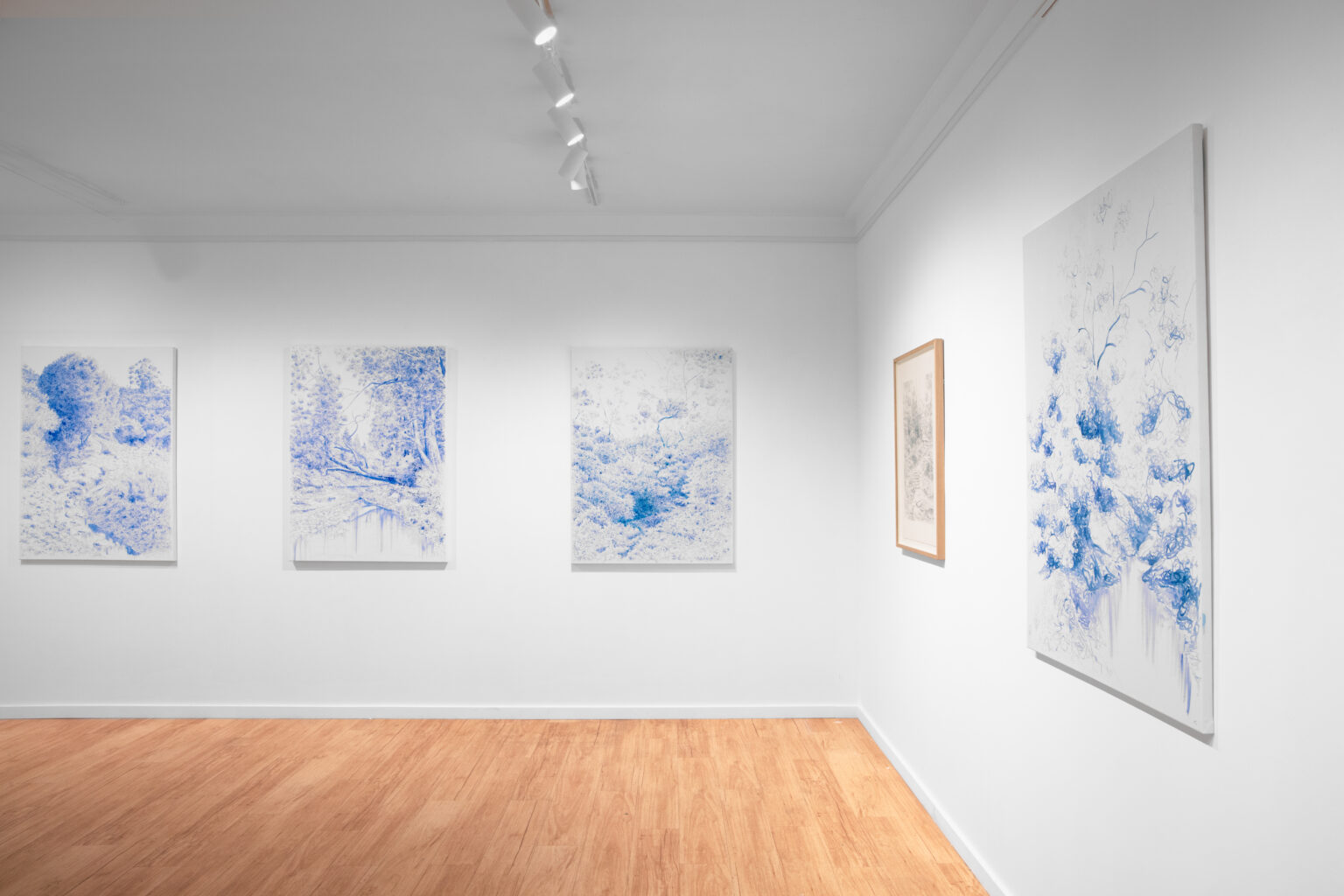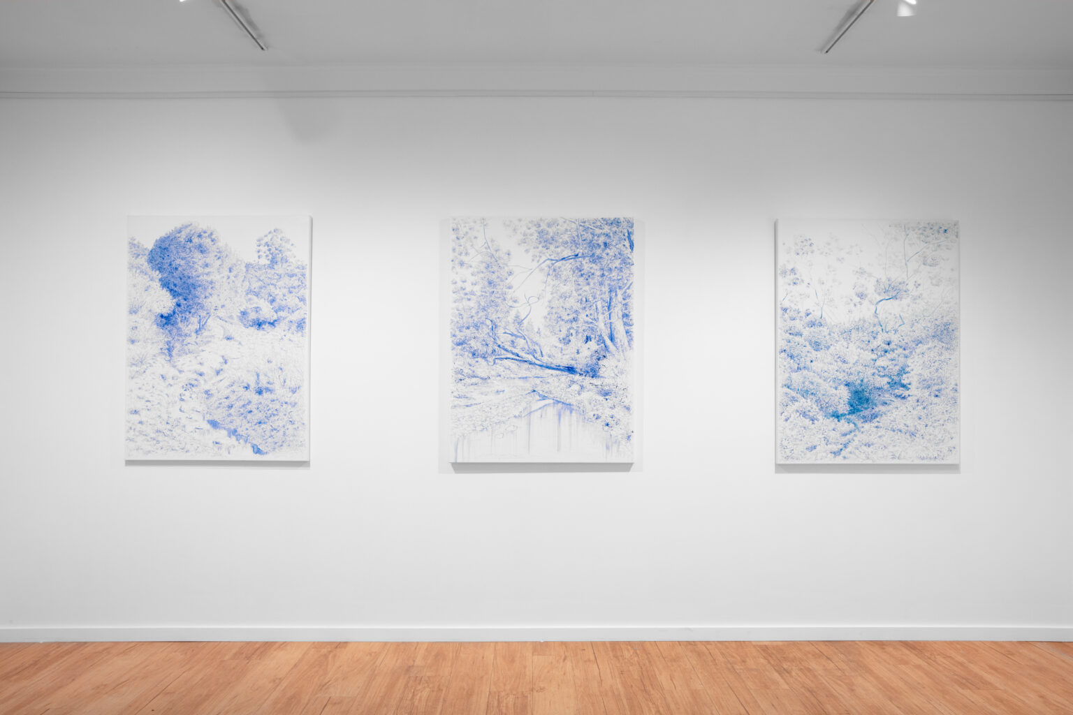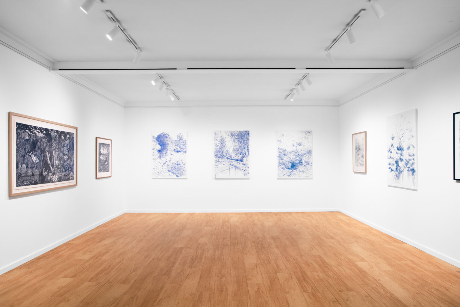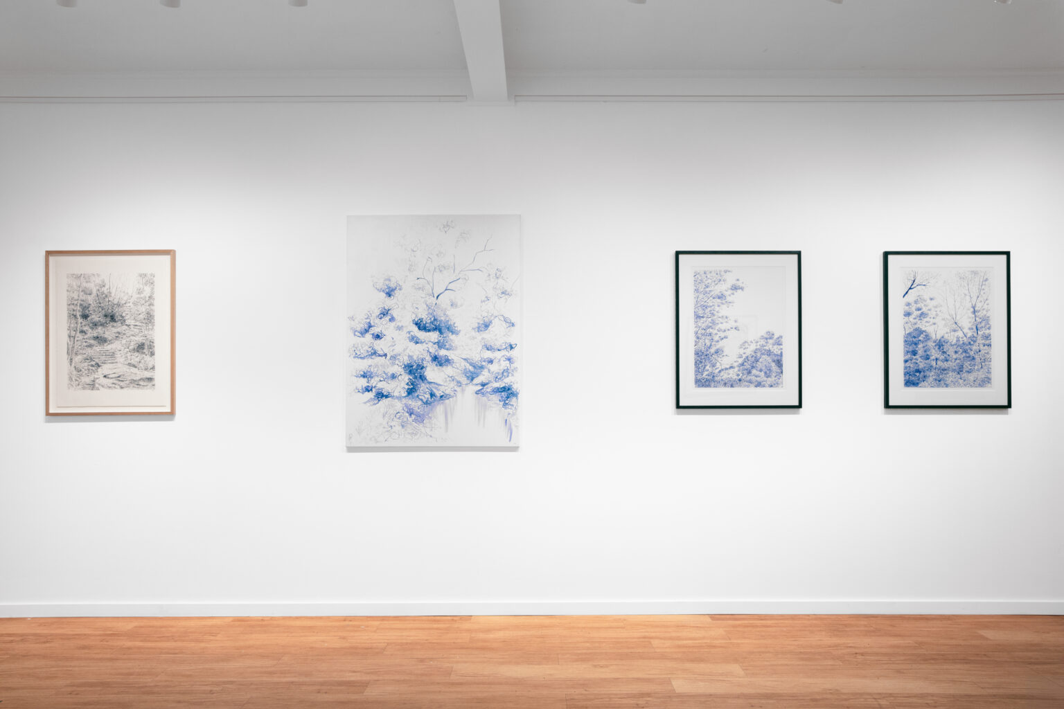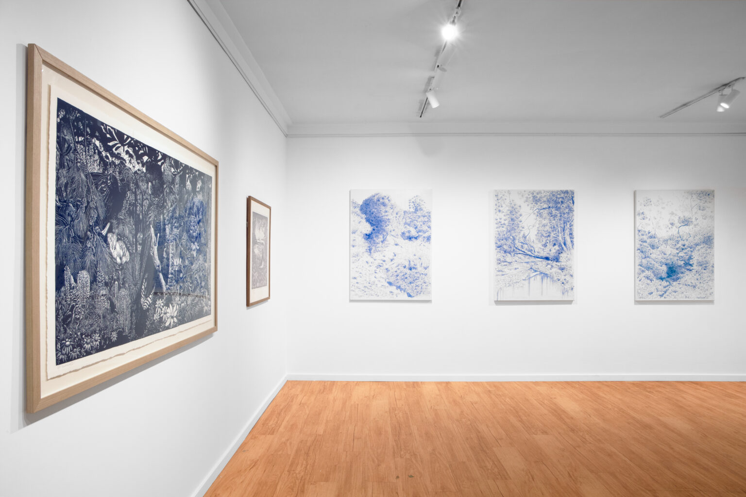 ‘Fox Paths – Minnamurra River’ delves into the nuanced beauty of the bushland Drew calls home. “Standing on one rock or patch of grass, I draw the views from different angles around that point, providing a unique view of how truly beautiful and diverse an individual spot can be,” he explains. This immersive approach enables Drew to create intricate, multi-perspective compositions that celebrate both the individuality and interconnectedness of the landscape. Working exclusively with black or blue ink, Drew forgoes traditional hues to evoke the essence of his surroundings. “Rather than trying to match the hues and tones of the bush, the ink provides an impression of the landscape, revealing its beauty with one single colour,” he says. His drawings are rich with texture and density, inviting viewers to see the bush through a fresh, distilled lens.