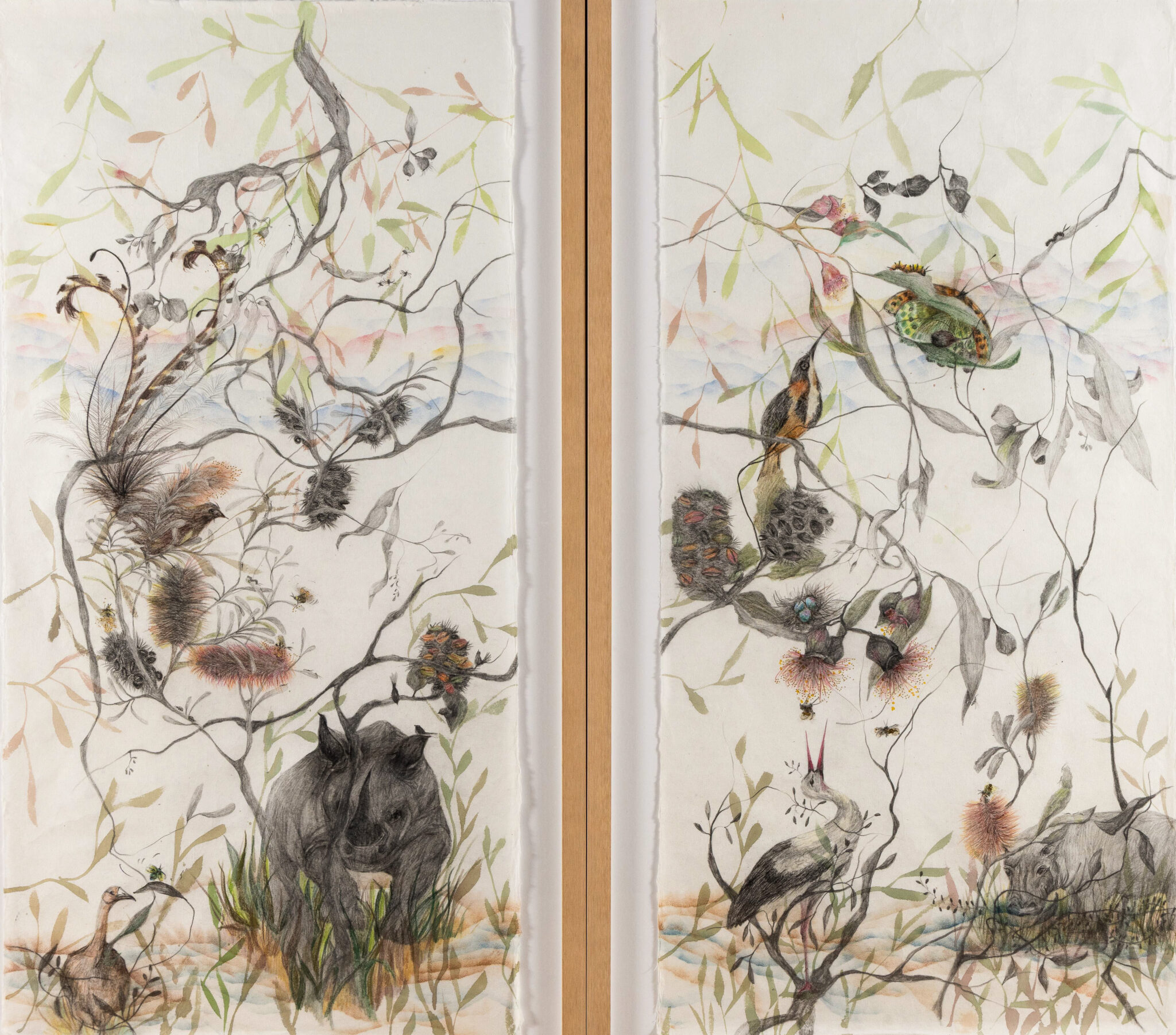The Intertwined was shaped by a formative journey abroad. “This is one of the artworks created from my trip to Kenya,” she shares, “where I had the opportunity not only to go on a safari but to be invited to teach and work with young artists in the Mizizi Primary School and with young adult artists at the Uweze Art Gallery in Kibera for four days. That experience will never come again.” In these pieces, the flora and fauna of Australia and Kenya meet in layered compositions that honour endangered species from both regions.