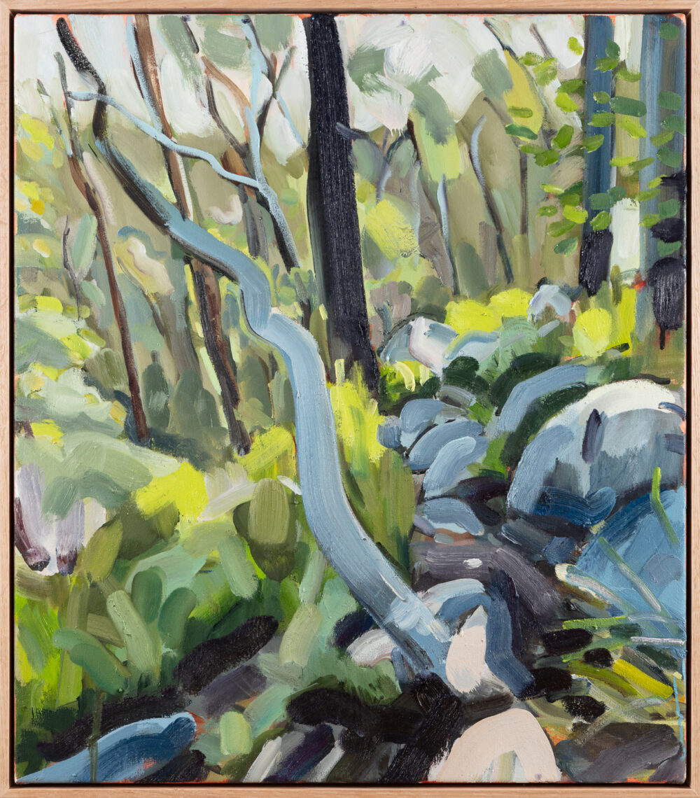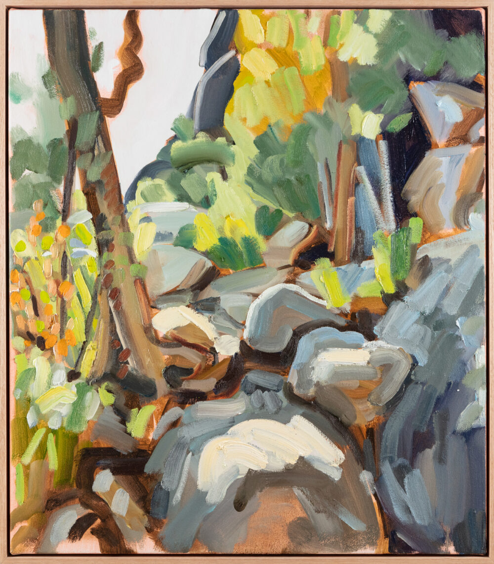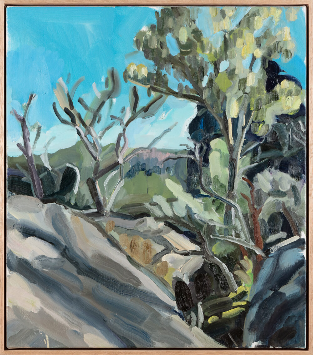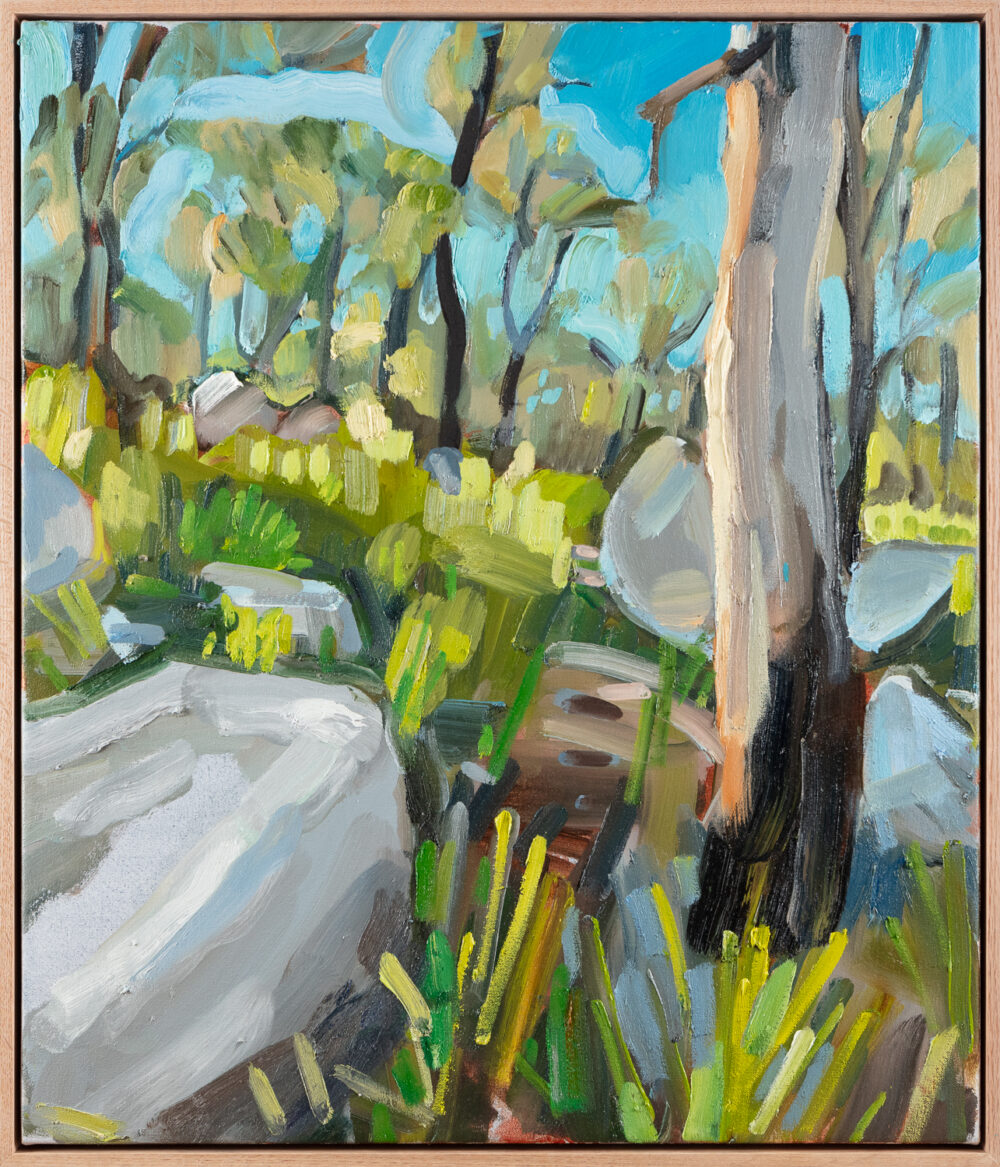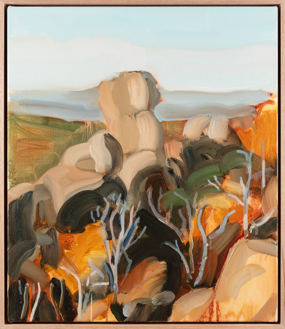 With High Country, Melanie Waugh has absorbed the colours and boulder-strewn terrain of Cathedral Rock National Park on Gumbaynggirr and Anaiwan country, allowing this beguiling notch of the New England Tablelands to modify and inflect both her palette and forms. Located an hour’s drive from Waugh’s family home on the NSW Mid North Coast, Cathedral Rock holds deep significance for the artist. “In this series,” she writes, “I have continued with painting places of rest and solace. Here, ancient volcanic rocks have formed and created a natural sculpture park that is deeply immersive.”
