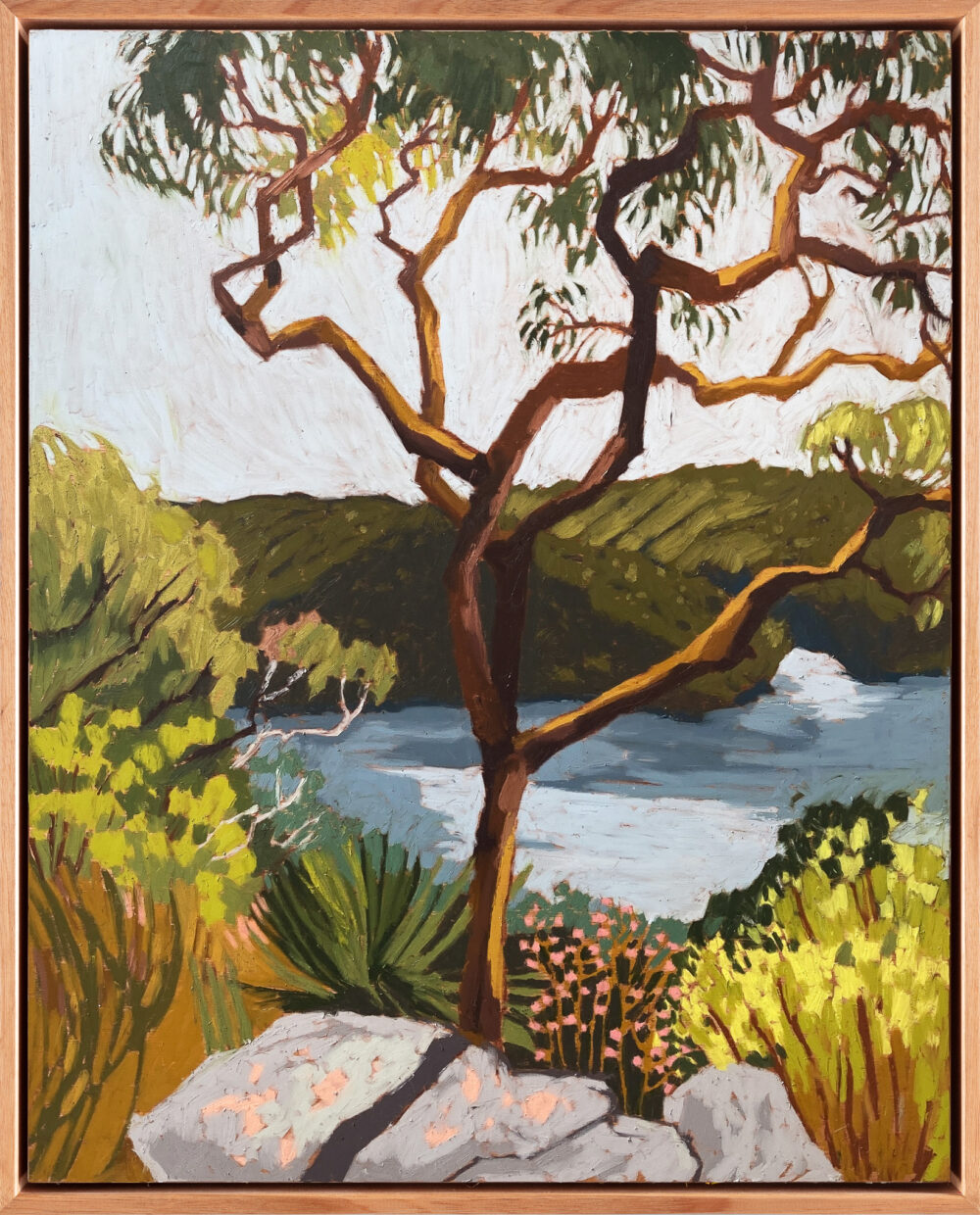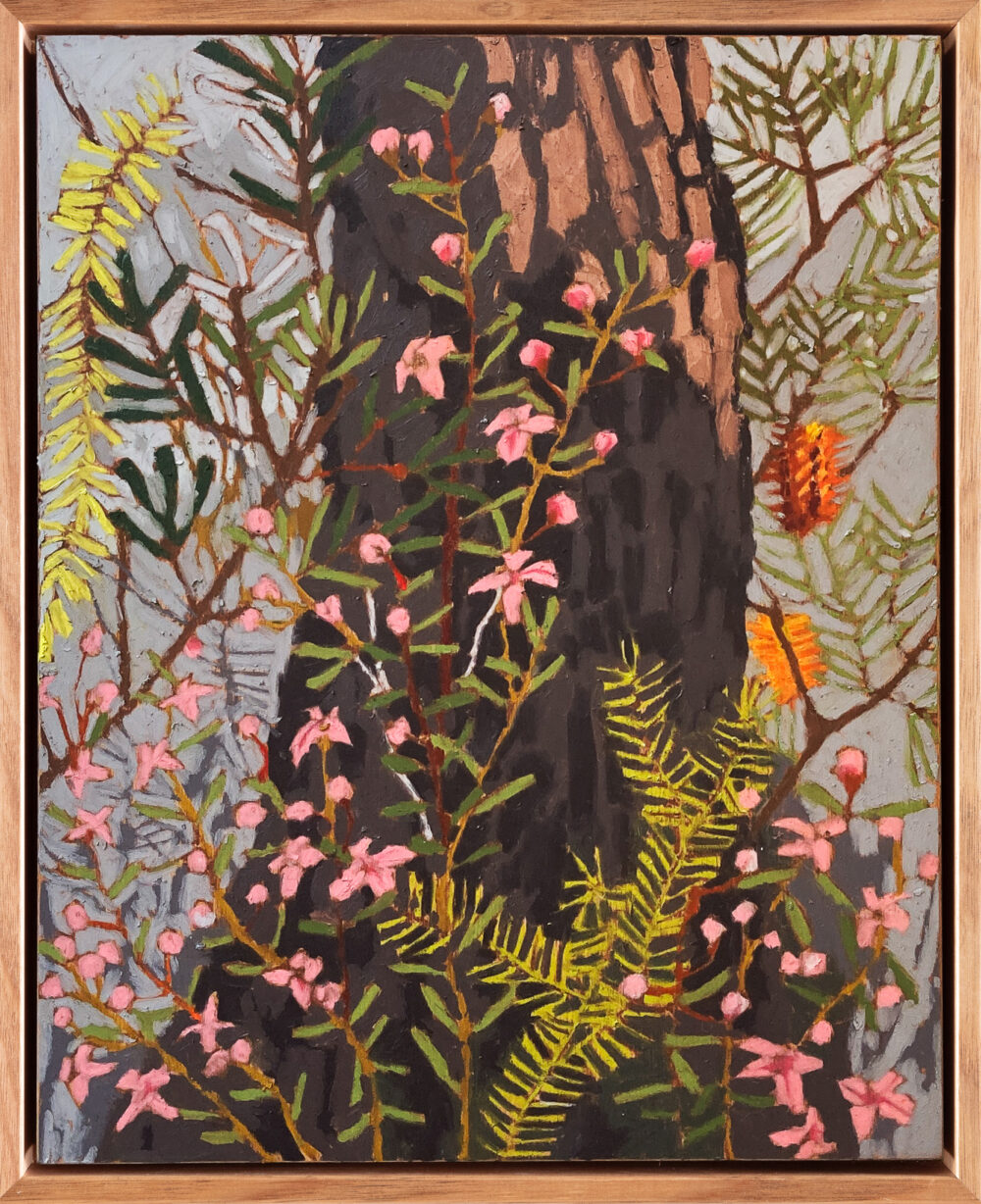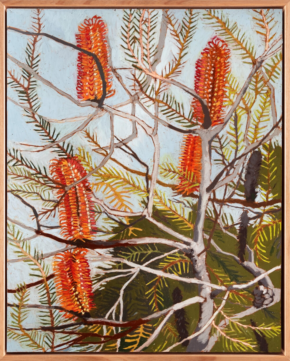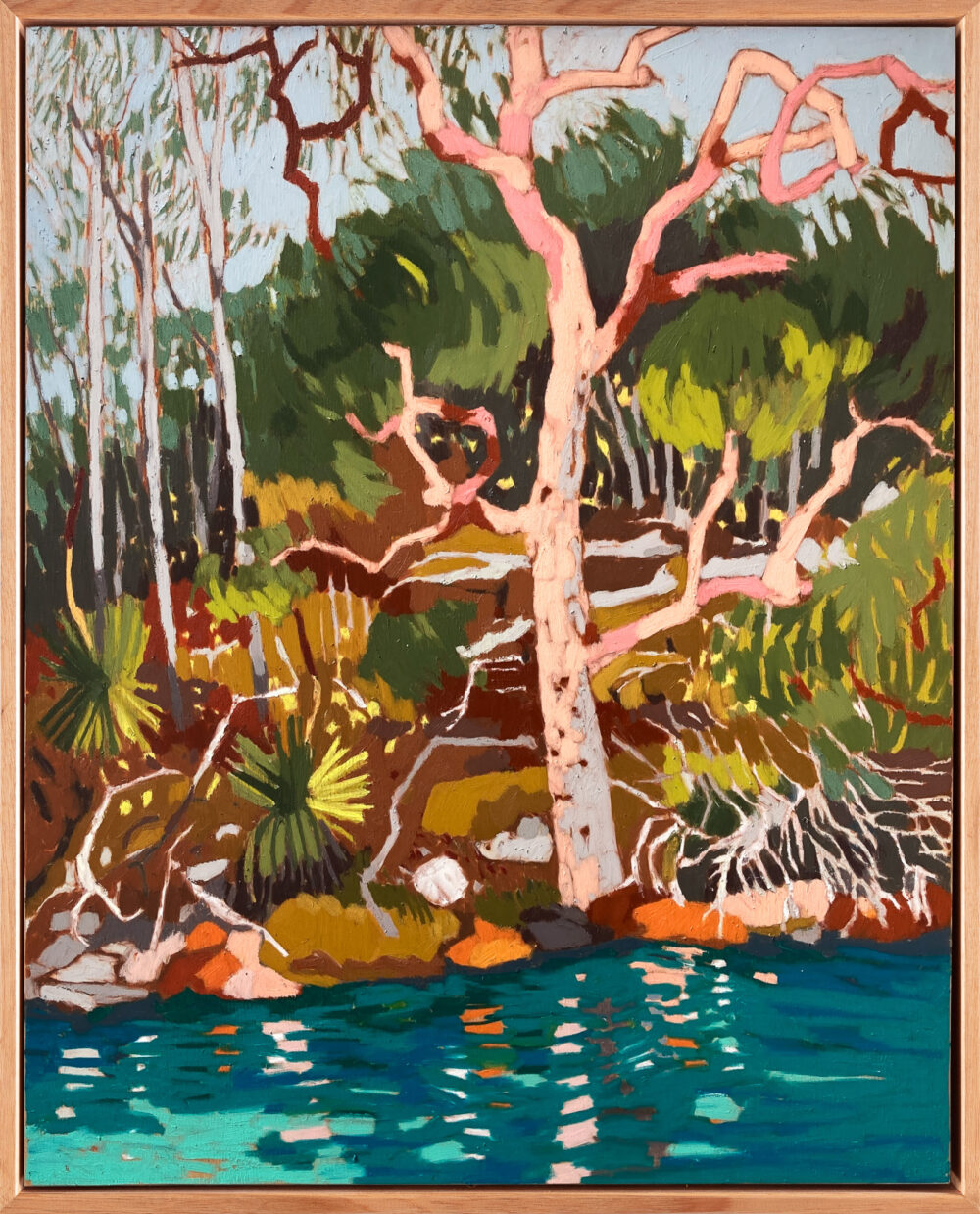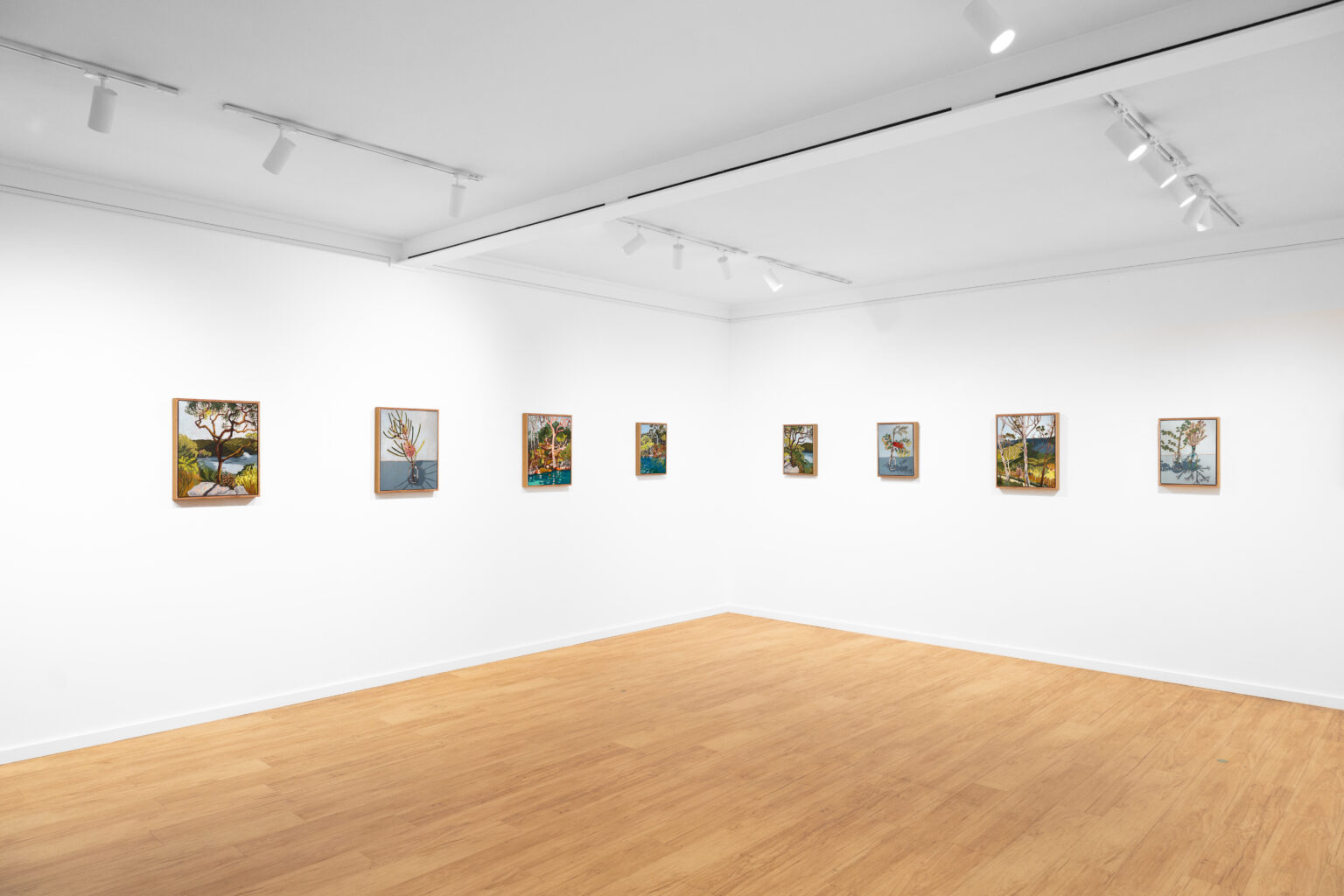 Each artist, with her distinct visual language, paints a single Tjukurpa – a cultural story rooted in her Country. Barney captures the lush vibrancy of the Kapata (bush plum) plant; Cullinan evokes the waterholes, boulders and riverbeds once traversed with her family on long journeys across Country. Burton, painting her ancestral lands of Anamara Piti – the site of the Caterpillar Tjukurpa, near Irrunytju (Wingellina) – uses sweeping brushwork to map roads and waterholes in bold, fluid lines.