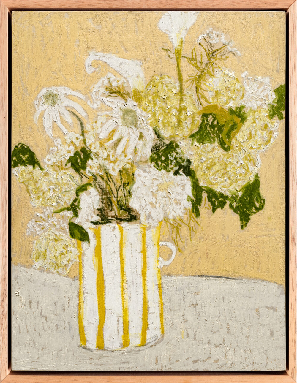 Tea towels reappear throughout the body of work, familiar forms that she neither sentimentalizes nor seeks to elevate. “I’m not after nostalgia exactly, but I know that people project meaning onto these objects. That’s part of what makes them so interesting.” Of Untitled (unfolded tea towel, yellow stripes), she simply says, “The colour feels joyful. And sometimes, that’s enough of a reason.” While there’s no overt narrative threading the series together, there is a consistent undercurrent—a quiet attention to transformation. “These fabrics have been touched, folded, used. And now they’re painted, suspended. There’s something in that transformation that I keep coming back to.”