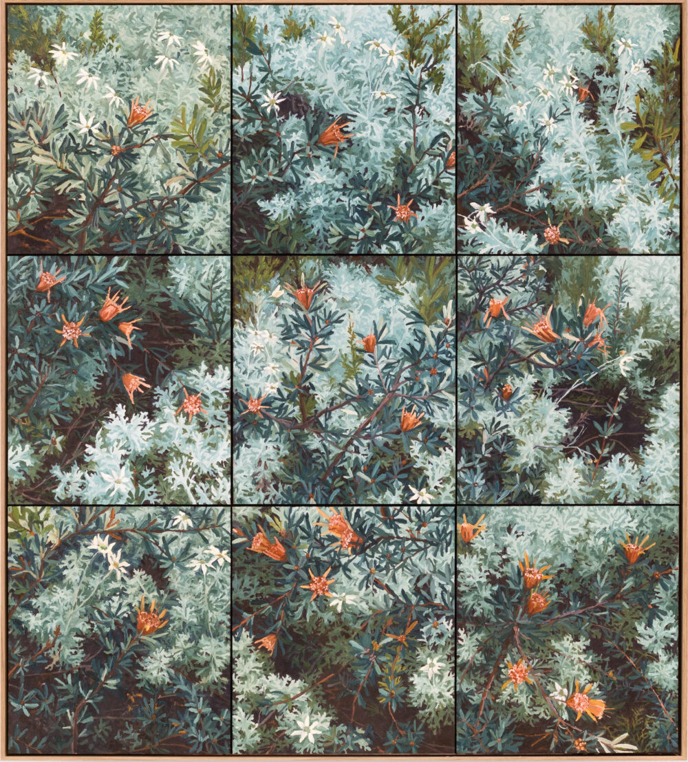 ‘Fox Paths – Minnamurra River’ delves into the nuanced beauty of the bushland Drew calls home. “Standing on one rock or patch of grass, I draw the views from different angles around that point, providing a unique view of how truly beautiful and diverse an individual spot can be,” he explains. This immersive approach enables Drew to create intricate, multi-perspective compositions that celebrate both the individuality and interconnectedness of the landscape. Working exclusively with black or blue ink, Drew forgoes traditional hues to evoke the essence of his surroundings. “Rather than trying to match the hues and tones of the bush, the ink provides an impression of the landscape, revealing its beauty with one single colour,” he says. His drawings are rich with texture and density, inviting viewers to see the bush through a fresh, distilled lens.