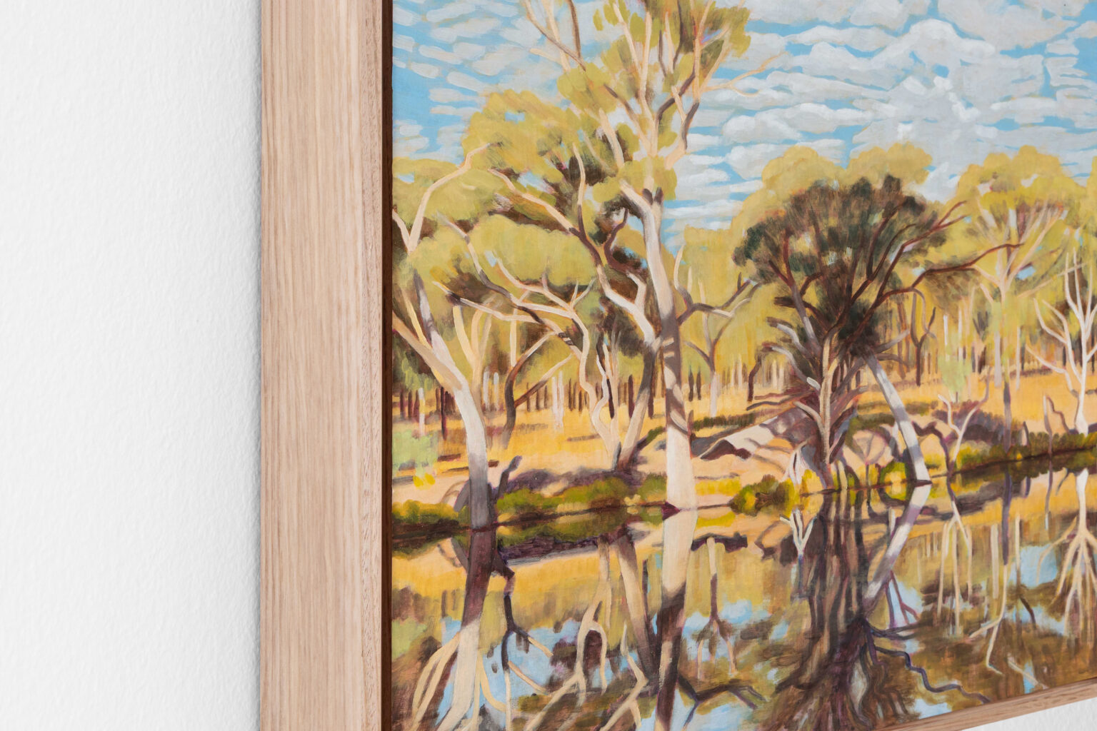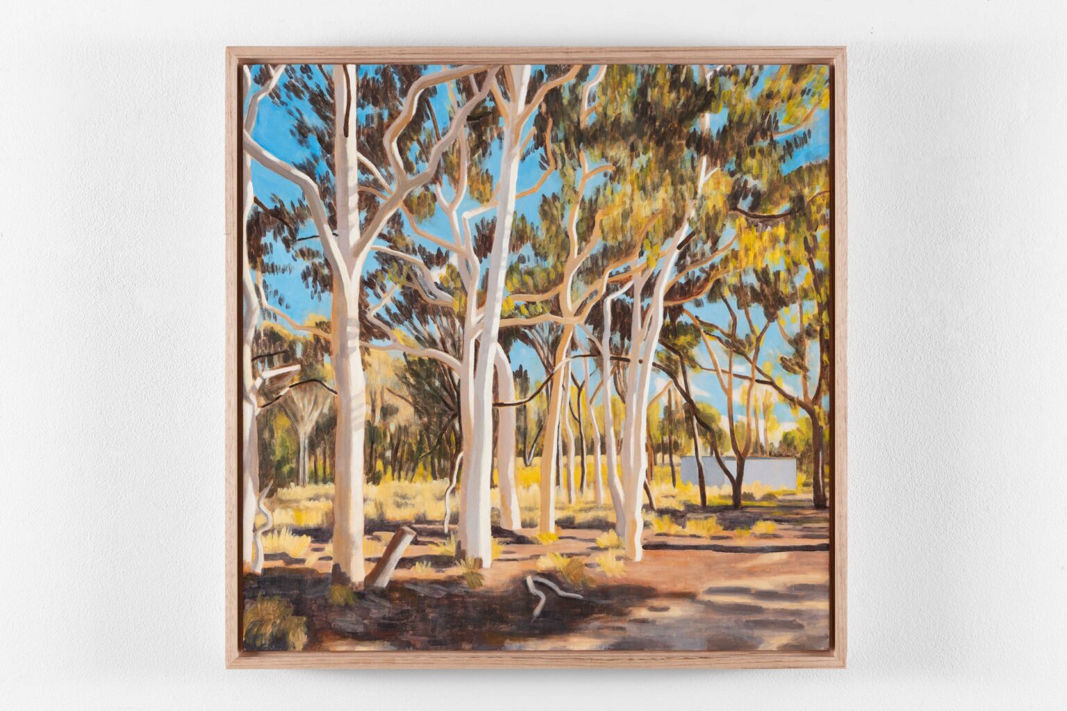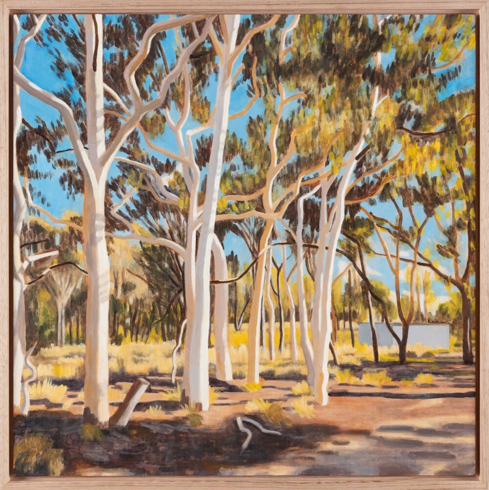 What links Quieter Ground to Gordon’s cityscapes is her enduring commitment to Australian light as a structuring force. In Paddington and The Rocks, light falls across architectural planes—staircases, rooftops, terraces stepping downhill. Here, light behaves differently. It is ecological and spatial: moving laterally through sky, repeating across tree trunks. Ochres, golds and muted greens replace the gelato tones of the city, yet Gordon’s palette remains alert and finely calibrated.
