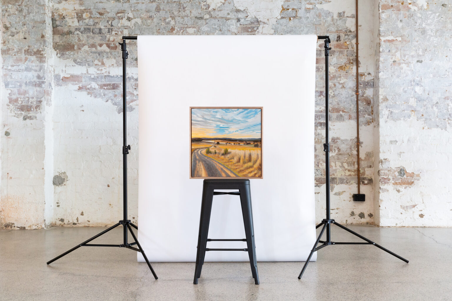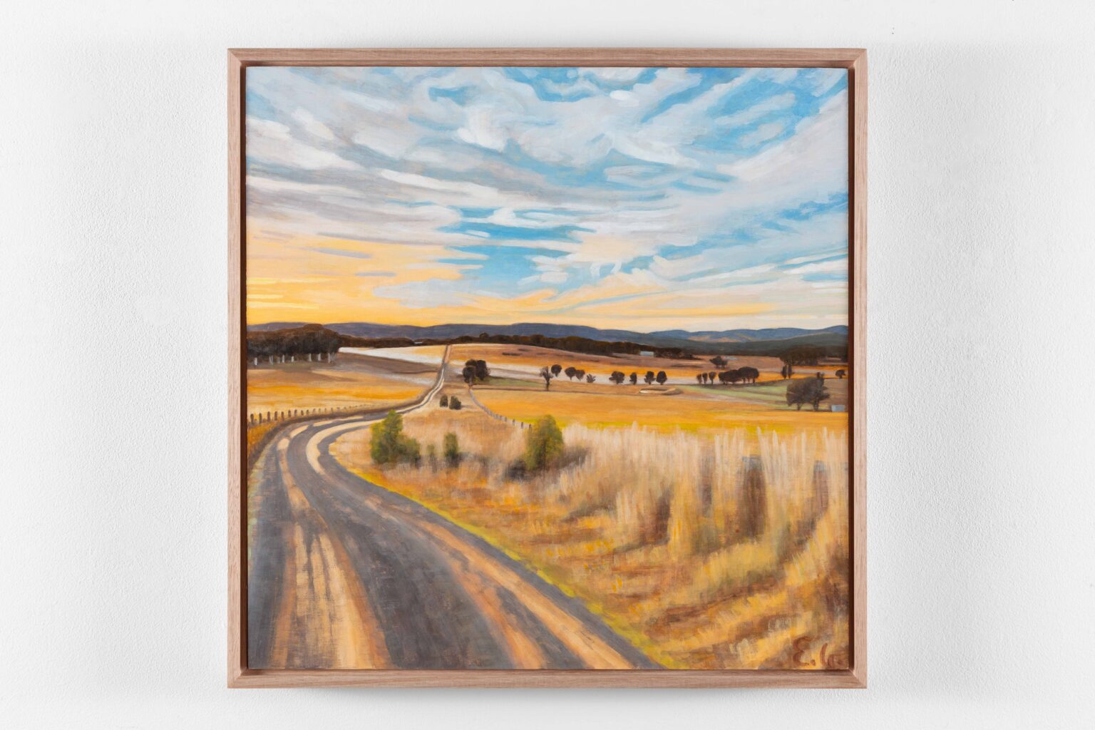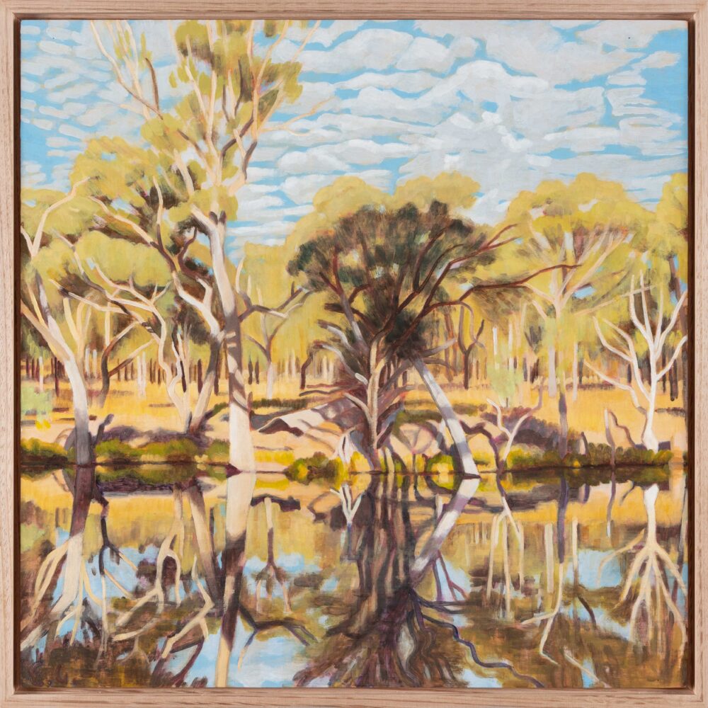 Gunning, NSW is a place of enduring personal significance for Emily Gordon. She has travelled here with her family for many years, returning again and again to this gorgeous landscape. Across this small suite of works, Gordon charts the paddocks, tree lines, winding roads and bodies of water around Gunning with the same acuity she brings to urban facades. Eucalypts rise pale and rhythmic against broad skies; roads curve gently through dry grasslands; reflections double the world in still pools.