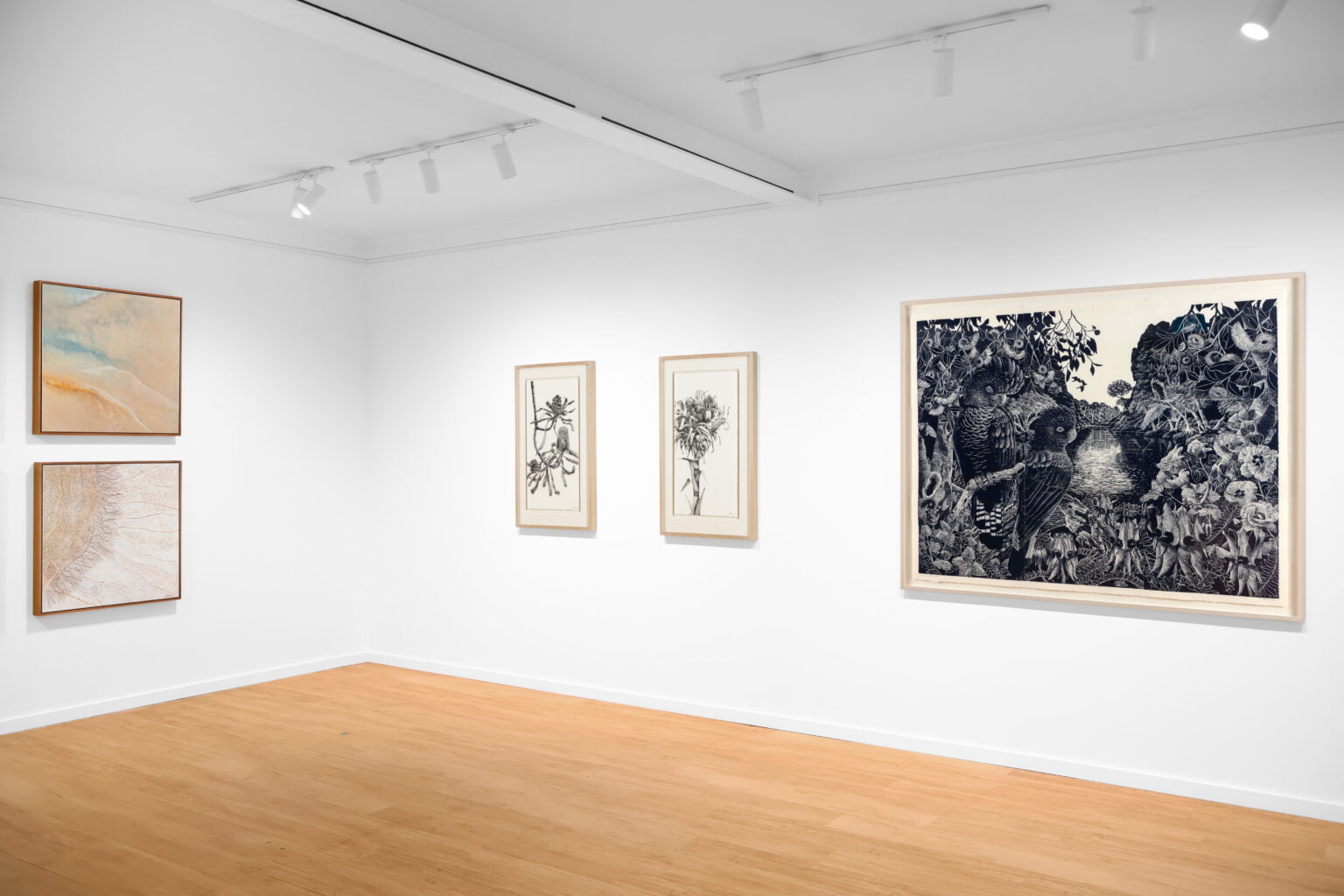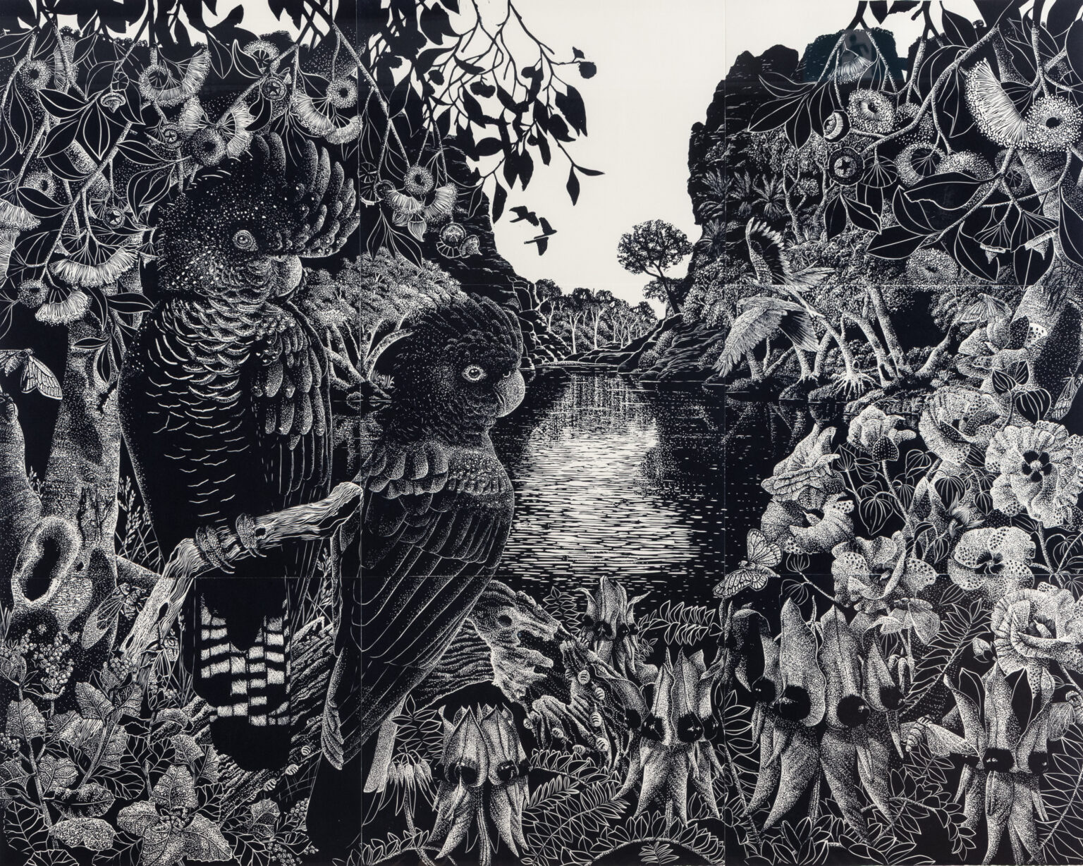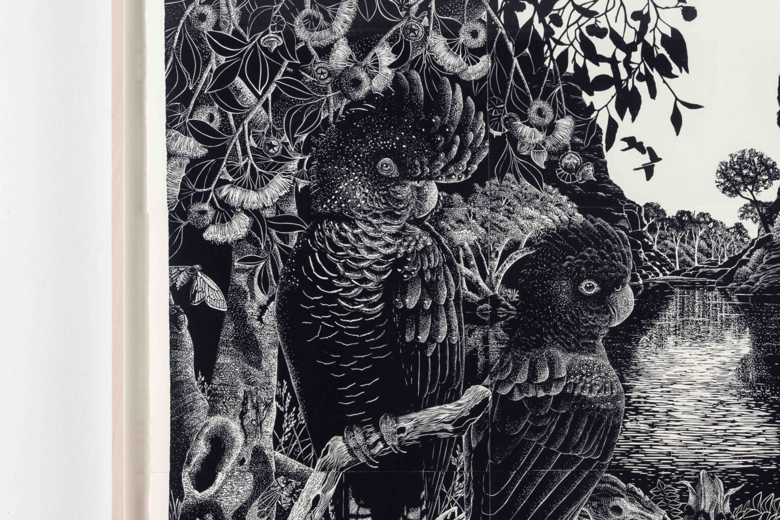 Lake Conjola–based printmaker Peta West unveils two of the most commanding works of her career — including the monumental Sweetwater. Across vast linocuts, carved line by line over hundreds of hours, West renders the landscape with masterful precision. “I’m constantly searching for ways to carve the landscape with depth,” she says, “so that when you look at the work, you feel as though you could step right into the reimagined vista before you.”