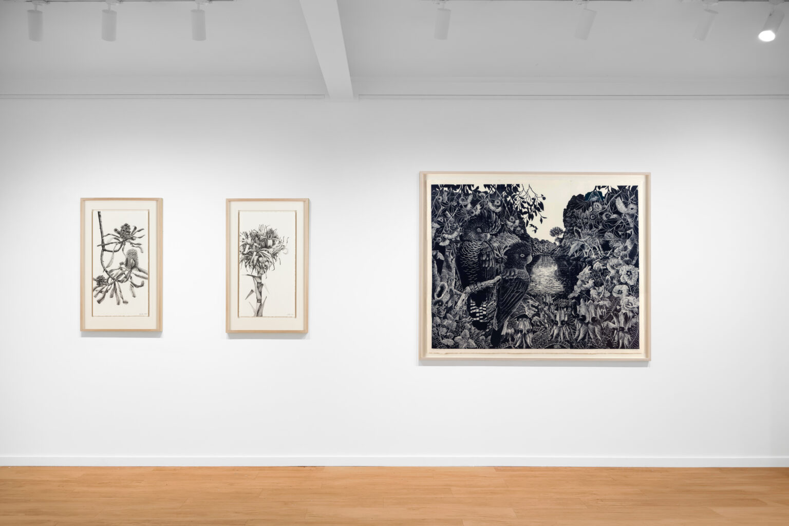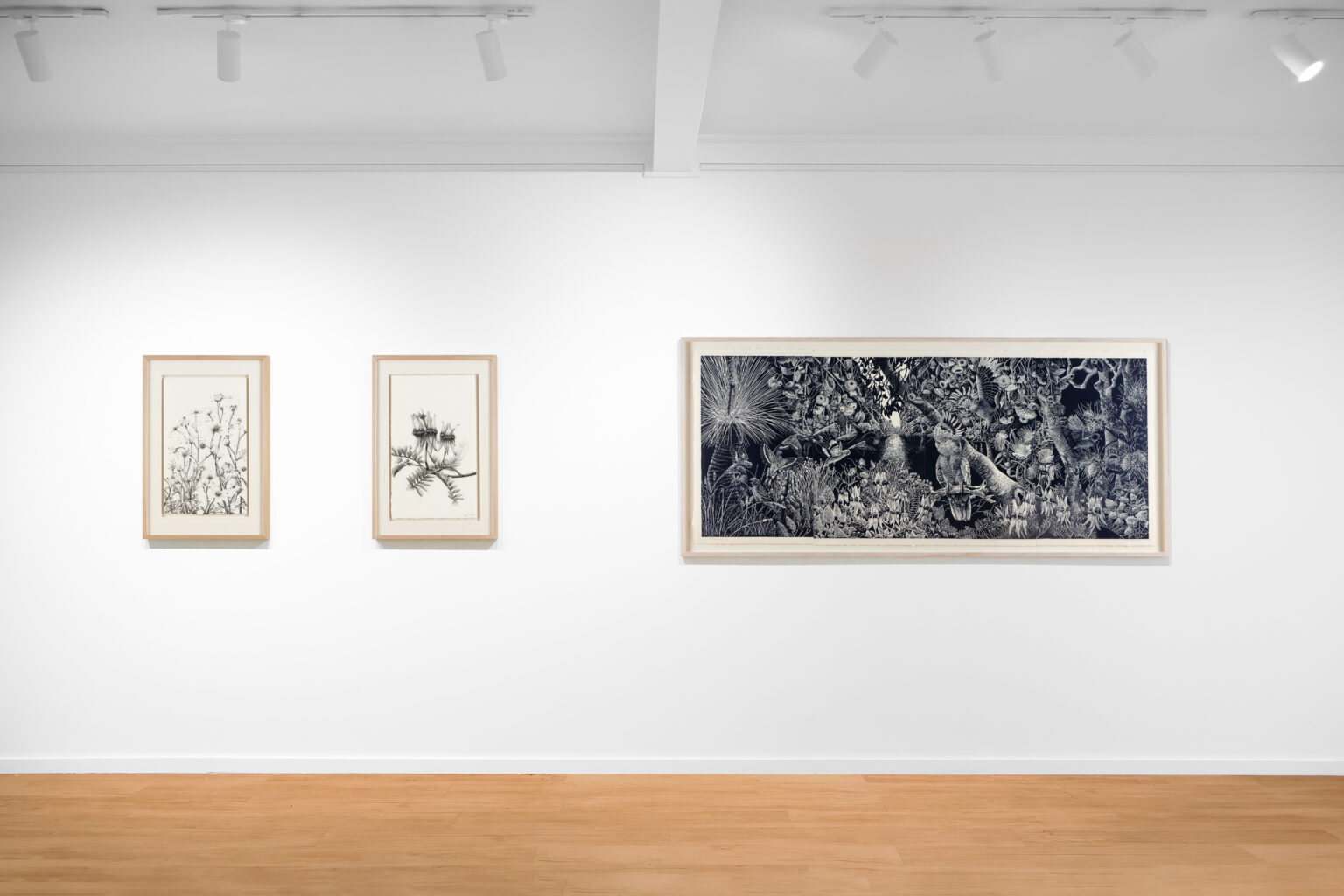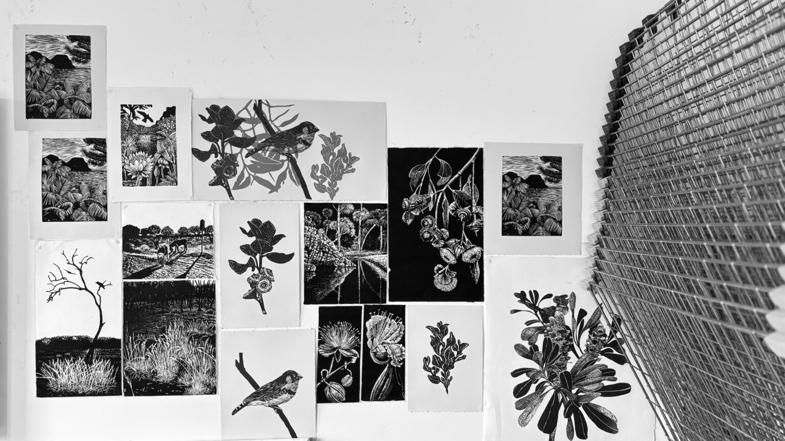 Her latest works were shaped after travelling through Central Australia, where studies of flora and topography became the foundation for these intricate, reimagined terrains — rolled by hand in Prussian blue ink onto fine Japanese paper. Once a photographer, West brings the same attuned sense of light and structure to her printmaking, carving for months to reveal flora and birdlife in astonishing detail. The result cements her as one of the foremost printmakers working in Australia today.