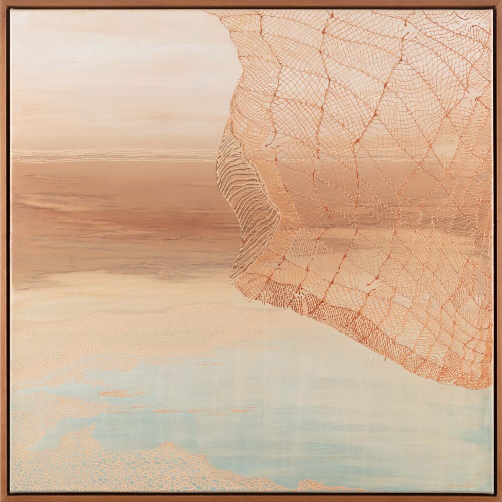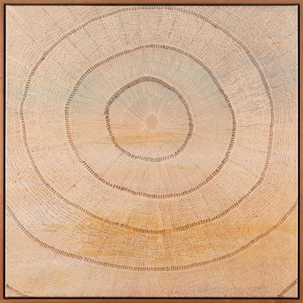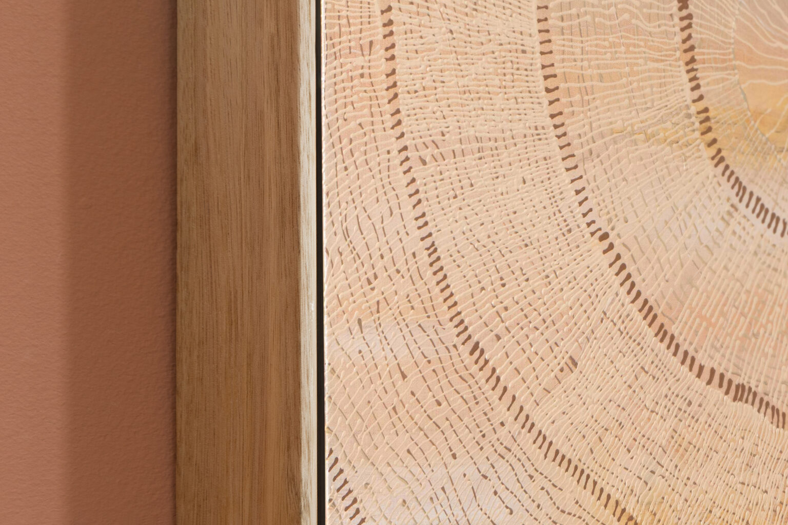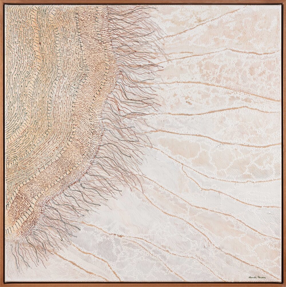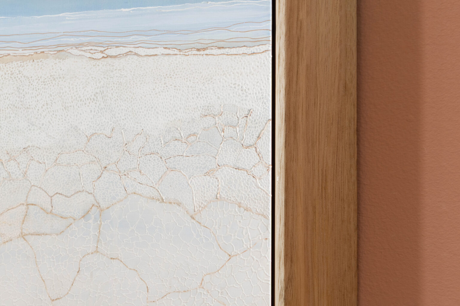 Miranda Hampson, an Anaiwan artist practising on Dharawal Country, follows her sold-out Lookaftering collection with new paintings that continue her exploration of Country and kin. Working in part with ochre sourced with permission from Elders, she creates pared-back compositions that hover between map and memory. Across their surfaces, fine lines recall the weave of baskets, while cracked and layered forms evoke salt plains and dry riverbeds — landscapes marked by endurance, history, and care.