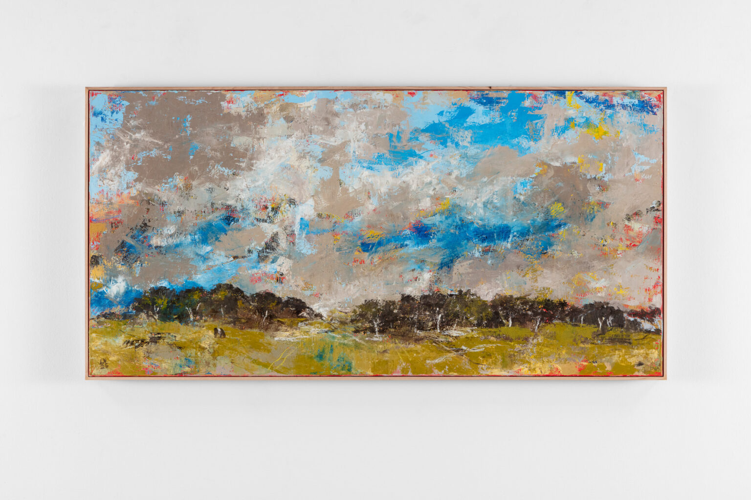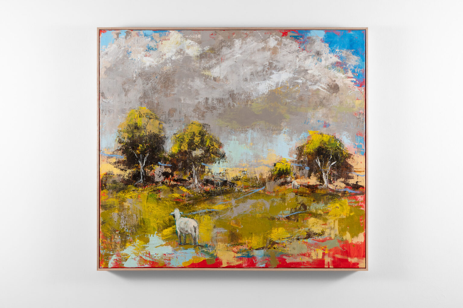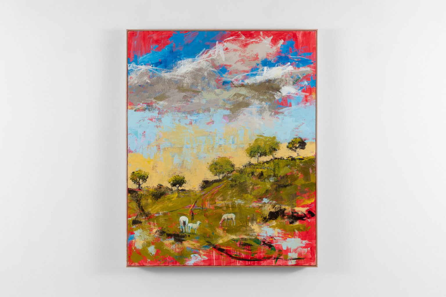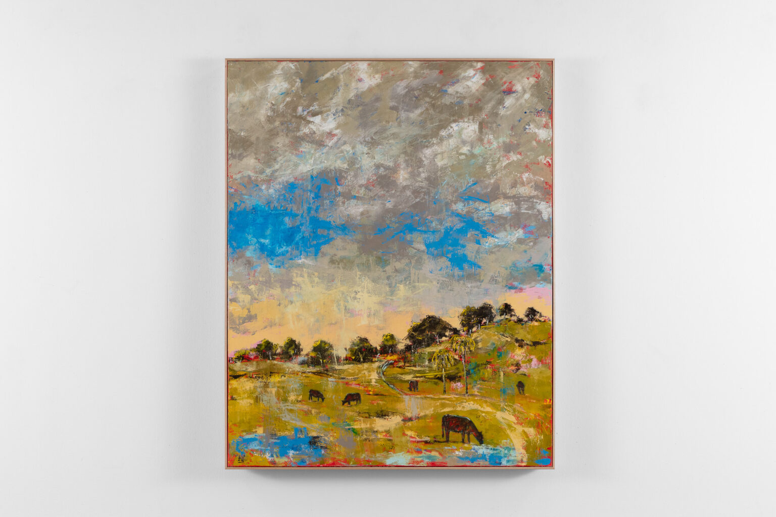 In this latest body of work, the Northern Rivers-based painter deepens her iconoclastic approach to the pastoral tradition. Weather Report gathers landscapes that seem to roil with shifting skies, rain-washed light, and sudden bursts of colour. Fields and paddocks stretch into distance, yet beneath their bucolic calm, Vader coaxes forth surges of painterly energy: skies dissolving into painterly abstraction, horizons blurred in atmospheric veils, unexpected eruptions of yellow, blue, and pink coursing through the scene like weather systems of their own.