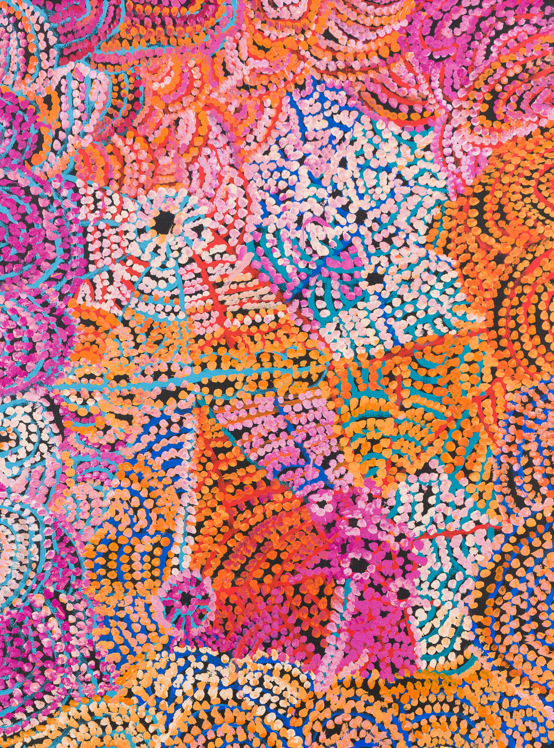 Emily’s latest works, titled ‘Ananyi gura – Travelling Country’, are a beautiful tribute to her early years. They are inspired by memories of travelling vast distances on foot across the APY Lands with her family. As she paints, she shares stories of the old ways, of a time when there were no cars, and people lived barefoot, travelling around the bush to collect food and hunt for game.