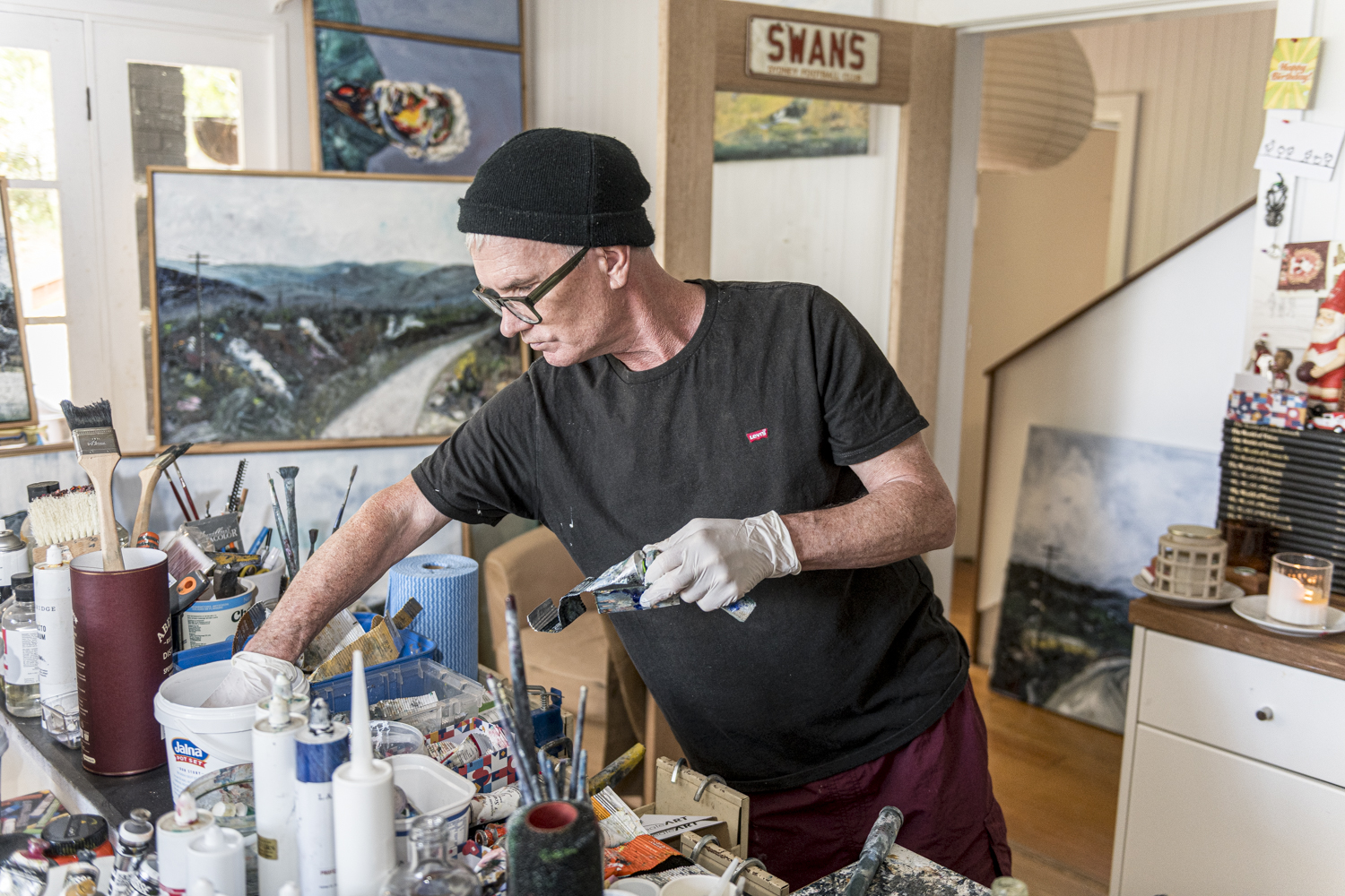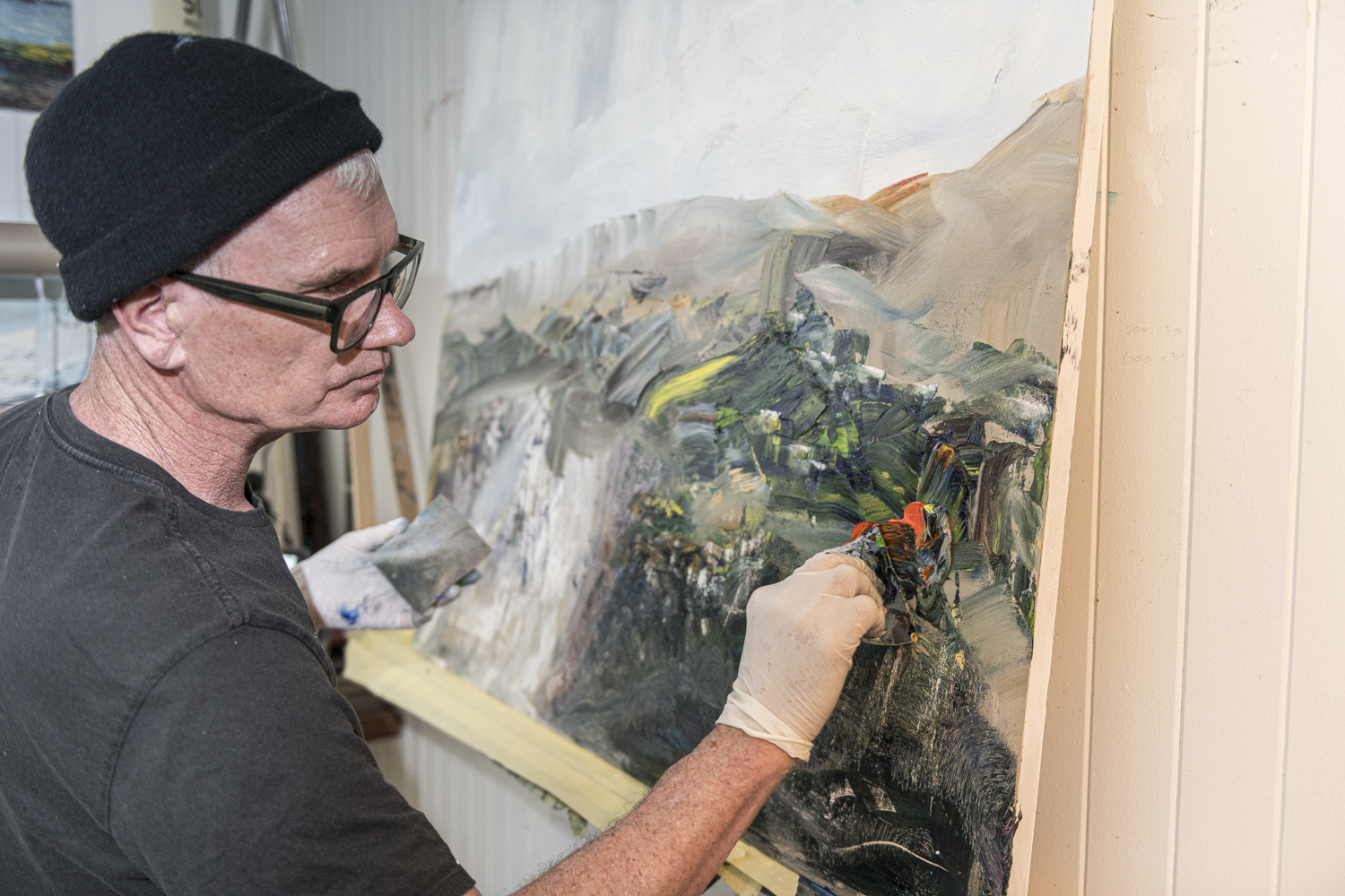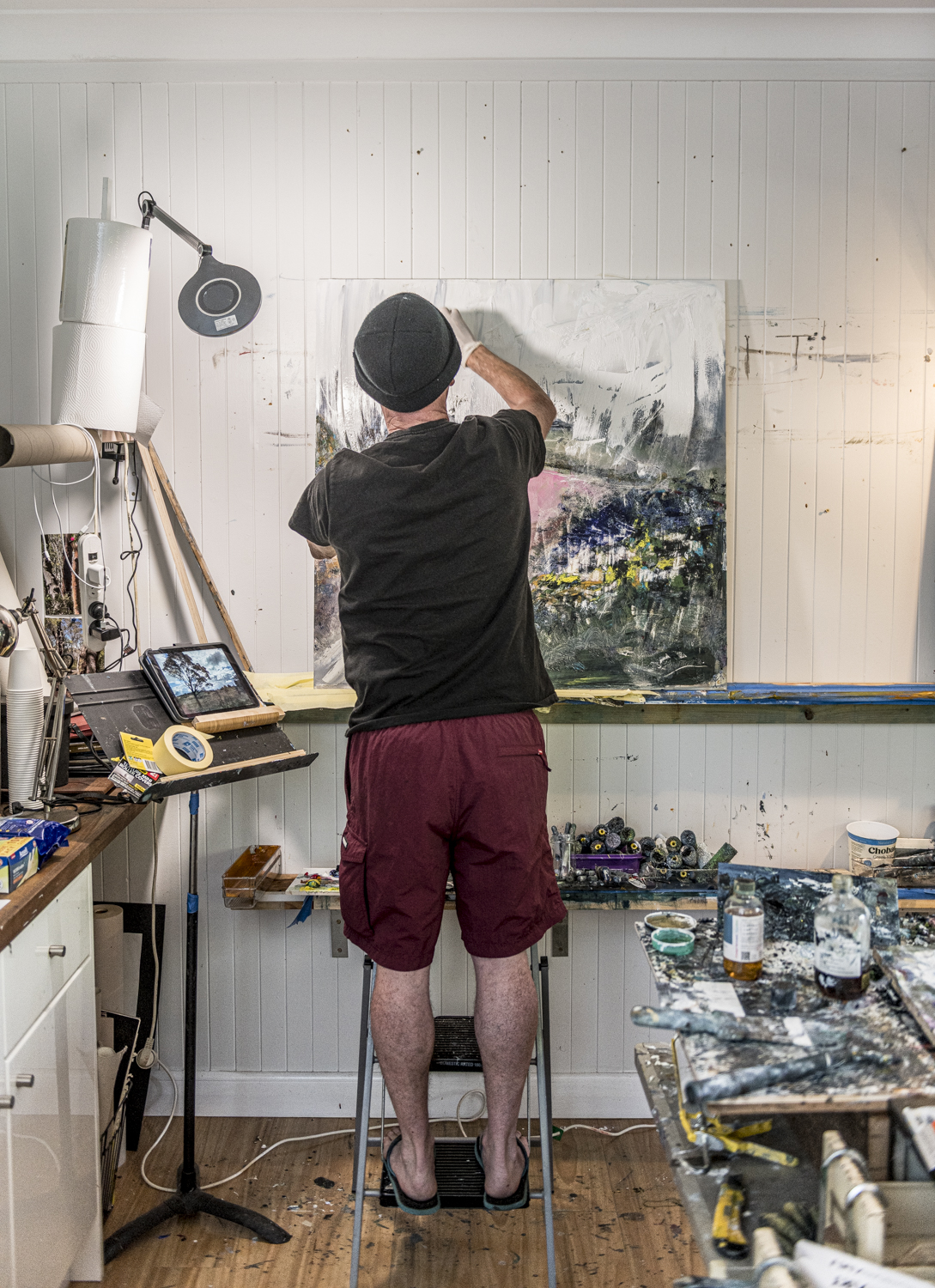 David King’s studio is crowded but not chaotic: a workbench dense with rollers, chisels, scourers, glue guns; canvases leaning against the walls like half-formed thoughts; and, everywhere, the smell of wet oil paint lifting off the surface in faint sweet vapours. In one corner, a nearly finished landscape — all scraped-back sky and telegraph poles — waits for its next intervention. In another, a pile of rags has been pressed into service as an impromptu palette.