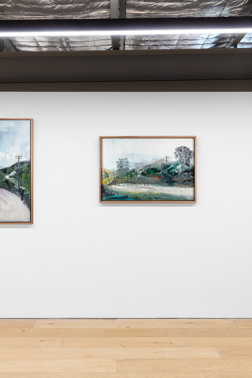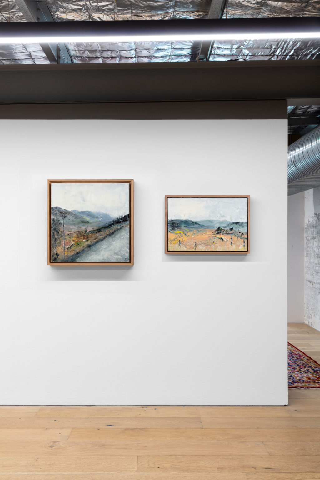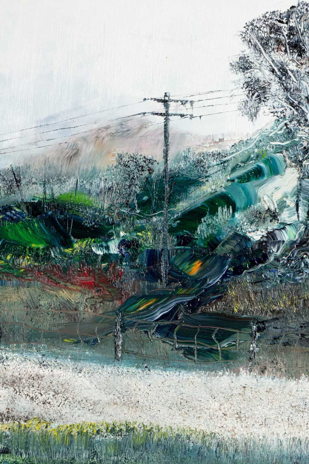 The scenes King has painted for his debut solo collection, Lines on the Landscape — opening soon in the Top Floor Gallery — travel widely: the Illawarra escarpment, the Central Tablelands, the edges of Goulburn, Orford’s pale fields, and the misted greens of Ireland. Yet his subject is not geography. “I see the same things everywhere,” he says. “Ireland, Tasmania, the Tablelands — fences, gates, telegraph poles. They join all these places.”
