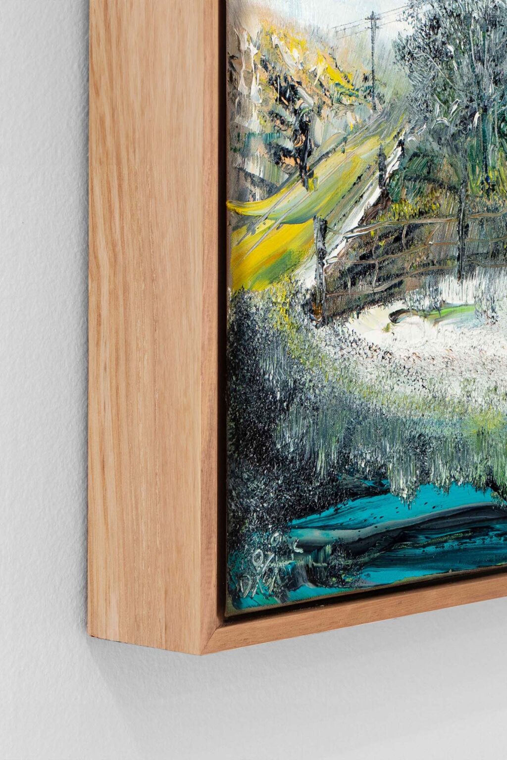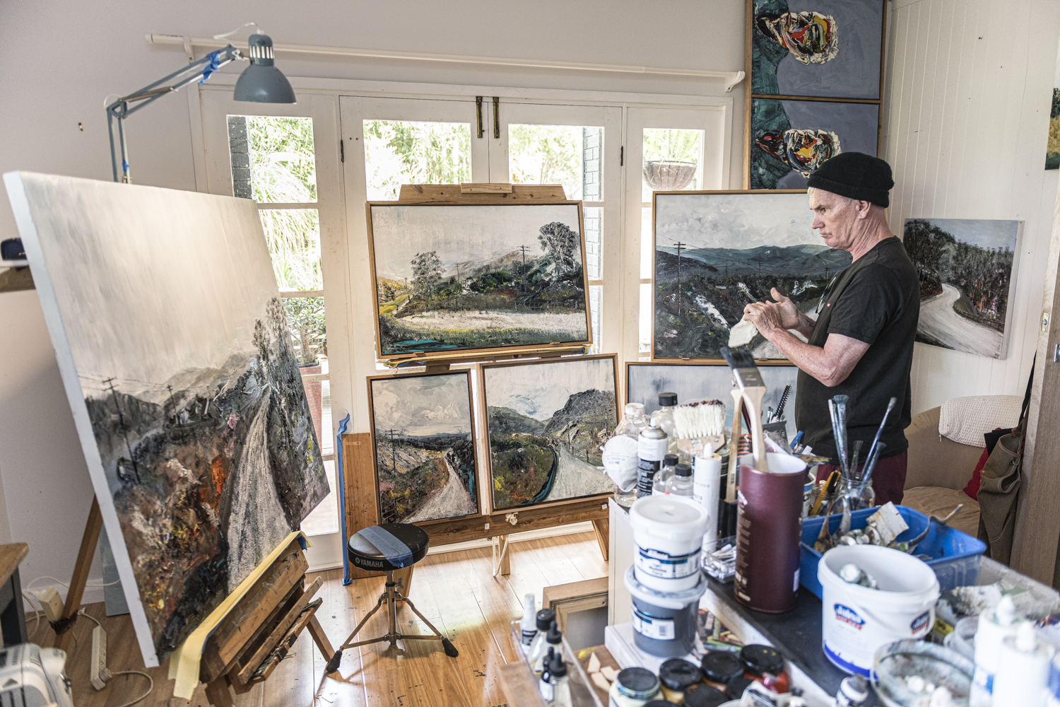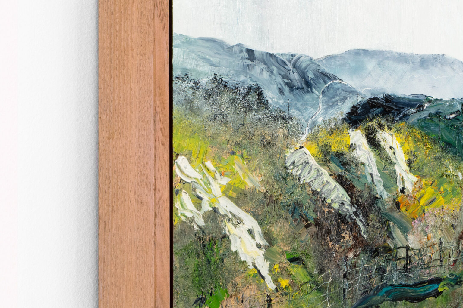 The scenes King has painted for his debut solo collection, Lines on the Landscape — opening soon in the Top Floor Gallery — travel widely: the Illawarra escarpment, the Central Tablelands, the edges of Goulburn, Orford’s pale fields, and the misted greens of Ireland. Yet his subject is not geography. “I see the same things everywhere,” he says. “Ireland, Tasmania, the Tablelands — fences, gates, telegraph poles. They join all these places.”