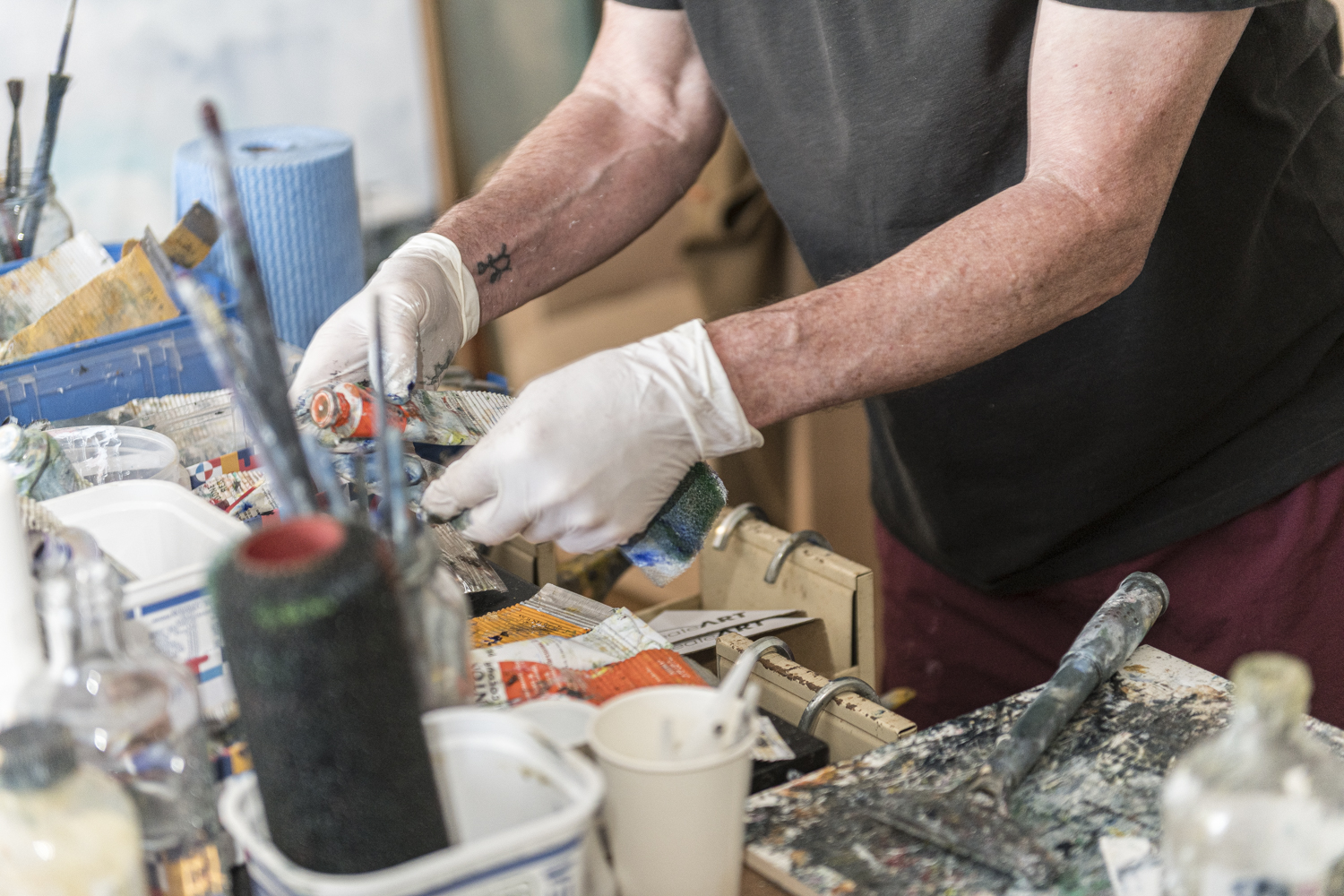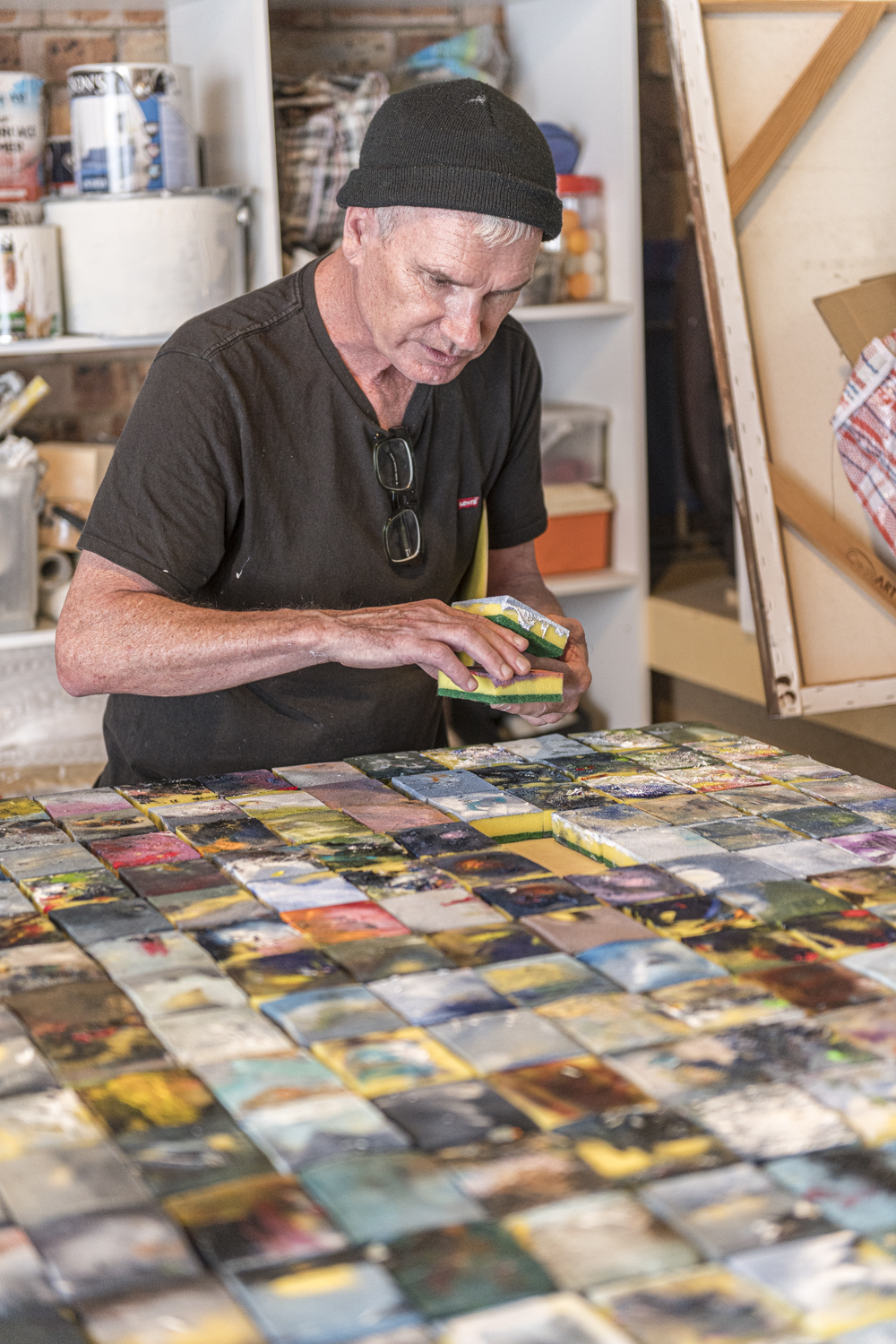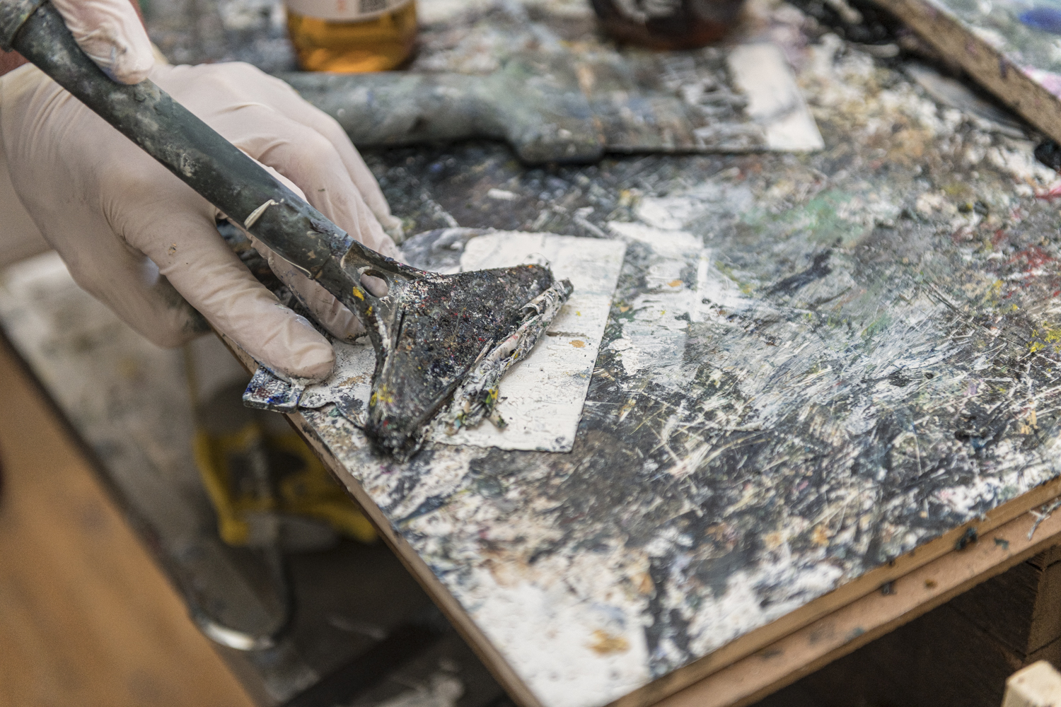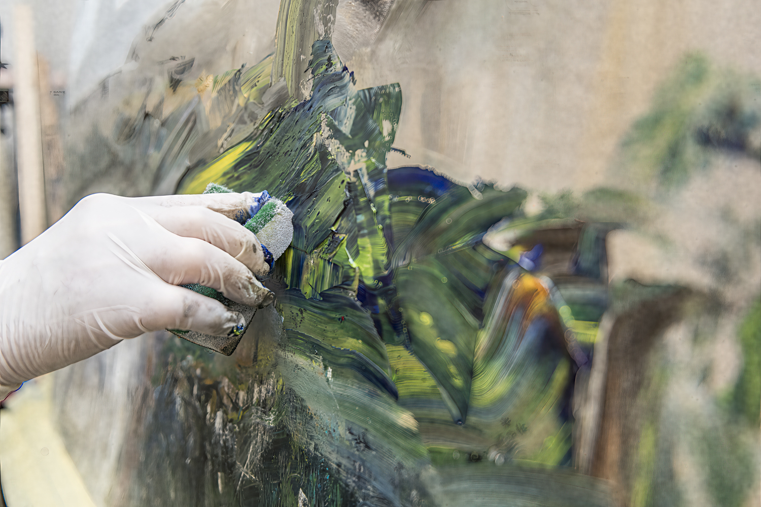 The artist’s method is deeply physical. “I use anything — a scourer, a piece of card, a chisel,” he says. Brushes have largely disappeared from his practice. His preferred tool is a sponge, which he presses into the paint and drags in long, shearing movements that leave ridges, ruts, and sudden clearings. Working on board gives him licence to scrape back without hesitation, taking out whole passages in the knowledge that the surface won’t give way.