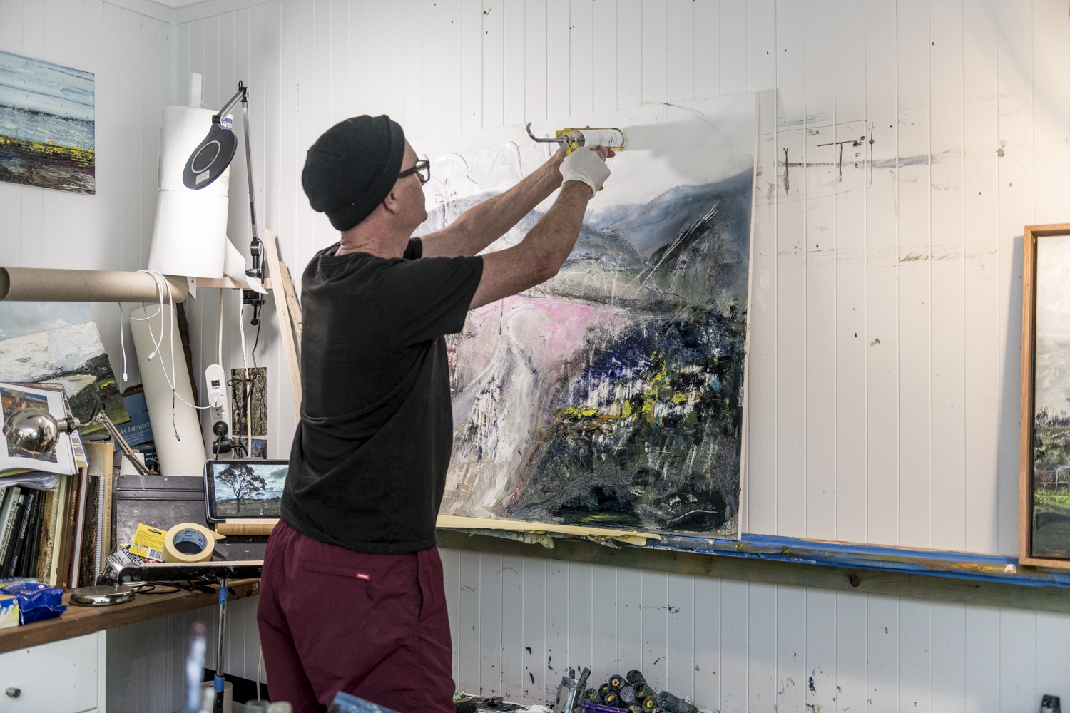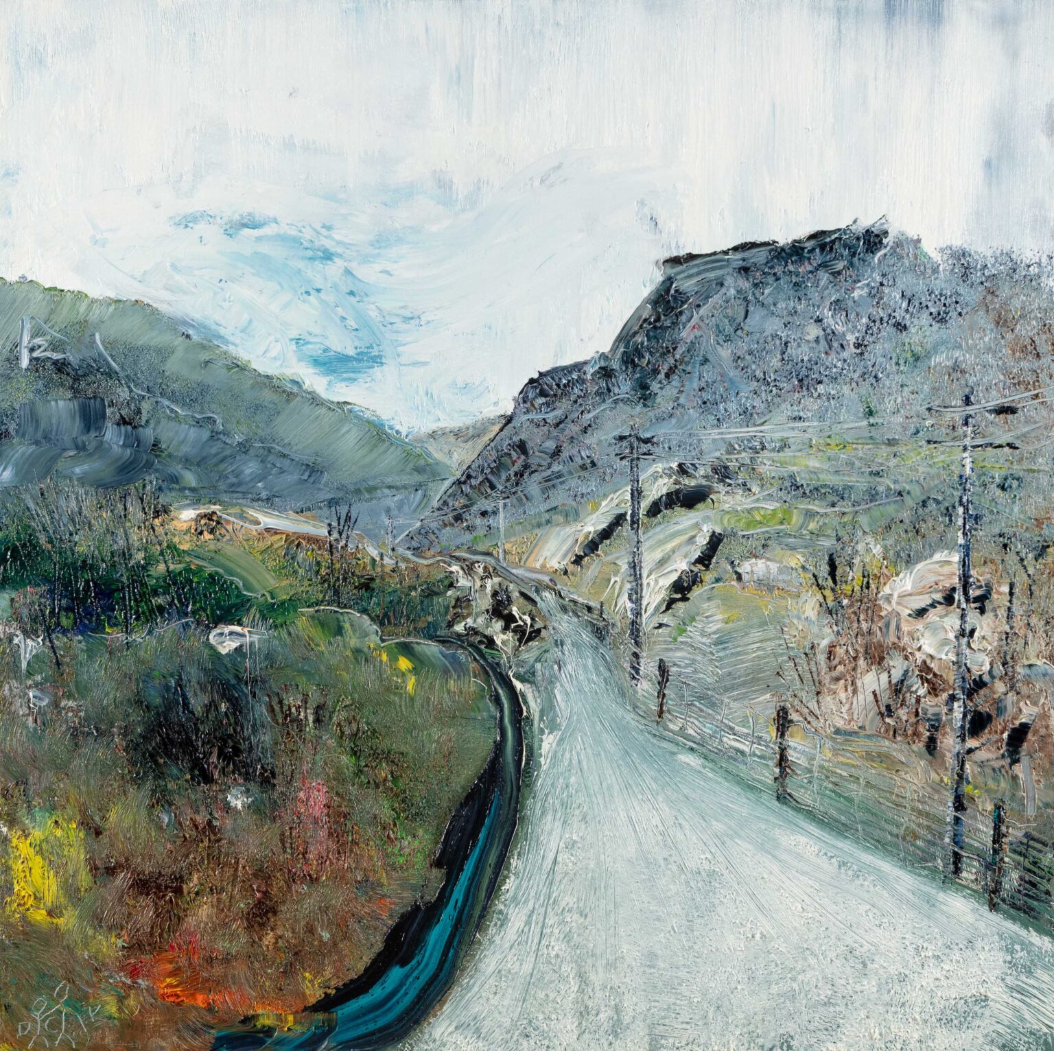 King’s relationship to landscape is also shaped by a lifetime of looking, travelling, comparing. He photographs constantly. Back in the studio, he zooms in on each image, scanning for the thing that “catches” — not beauty, but some stray structural or emotional charge that suggests a painting might be possible. “You’re not 100% sure until you start,” he says. And once he starts, the photograph is discarded. The painting becomes an argument with the surface, not a record of the view.
